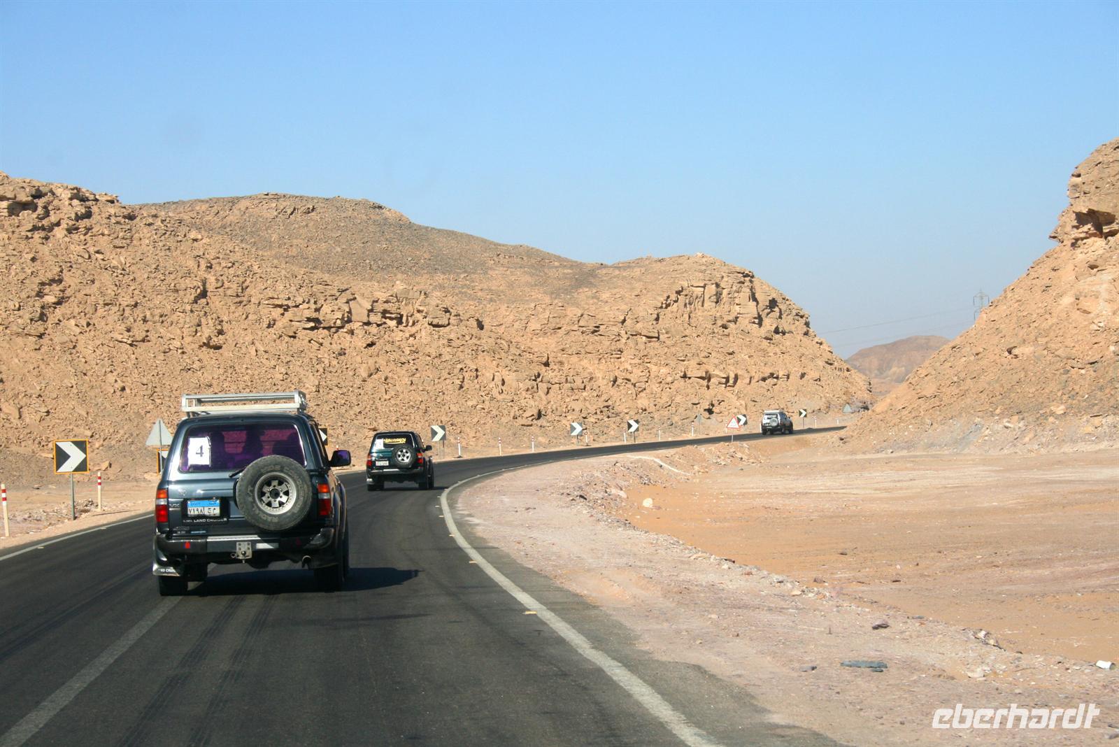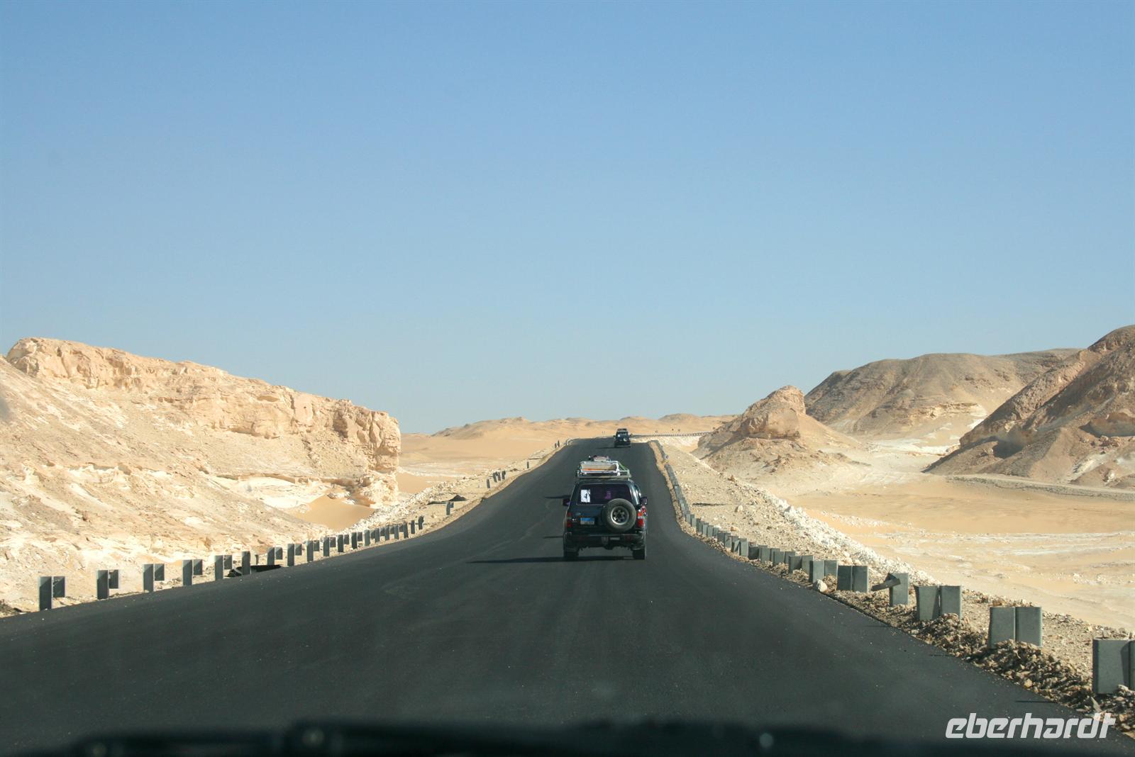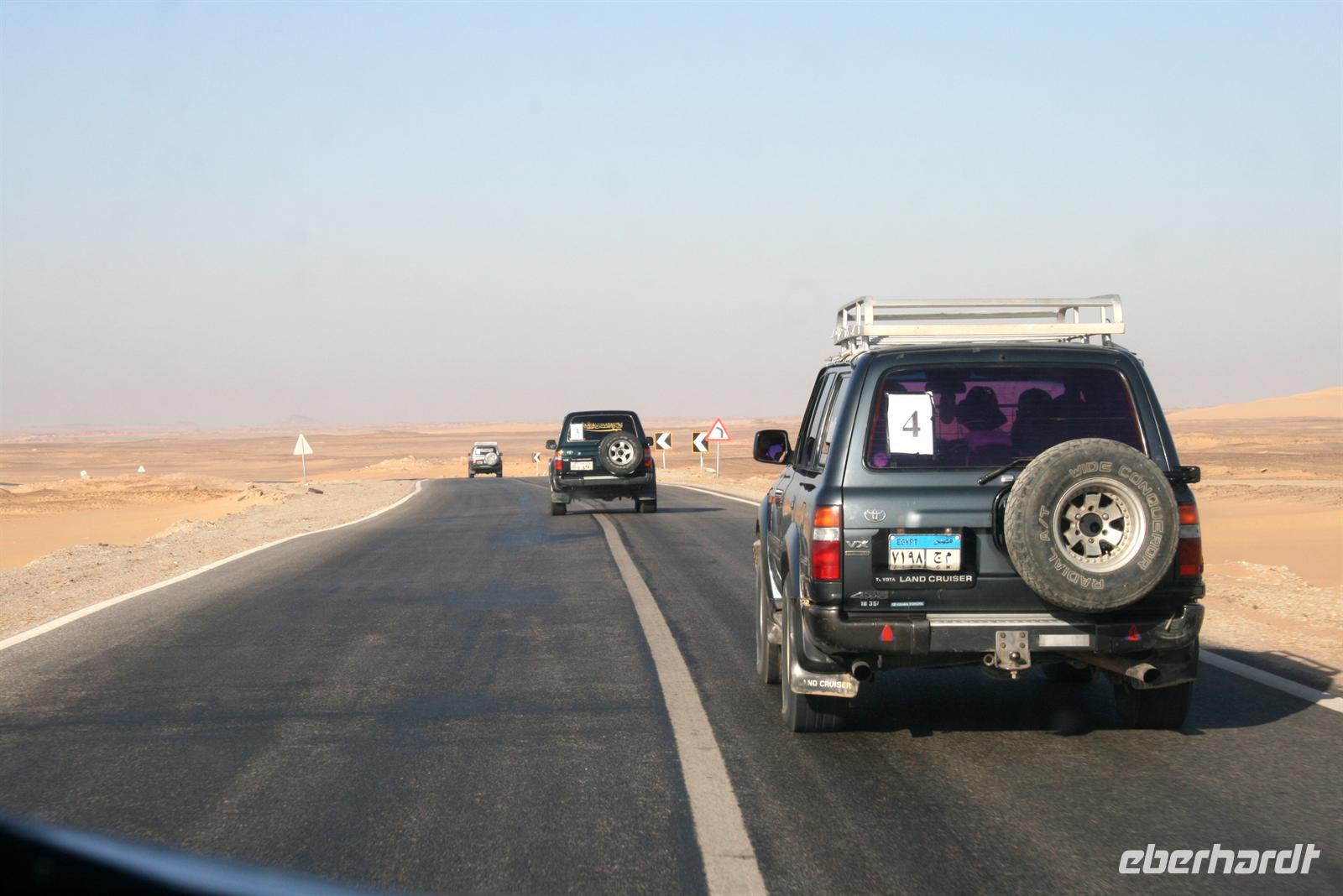 Nach dem Frühstück an Bord verlassen wir unser Kreuzfahrtschiff und steigen in unseren modernen Reisebus um. Jetzt geht es los in die ägyptische Wüste, die genauer gesagt Libysche Wüste heißt. Die Etappe bis zur ersten Oase namens Kharga reisen wir noch mit dem Bus, denn wir bewegen uns heute nur auf der asphaltierten Straße. Wir werden den ganzen Tag von einem Auto der Touristen-Polizei begleitet und passieren viele Kontrollstellen an der Wüstenstraße. Sicherheit wird hier von den ägyptischen Behörden wirklich groß geschrieben.