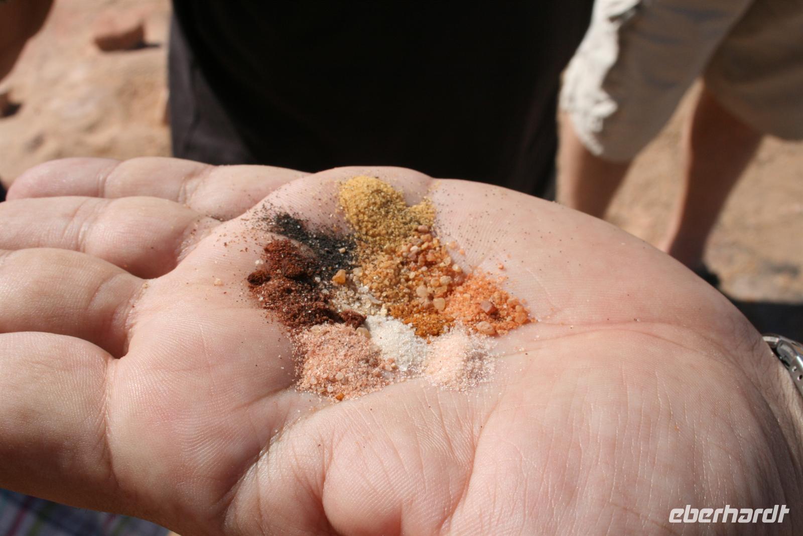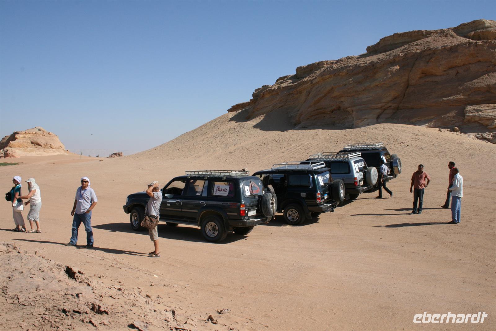 Heute beginnt unsere Jeeptour durch die Wüste. Je drei oder vier Gäste fahren in einem Jeep. Insgesamt haben wir für unsere Gruppe fünf Jeeps mit je einem erfahrenen Fahrer. Aladin fährt im ersten Jeep mit und ich als Reisebegleiterin bilde die Nachhut im letzten Wagen. Auch ein Polizist ist mit uns unterwegs. Das Gepäck wird im Kofferraum verstaut und für alle ist genügend Mineralwasser in den Autos. Unsere kleine Jeep-Karawane setzt sich in Bewegung. Unser erstes Ziel ist die Oase Dakhla. Unterwegs machen wir aber noch einen Stopp am „Kamel-Felsen“, eine Felsformation aus Sandstein, die aussieht wie ein liegendes Kamel. Aladin zeigt uns unglaubliche neun verschiedenfarbige Sandarten von schwarzem über gelben, orangen und roten bis zu weißem Sand. Wir gelangen zur Oase Dakhla.