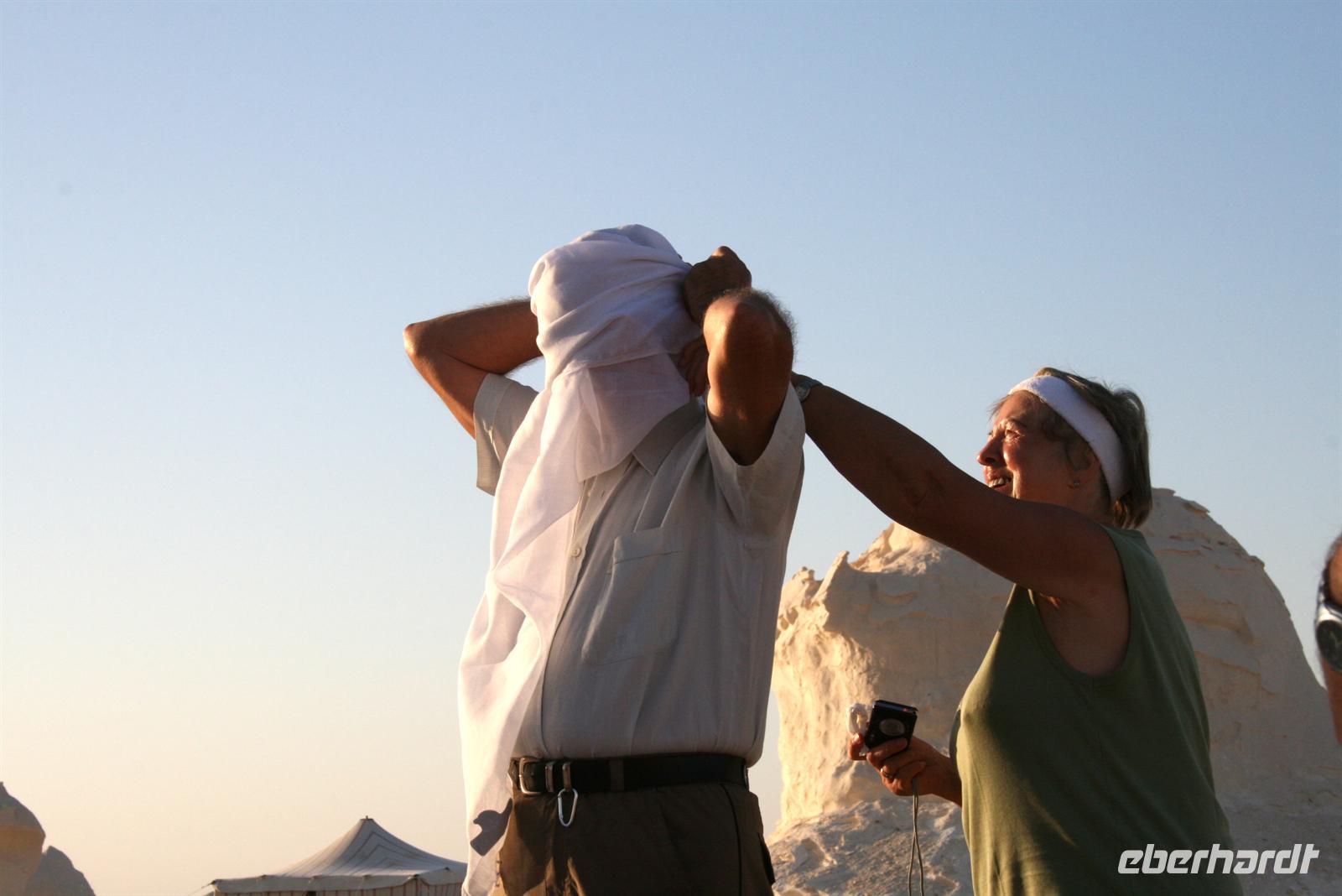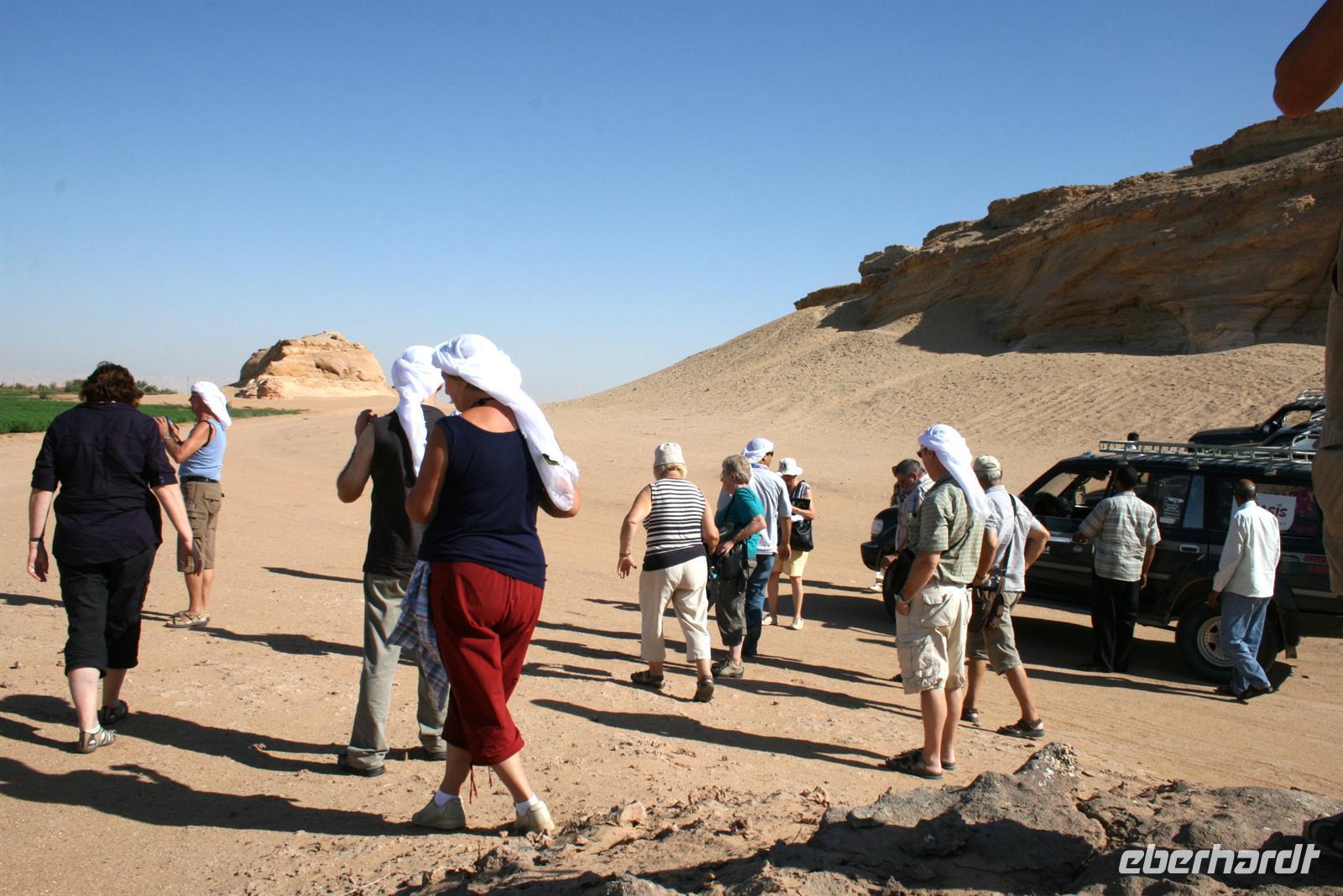 Am späten Nachmittag erwarten uns zum ersten Mal unsere Jeeps. Wir fahren auf eine Anhöhe oberhalb des Ortes, um den Sonnenuntergang zu bewundern. Aladin überrascht uns mit einem Geschenk - einem weißen, leichten Kopftuch für jeden. Natürlich wird es uns gleich in traditioneller Form um den Kopf gebunden und wir haben eine Menge Spaß. Ein Gruppenbild mit unserer neuen Kopfbedeckung darf da nicht fehlen. Nachdem wir den zügigen Sonnenuntergang genossen haben, werden wir mit den Jeeps in die Stadt gefahren und unternehmen einen kleinen Bummel entlang der Marktstraße. Nach einem erlebnisreichen Tag und nach dem Abend-Buffet im Hotel fallen wir in unsere Betten.