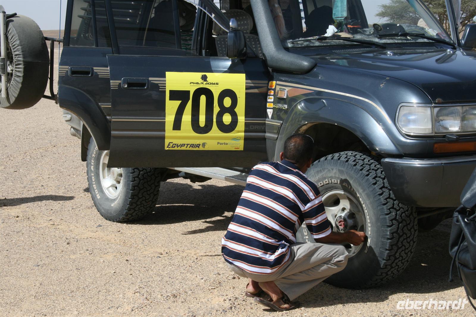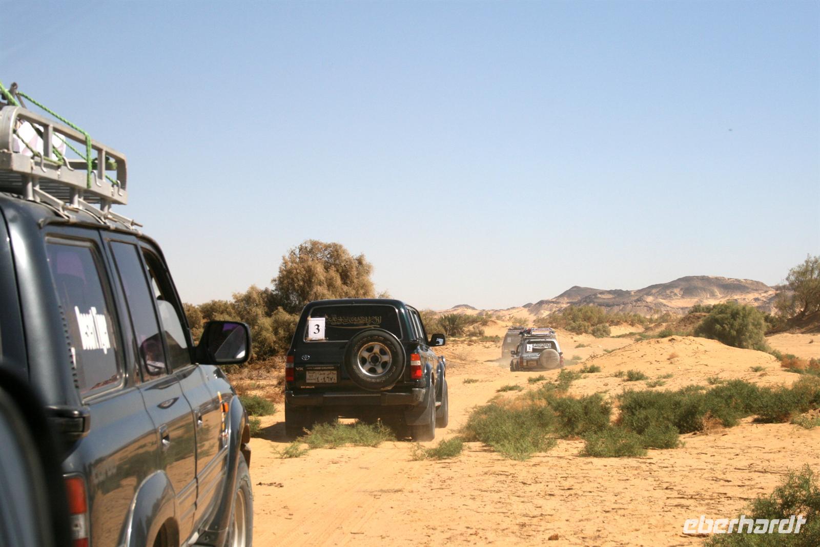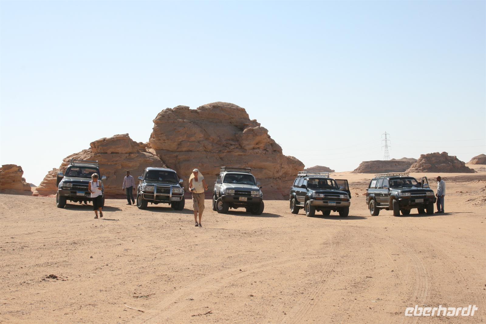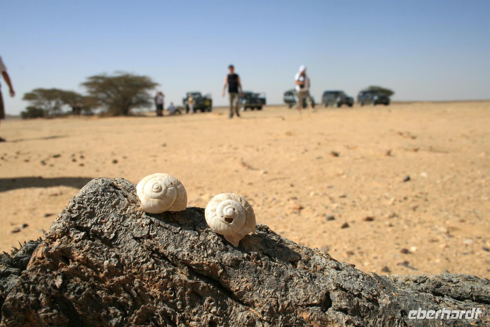 Früh um 6 Uhr packen wir erneut unsere Koffer in die Jeeps und starten nach dem Frühstück im Hotel unsere Tagesetappe in Richtung Norden. Zunächst entlang der Straße mit einem Stopp an einem Rasthof biegen wir bald wieder ab hinein in die Sandwüste. Gegen 9 Uhr erreichen wir eine Ebene, die vor einigen Jahrzehnten noch von einem ehemaligen Zufluss des Nils überflutet war. Hier stehen bis heute noch ein paar Dornenbüsche und Bäume und man findet sogar noch leere Schneckenhäuser, Zeugnisse des einstigen Wasservorkommens.