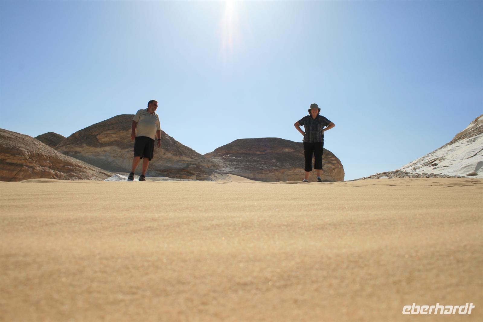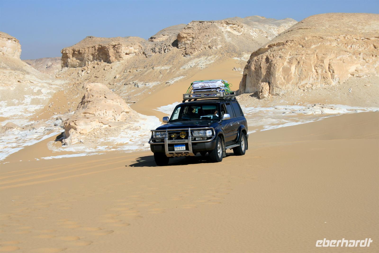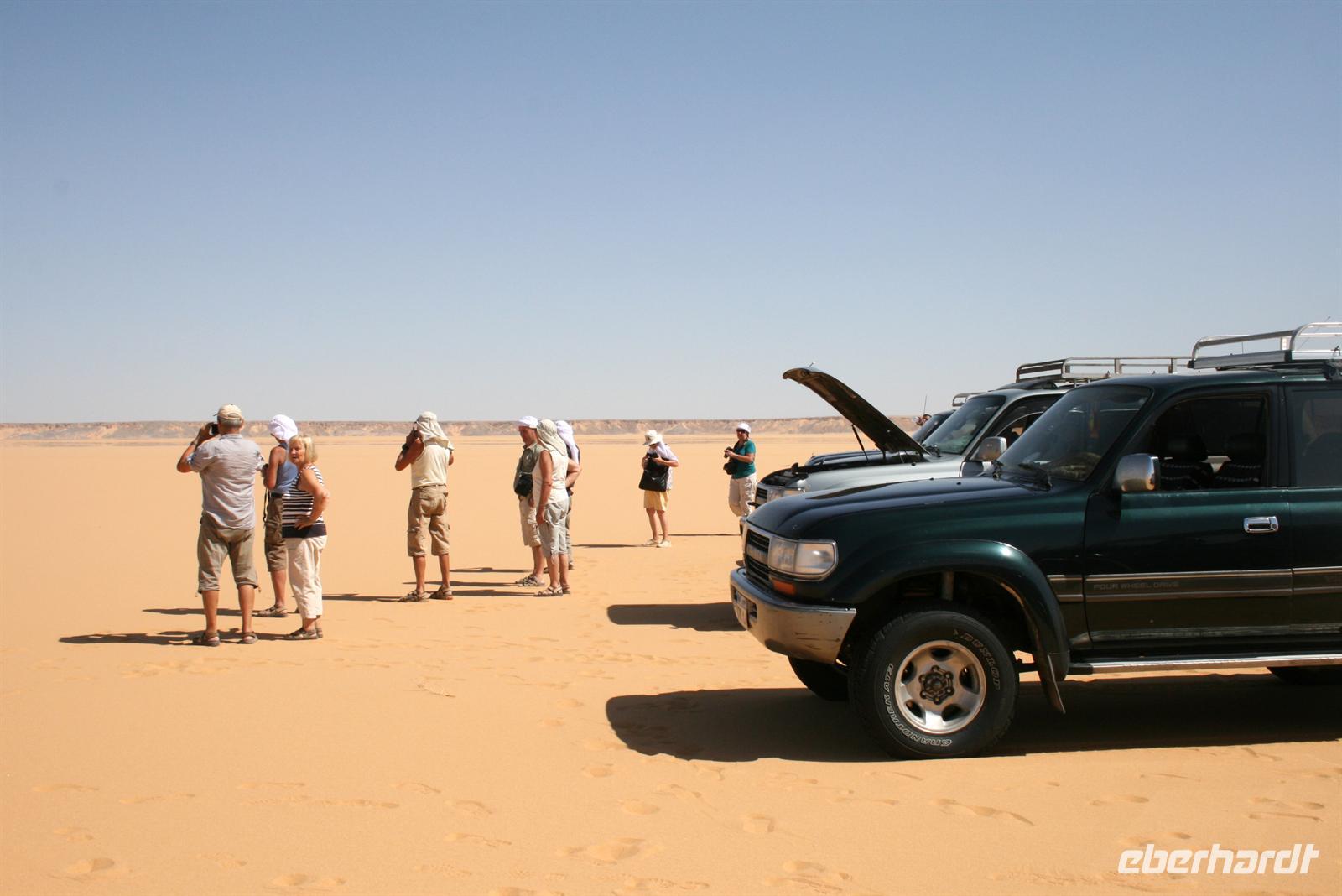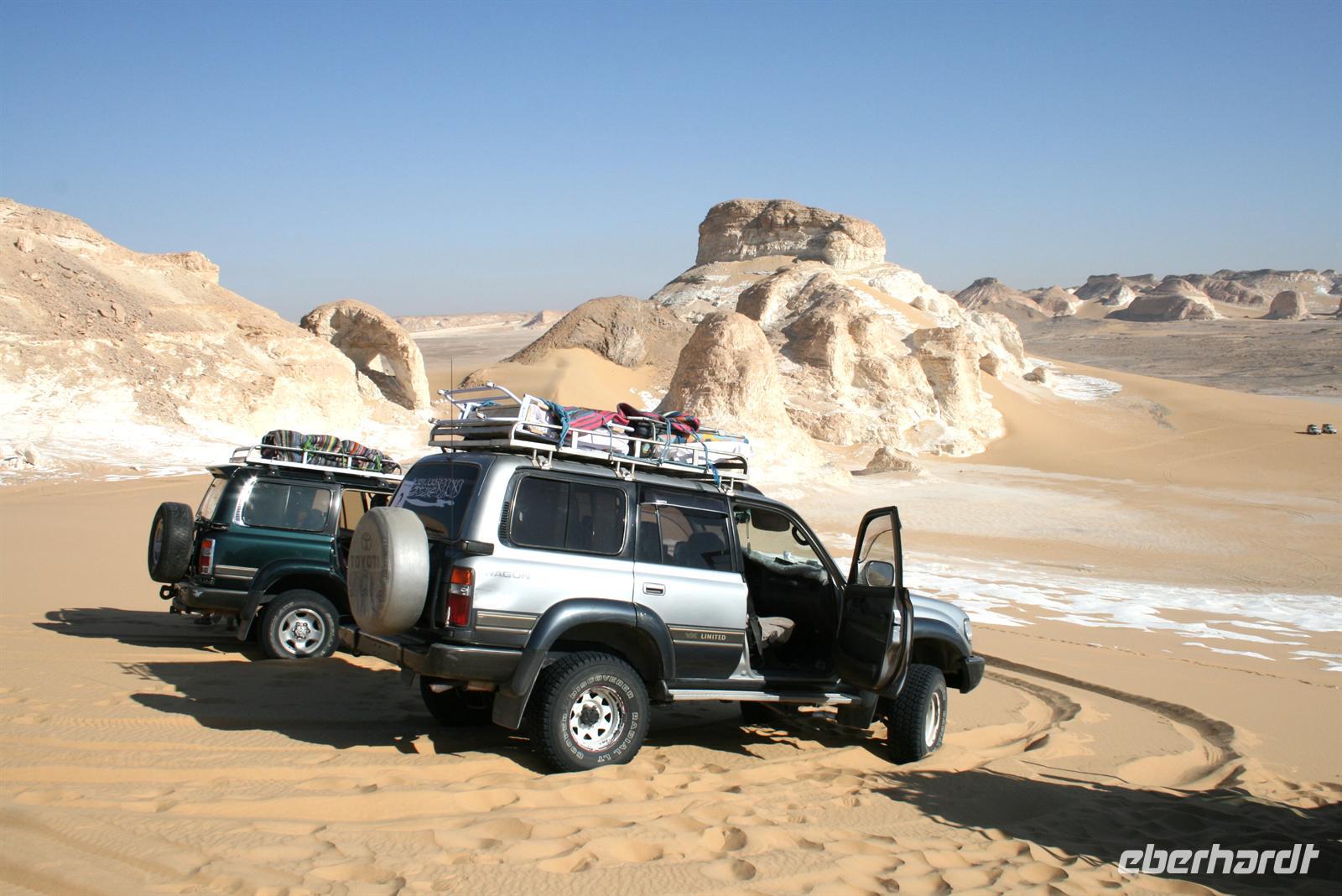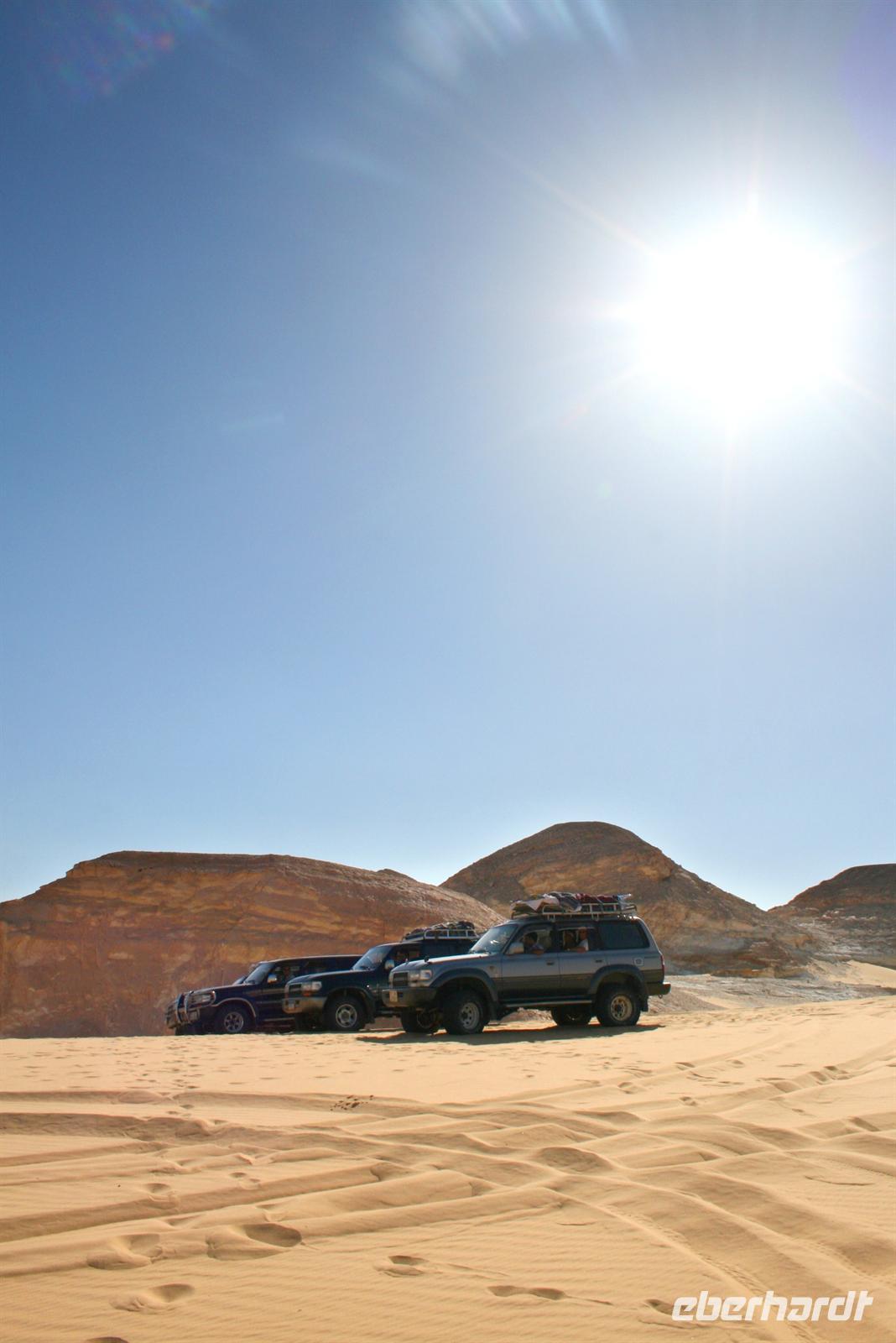 Unsere Jeeptour führt uns weiter. Vor der nächsten Oase Farafra verlassen wir die Asphaltstraße und machen einen Abstecher zum Großen Sandmeer. Hier ist die Wüste sehr flach und besteht nur aus feinem hellen Sand. In der Ferne lässt die heiße Wüstensonne die Sandoberfläche flimmern und spiegeln wie eine Wasserfläche - eine typische Fatamorgana! Nun können die Jeeps einmal zeigen, was sie können, als wir im „Affenzahn“ über das riesige Sandmeer preschen.