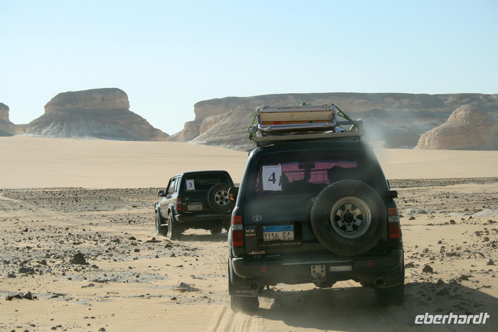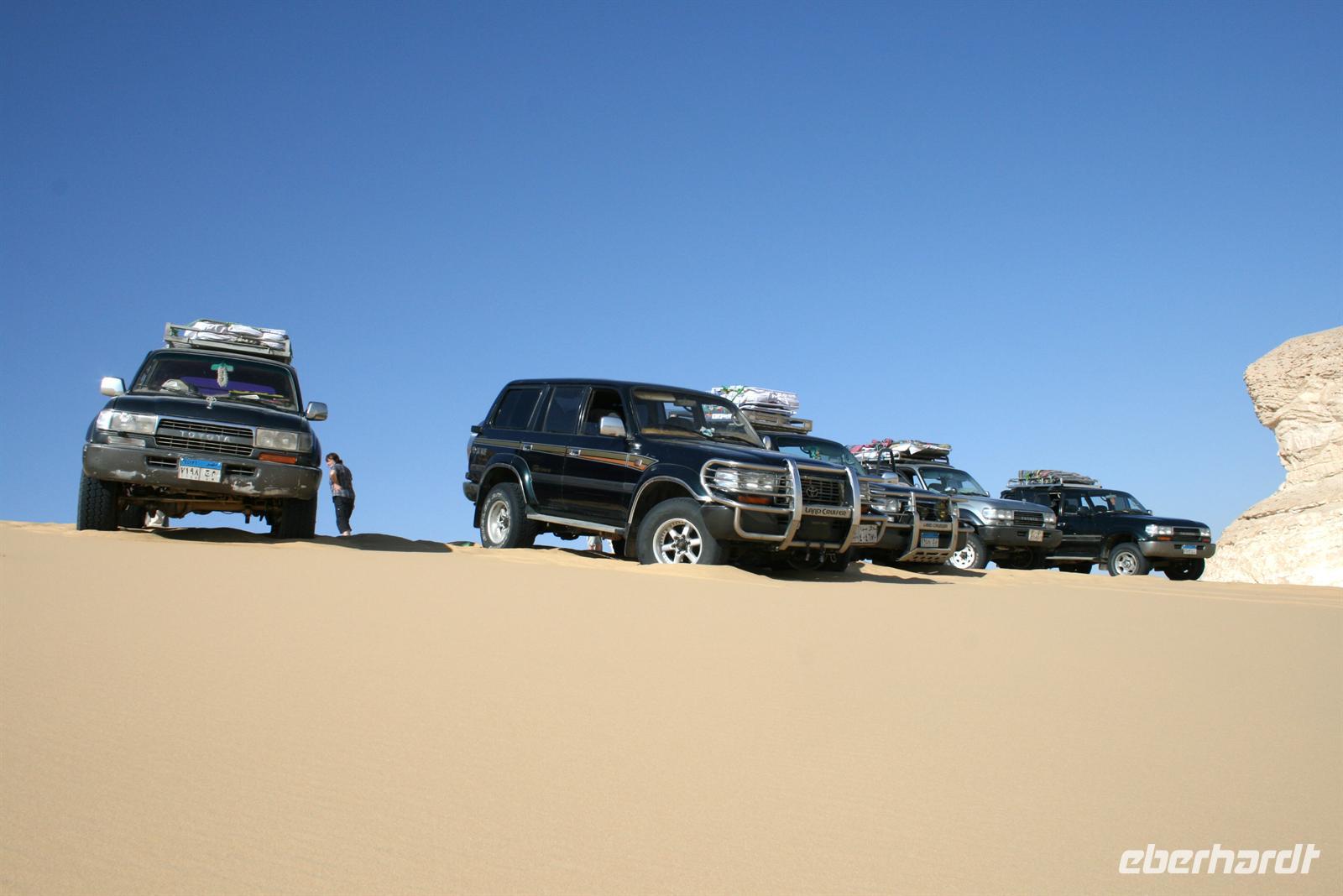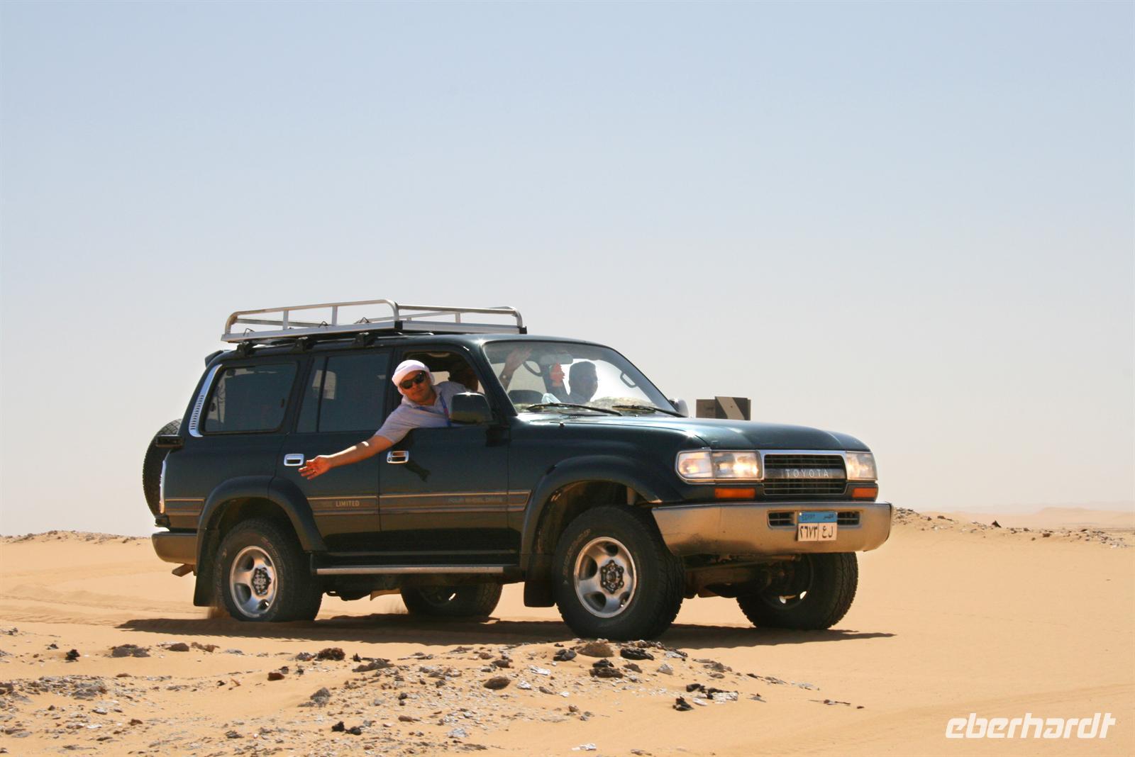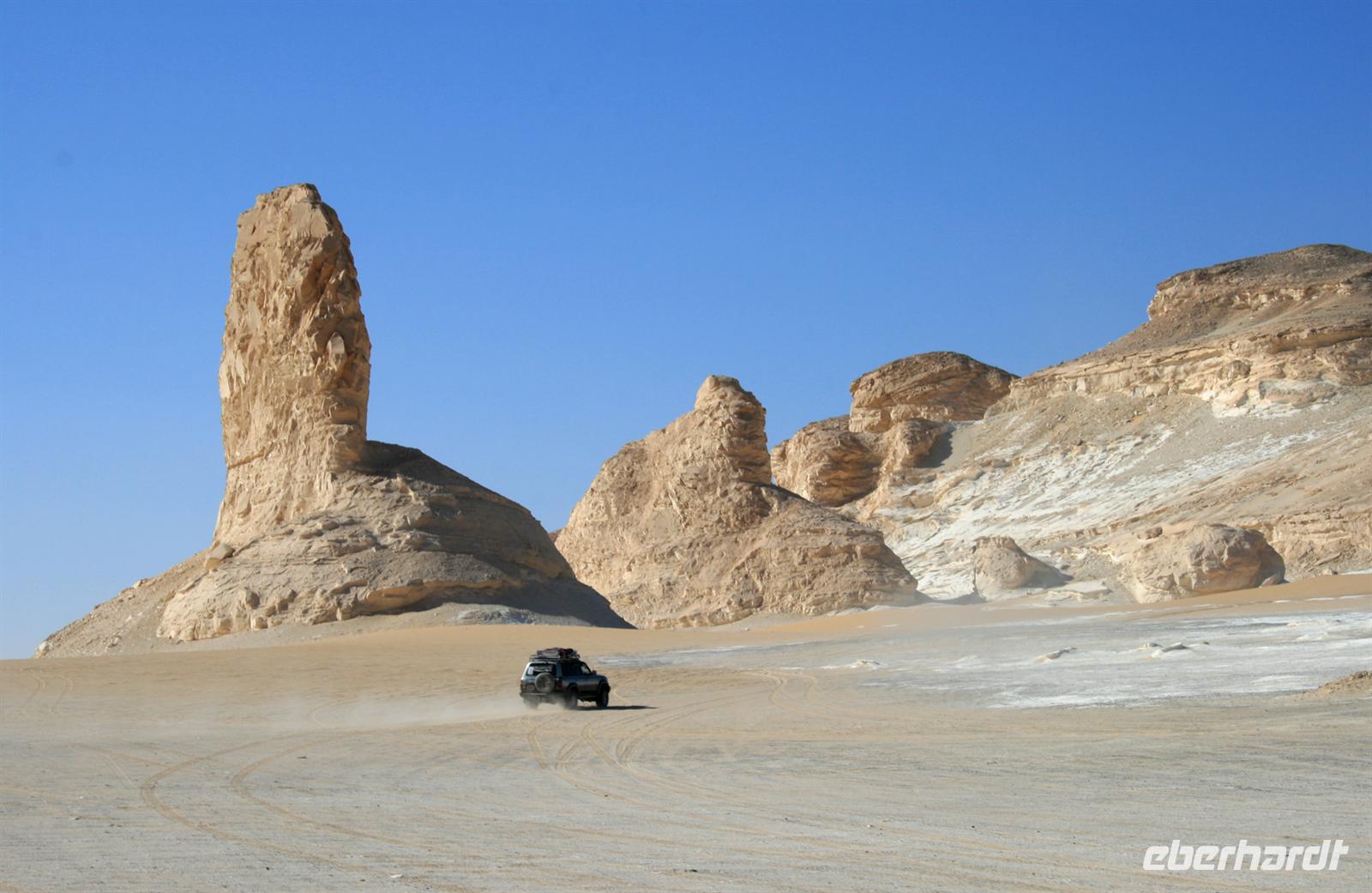 Unsere Jeeptour führt uns weiter. Vor der nächsten Oase Farafra verlassen wir die Asphaltstraße und machen einen Abstecher zum Großen Sandmeer. Hier ist die Wüste sehr flach und besteht nur aus feinem hellen Sand. In der Ferne lässt die heiße Wüstensonne die Sandoberfläche flimmern und spiegeln wie eine Wasserfläche - eine typische Fatamorgana! Nun können die Jeeps einmal zeigen, was sie können, als wir im „Affenzahn“ über das riesige Sandmeer preschen.