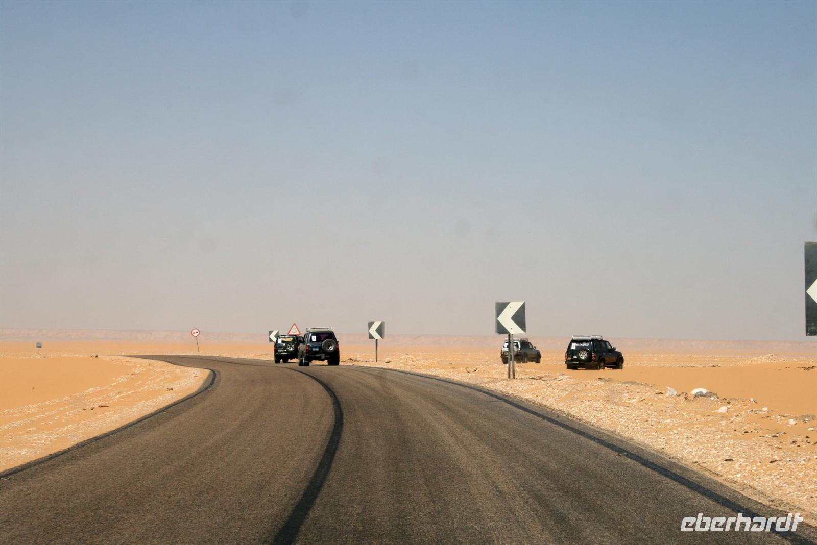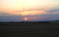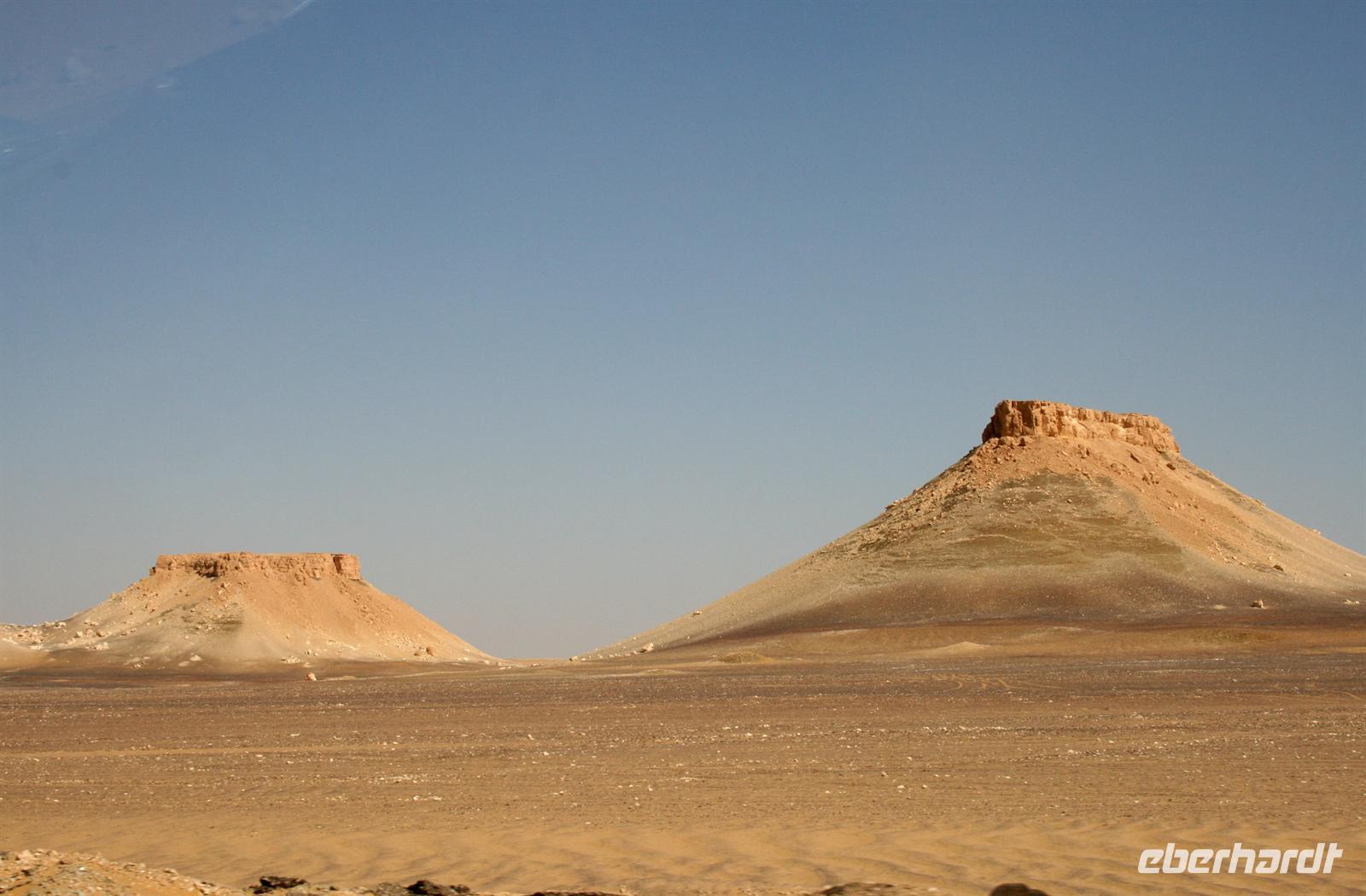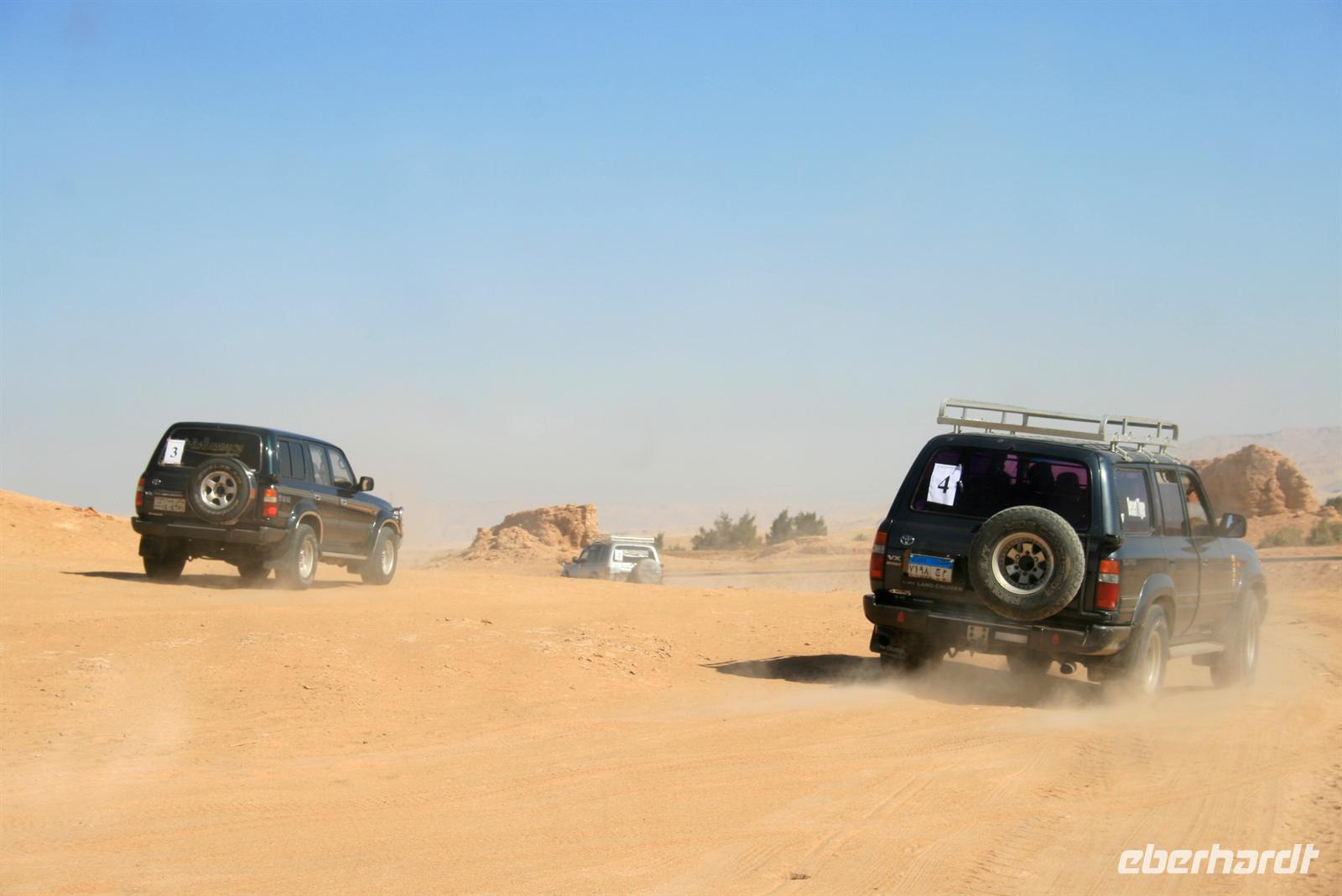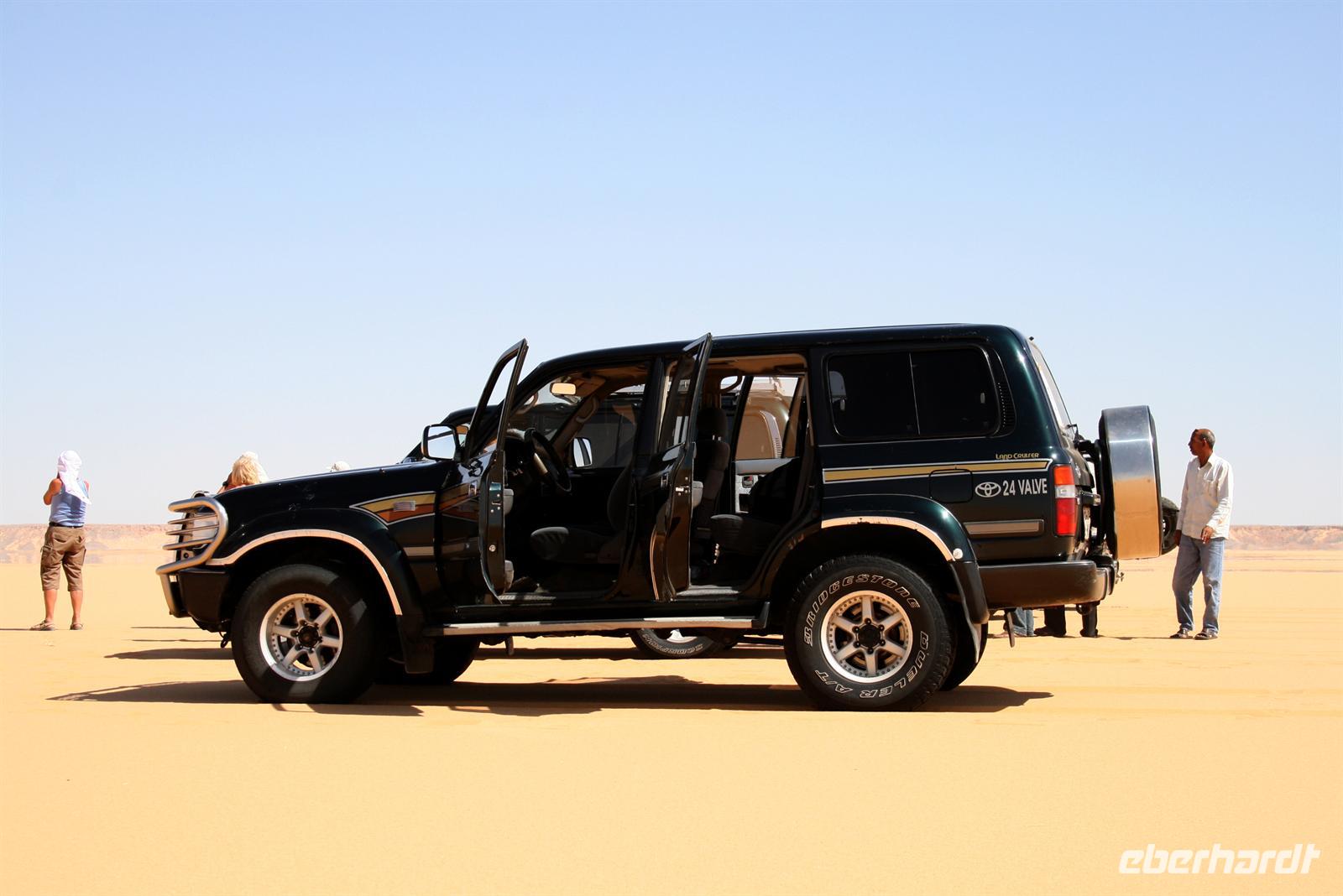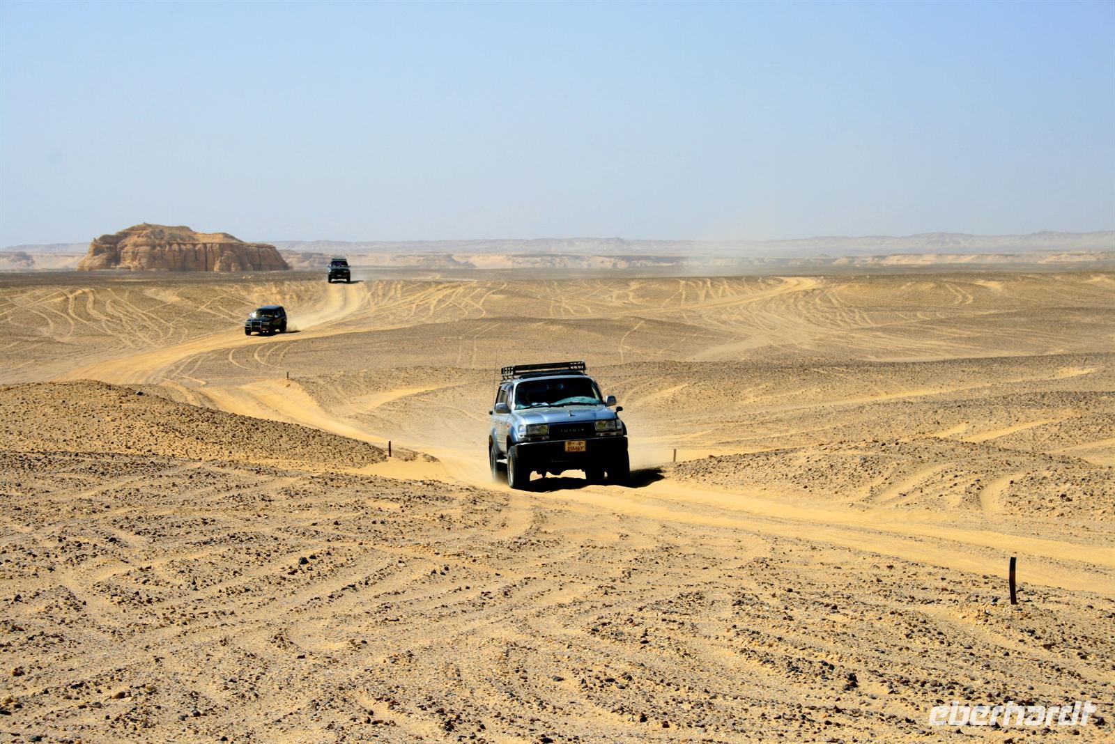 Unsere Jeeptour führt uns weiter. Vor der nächsten Oase Farafra verlassen wir die Asphaltstraße und machen einen Abstecher zum Großen Sandmeer. Hier ist die Wüste sehr flach und besteht nur aus feinem hellen Sand. In der Ferne lässt die heiße Wüstensonne die Sandoberfläche flimmern und spiegeln wie eine Wasserfläche - eine typische Fatamorgana! Nun können die Jeeps einmal zeigen, was sie können, als wir im „Affenzahn“ über das riesige Sandmeer preschen.