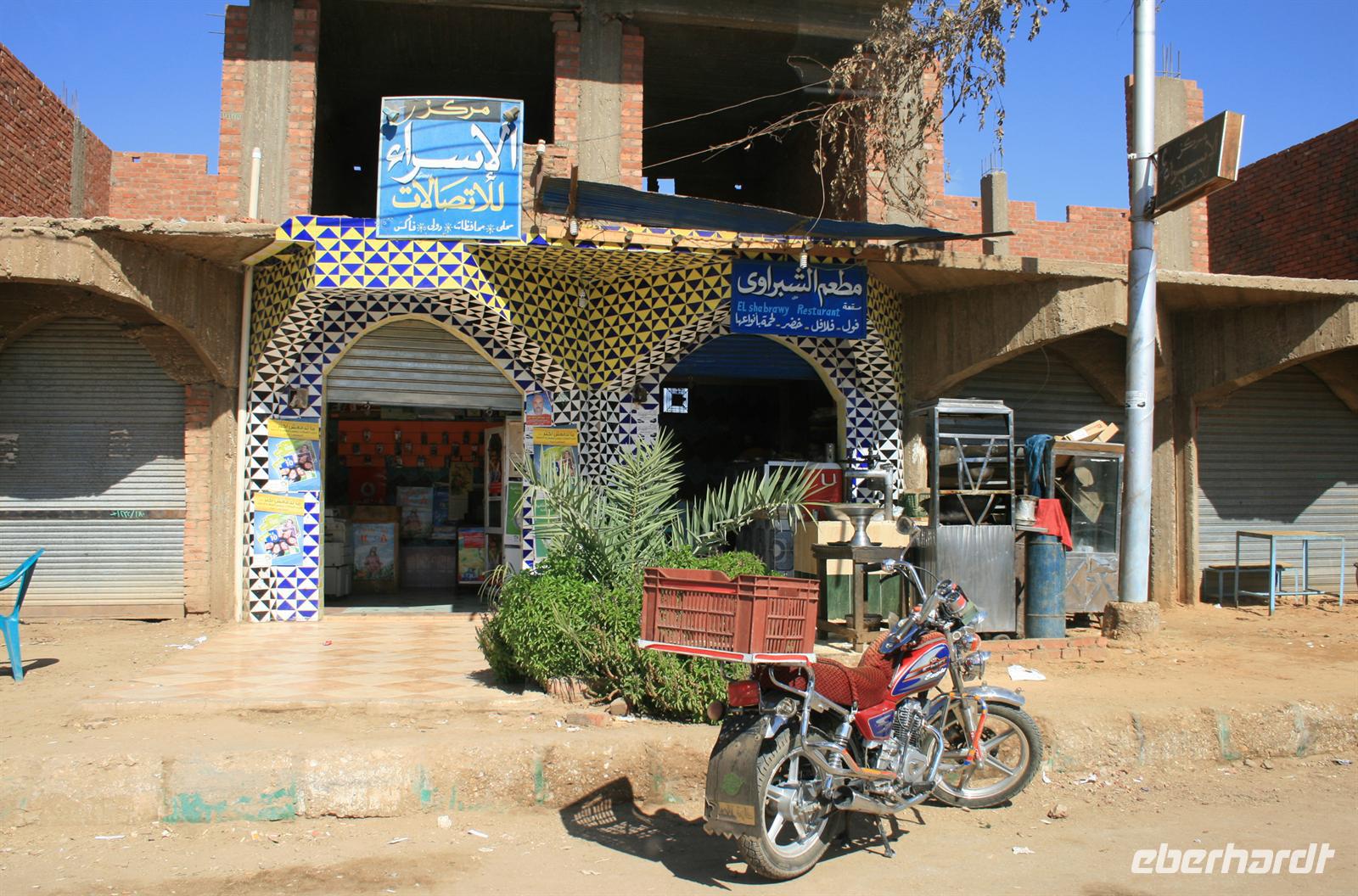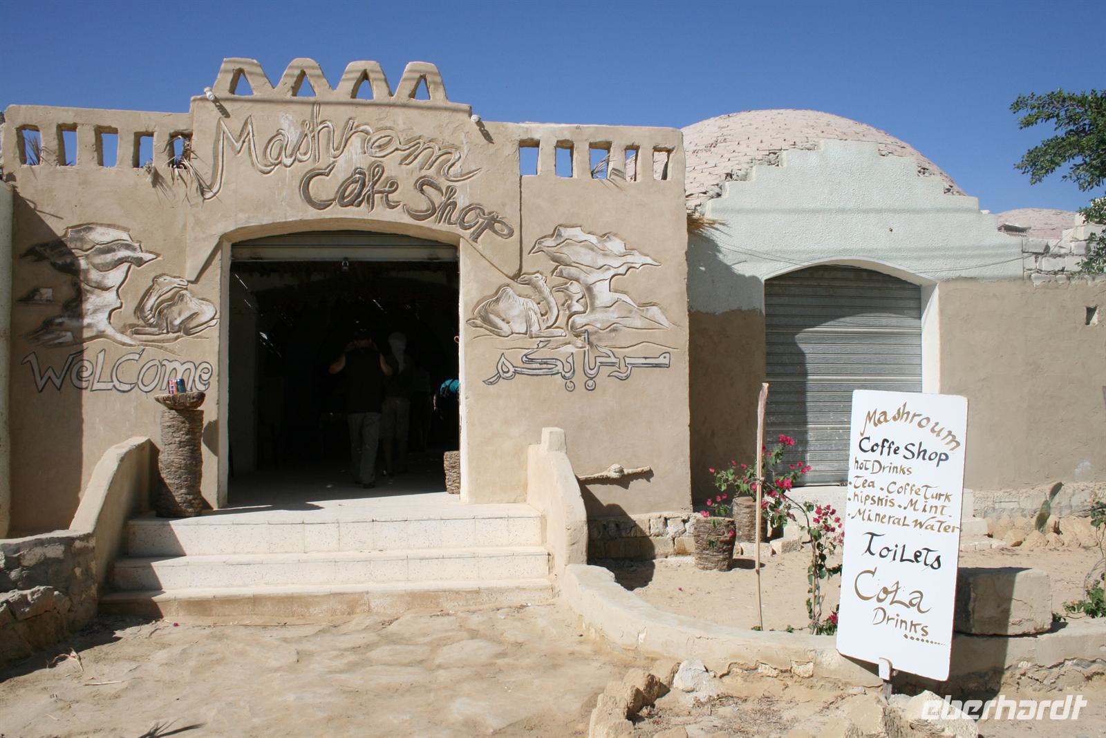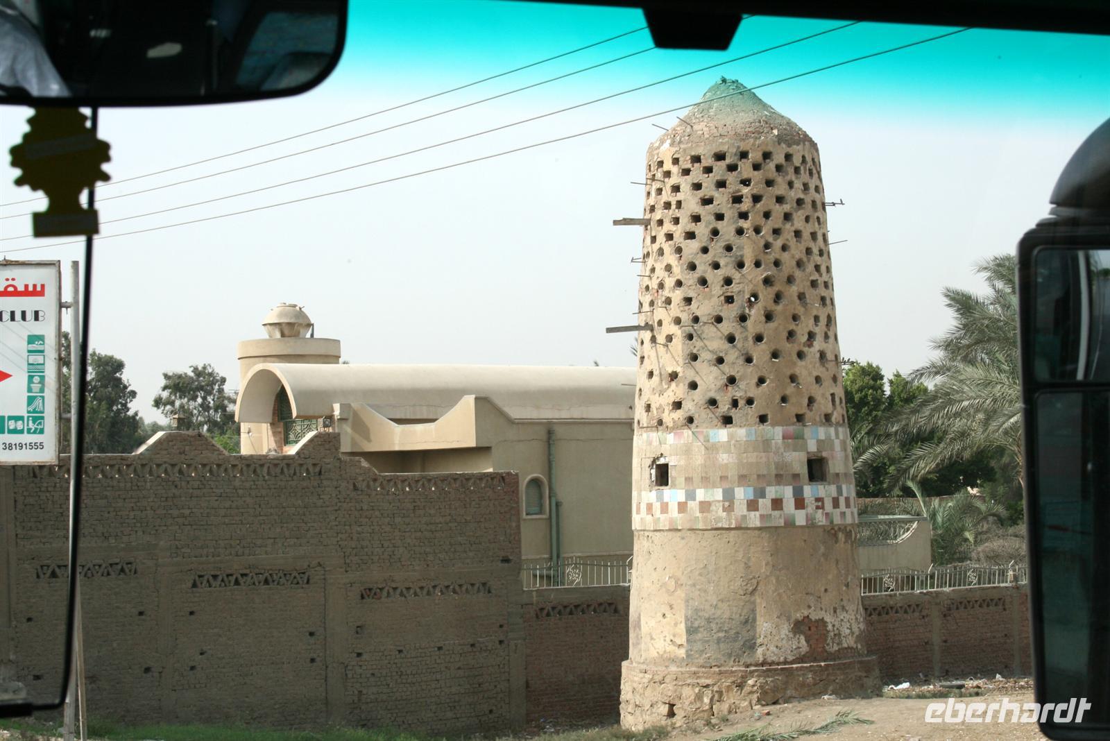 Wir fahren weiter durch die Oase Kharga, die viele Kilometer lang ist und aus mehreren Orten besteht. In der größten Stadt leben 200.000 Einwohner. Im Umfeld der Orte wird Landwirtschaft betrieben und auch in den Orten selbst findet man viele grüne Flächen. Unsere Mittagspause verbringen wir in Bagawat, einem kleinen Ort am Rande der Oasen-Hauptstadt Qasr Charga. Wir werden unter einem Dach aus Palmenblättern mit typischen ägyptischen Spezialitäten bewirtet. Der Imbiss ist einfach, aber durchaus interessant. Man merkt, dass wir nicht mehr in den Touristenstädten am Nil sind, sondern wirklich im Hinterland, wo selten große Touristengruppen unterwegs sind. Die Toiletten sind natürlich auch nicht mehr so komfortabel ;-).