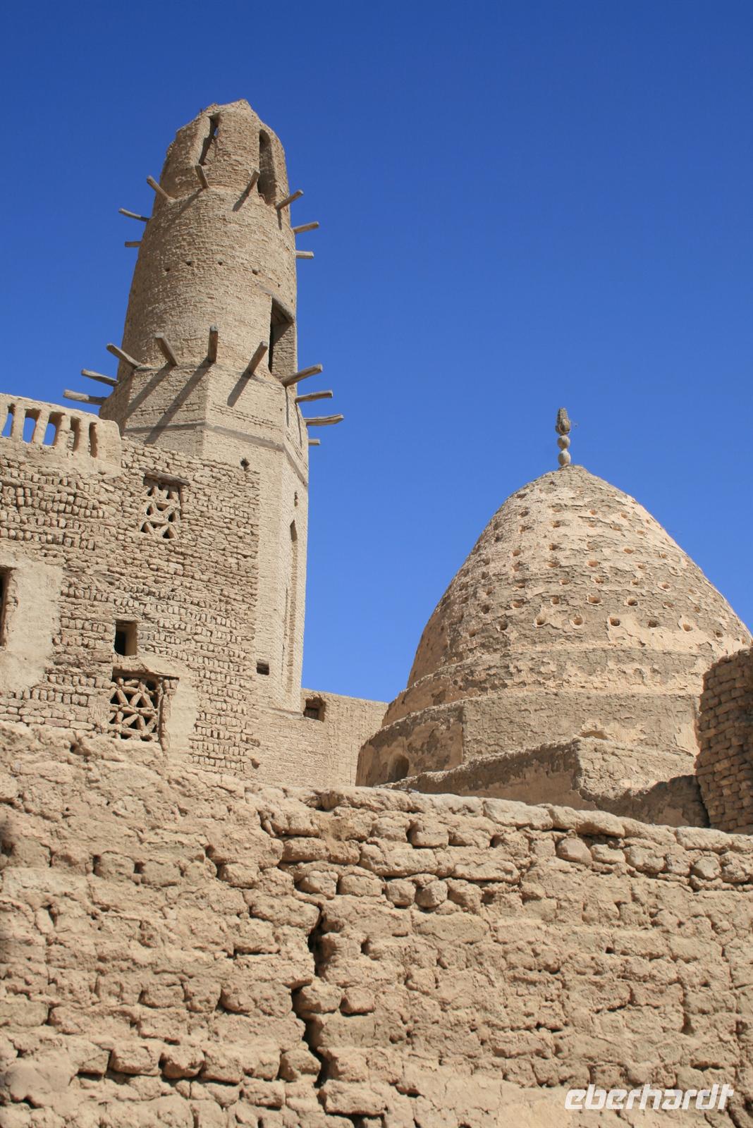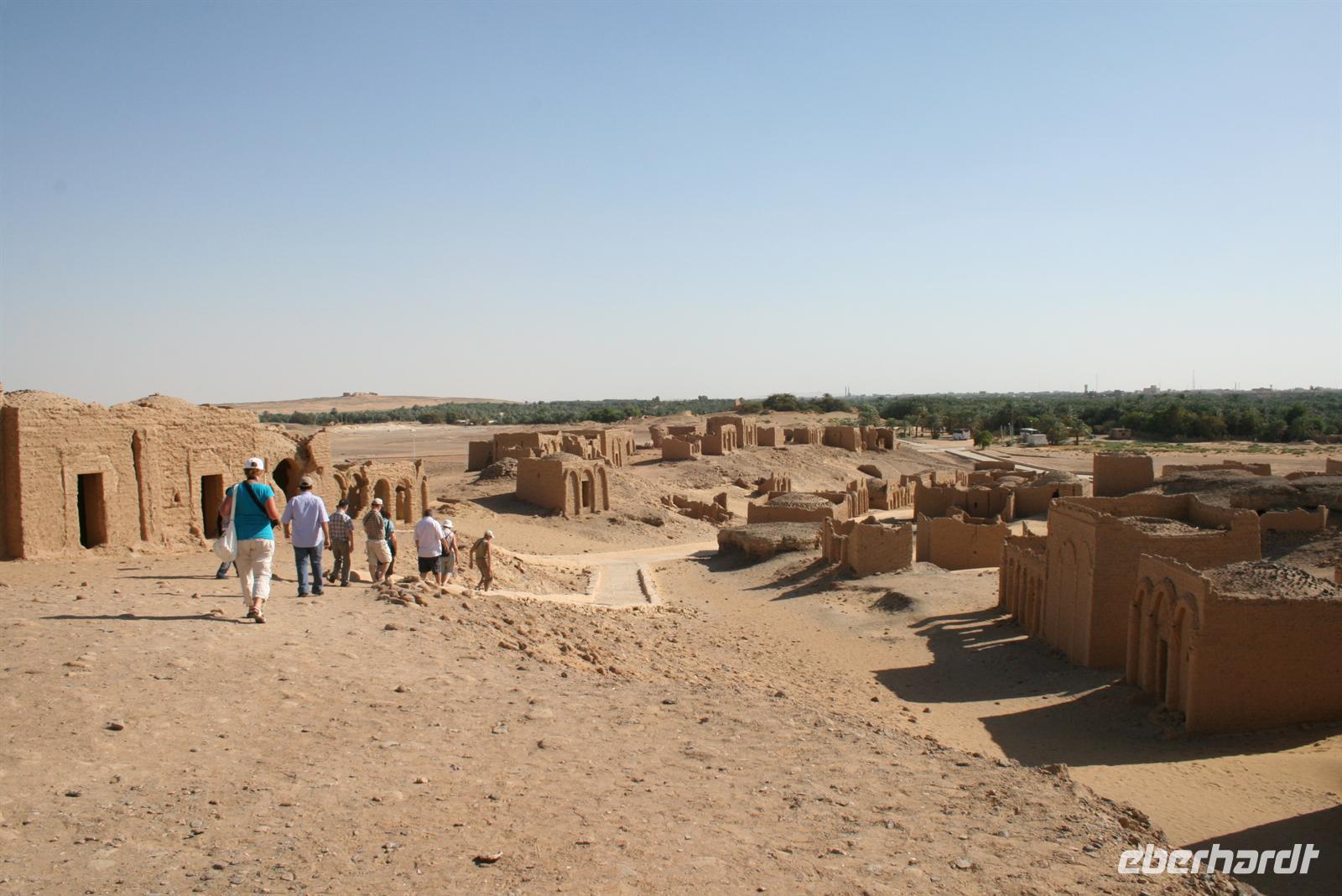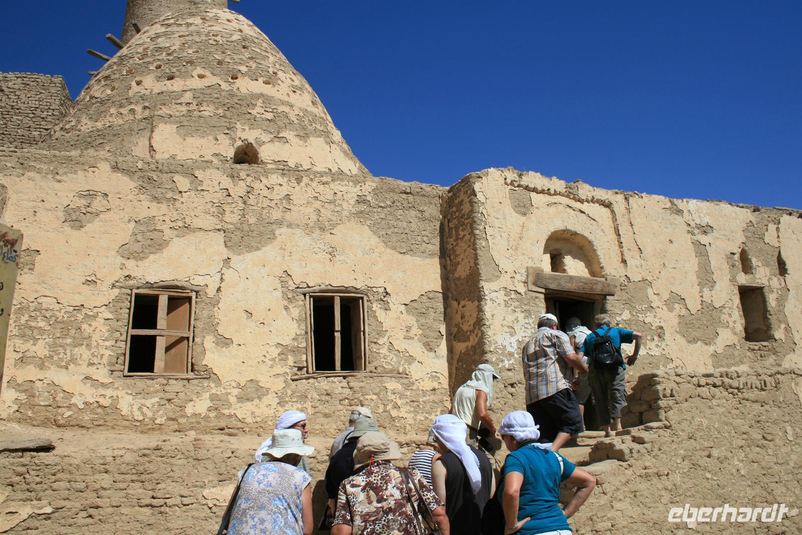 Besonders sehenswert ist hier die Altstadt Al Qasr, die nicht mehr bewohnt ist und heute ein riesiges Freiluftmuseum darstellt. Wir gehen durch schmale Gassen, Höfe und Häuser, die aus braunen, getrockneten Nilschlammziegeln gebaut sind. Aladin zeigt uns die kleine Moschee mit der Kuppel und dem Minarett aus Nilschlamm und Lehm, eine hölzerne Getreidemühle, eine alte Olivenölpresse und den ehemaligen Gerichtshof der Stadt. Es ist wie ein Ausflug in eine andere, längst vergangene Welt. Al Qasr muss man gesehen haben!