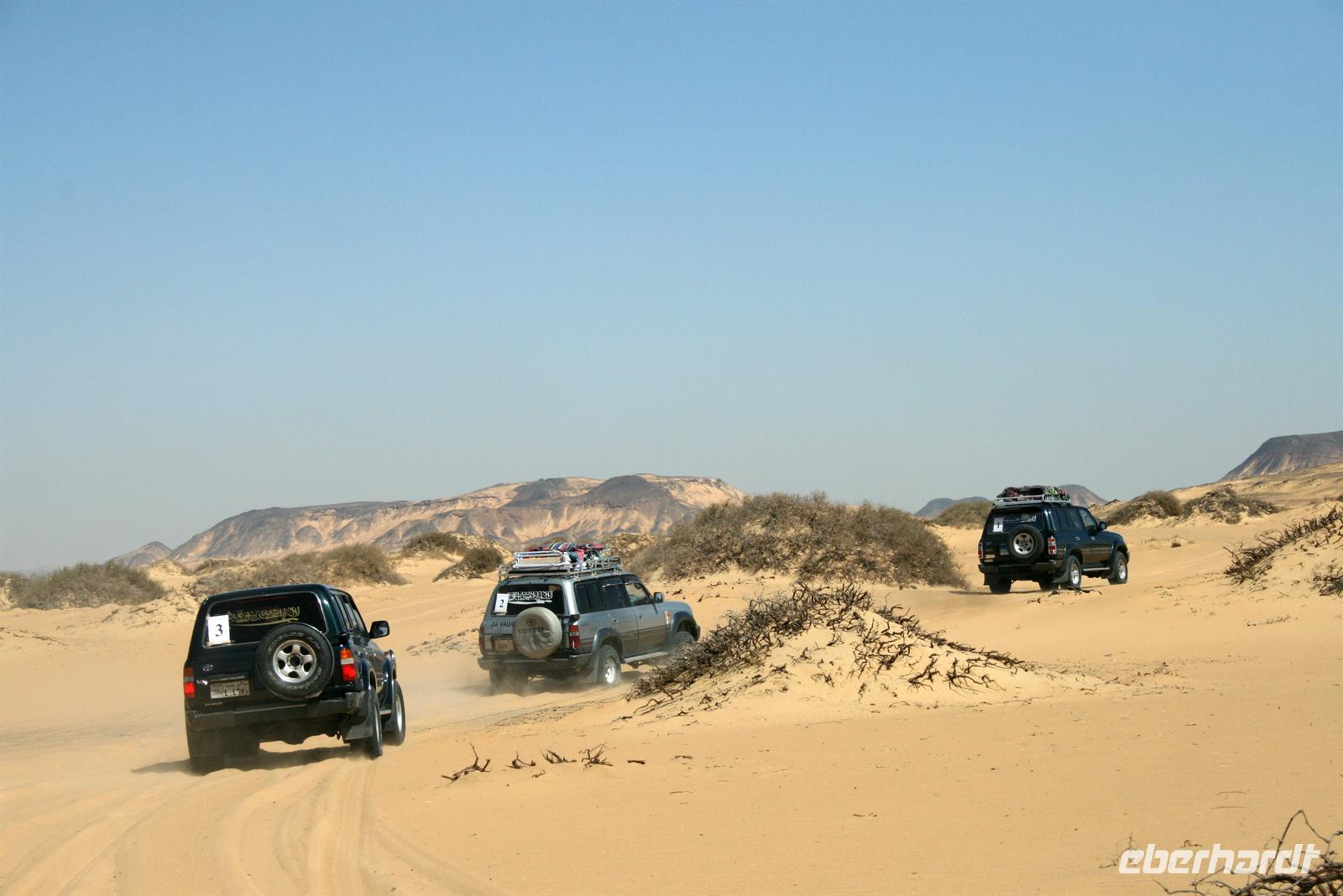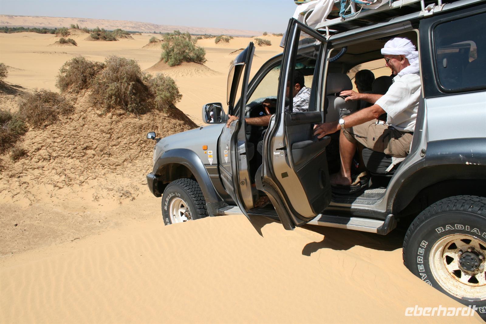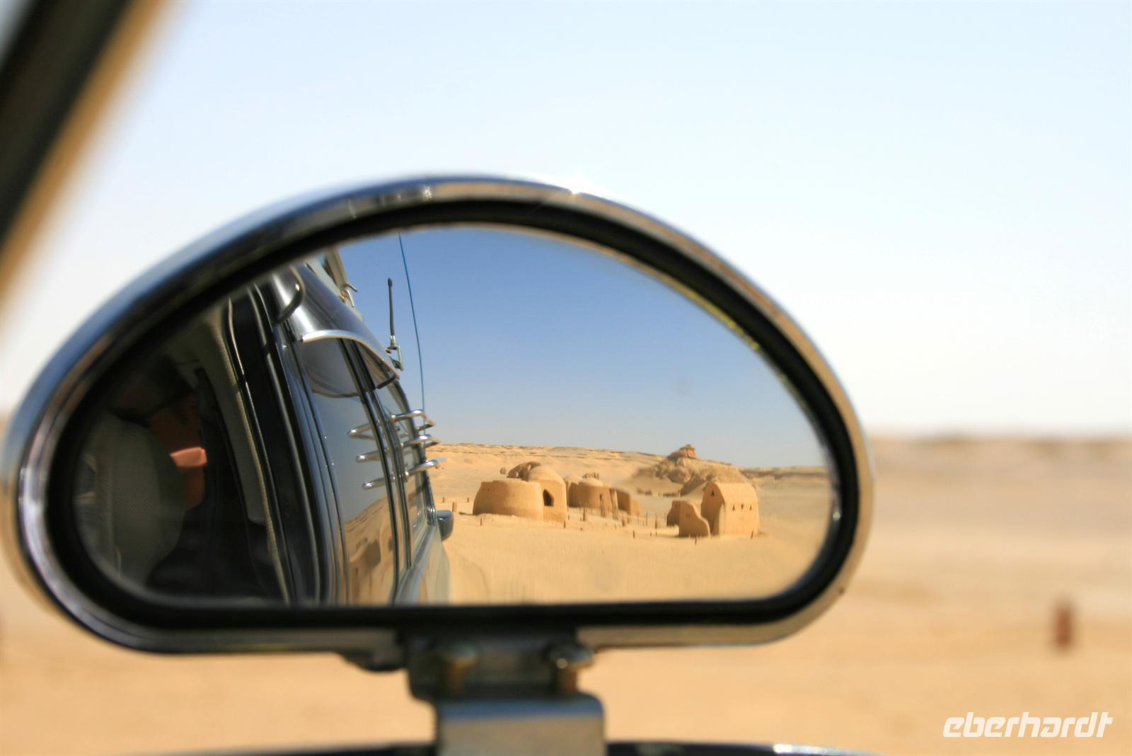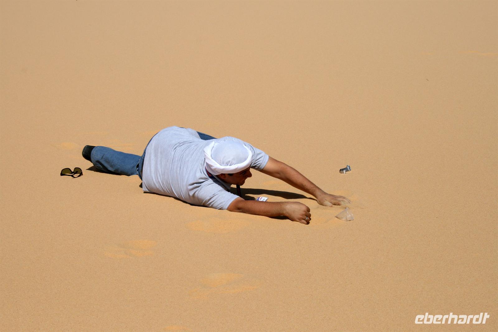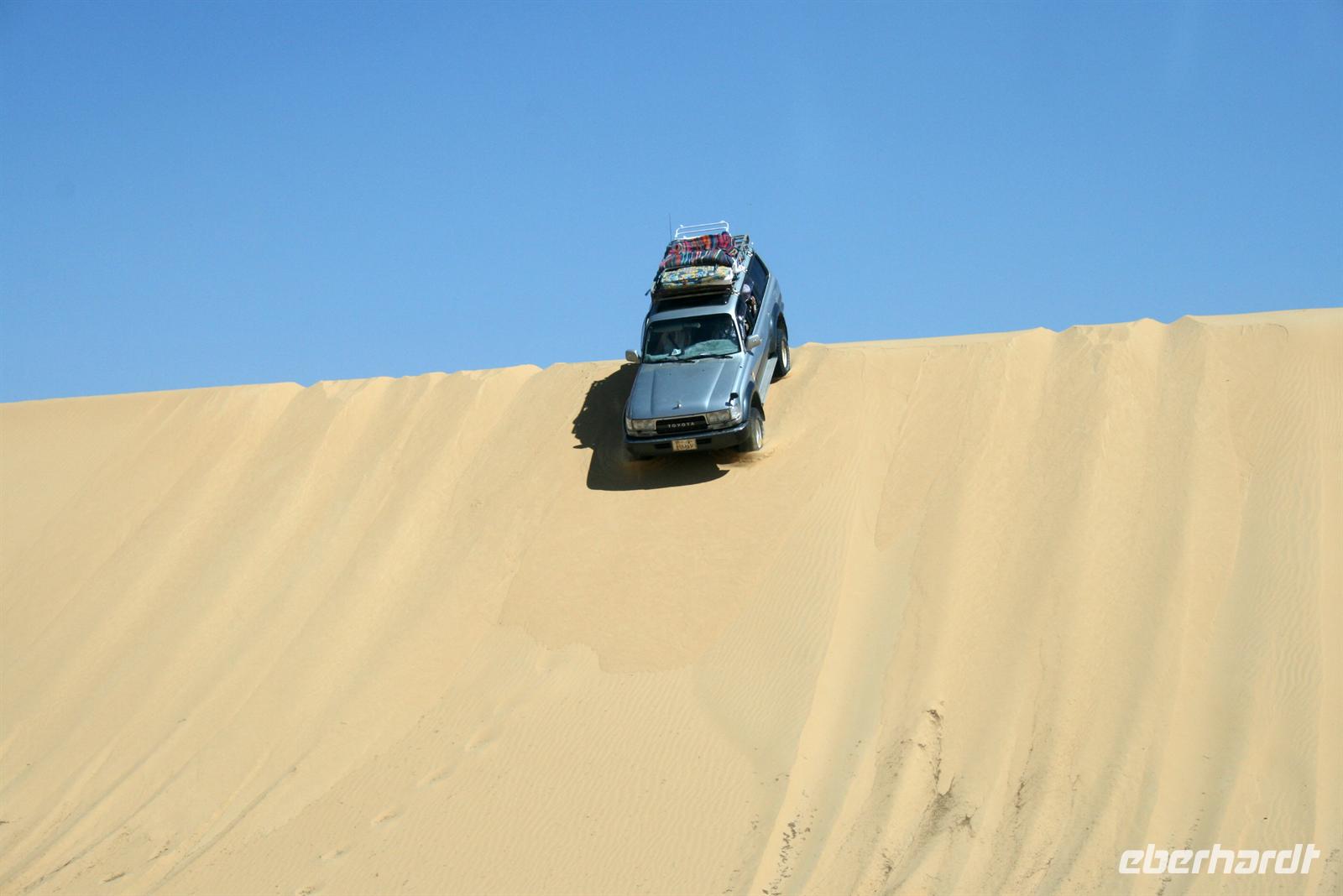 Wir passieren einen kleinen Ort, in dem wir in einem Café eine Toilettenpause einlegen. Und dann geht es weiter durch die Wüste. Riesige Sanddünen laden unsere Fahrer ein, ihr Können zu zeigen. Wir haben viel Spaß und Bauchkribbeln, als wir die Dünen fast senkrecht hinauf und hinunter fahren. Jeder begeisterte Autofahrer kommt hier auf seine Kosten!