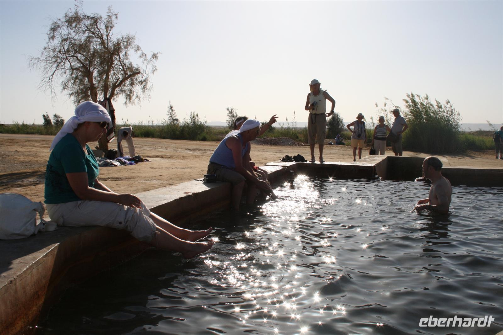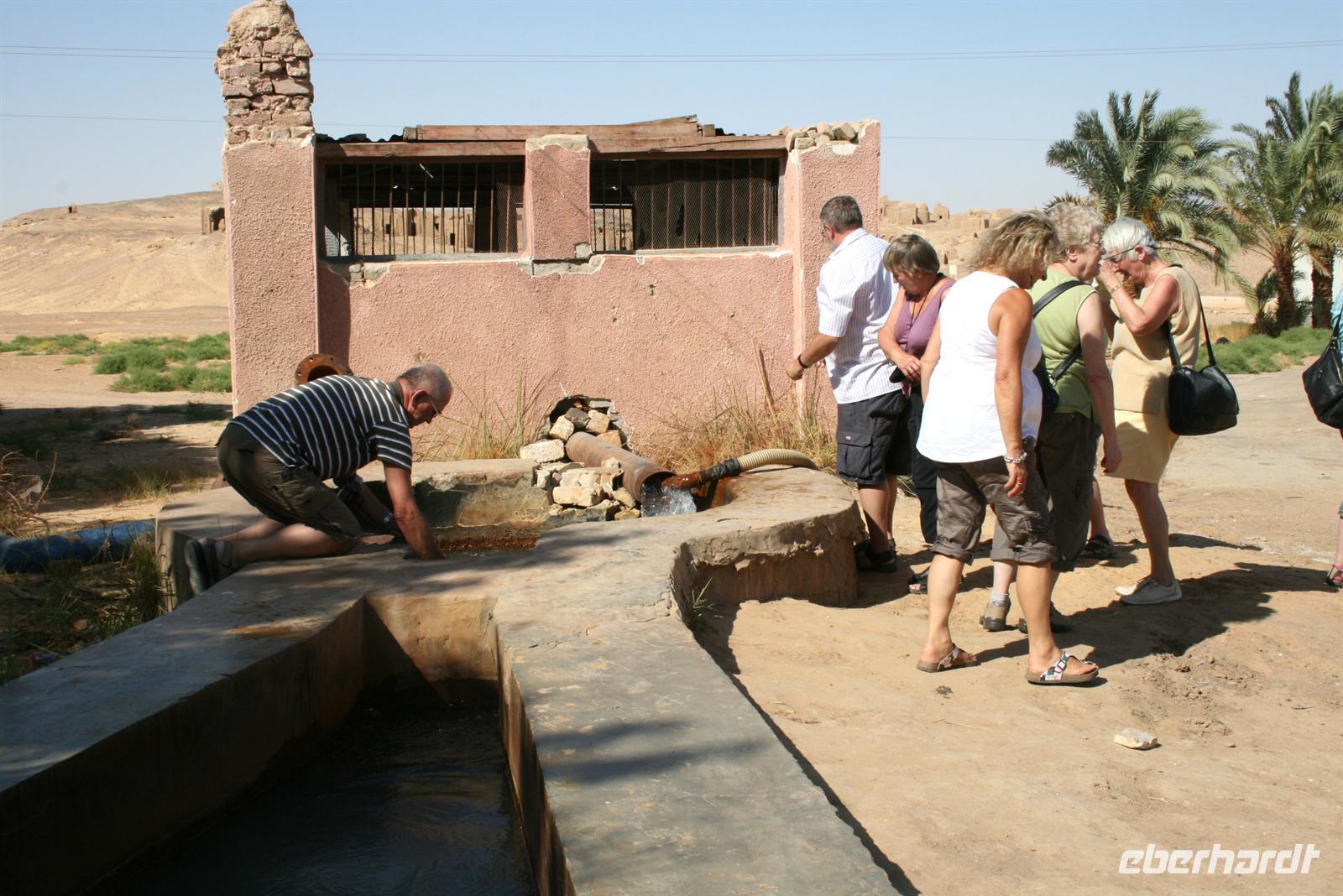 Wir kehren zurück auf die Asphaltstraße und kommen in der Oase Farafra an. Hier machen wir unsere Mittagspause in einem kleinen Café. Es gibt das gewohnte Fladenbrot mit verschiedenen Aufstrichen sowie frisches Obst und Gemüse aus der Oase. Im Anschluss fahren wir zu einer der berühmten heißen Quellen der Region. Das Wasser ist schwefelhaltig und 34°C warm. Die Lufttemperatur beträgt etwa 40°C, dennoch nutzen einige der Gäste das Wasserbecken für ein Bad, andere lassen sich nur die Füße vom warmen Wasser umspülen.