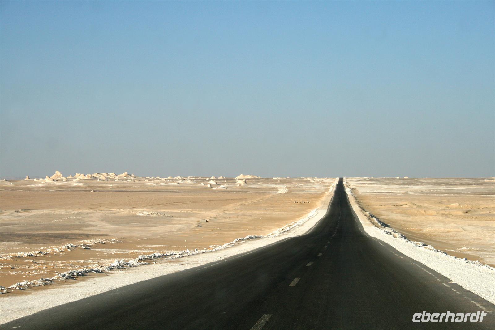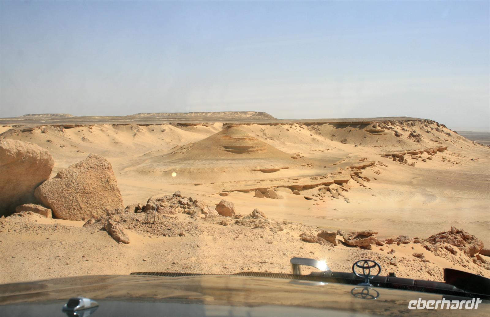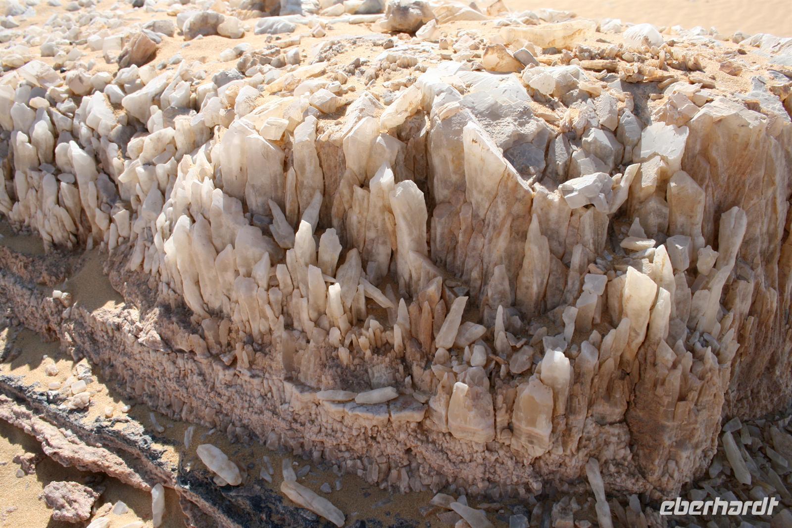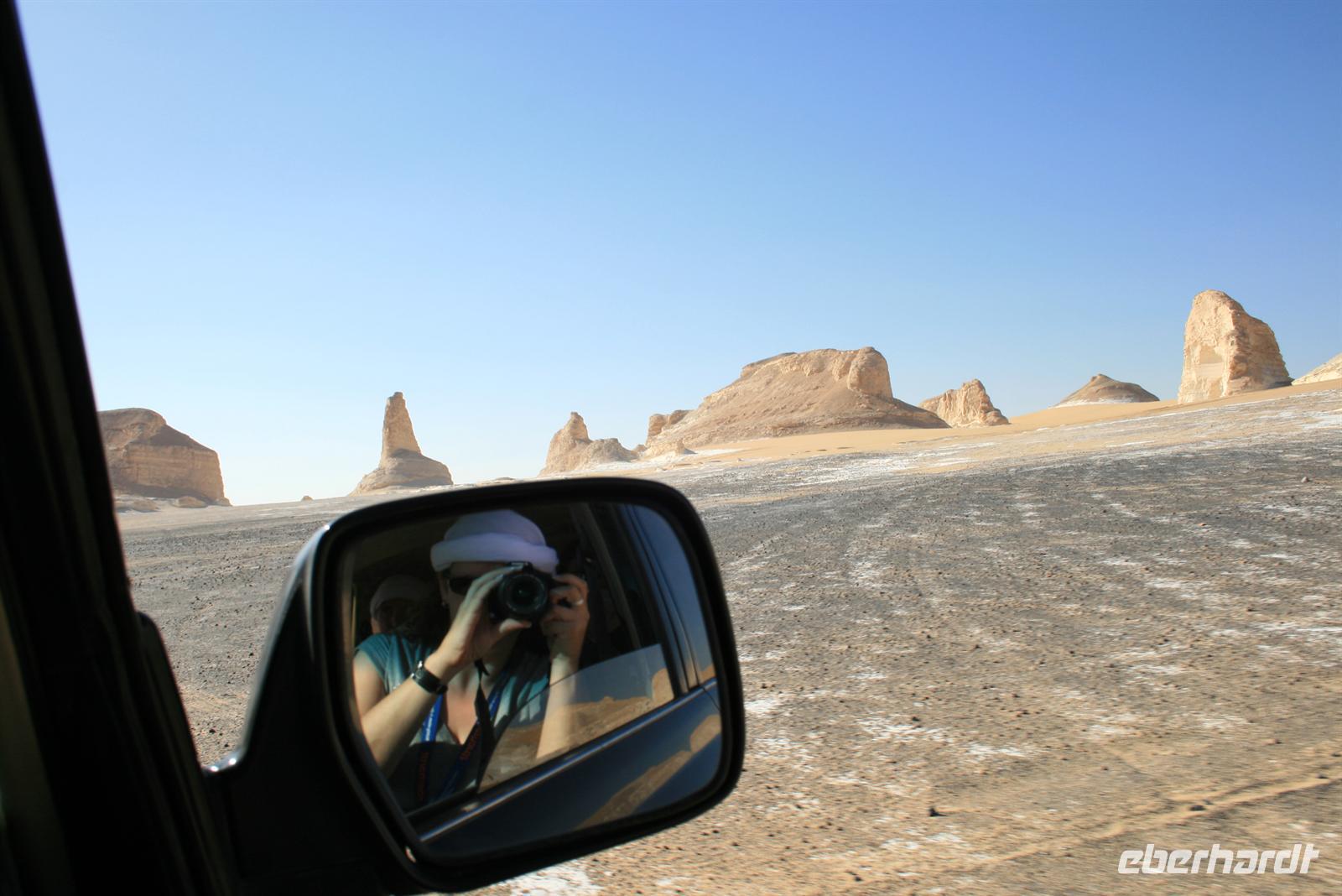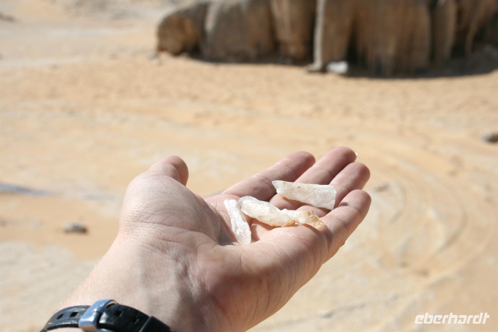Immernoch fahren wir durch die Weiße Wüste mit ihren skurrilen Kalksteinformationen, die wir bei einigen Fotostopps bewundern. Danach folgen große Sandflächen mit bergigem Gelände. Wir fahren teils querfeldein durch den Sand und teils auf der asphaltierten Straße. Nächste Sehenswürdigkeit ist das Gebiet des so genannten Kristallbergs. Wir halten an einer Stelle, an der wir ein paar kleinere Felsen mit weißen Quarz-Kristallen sehen.