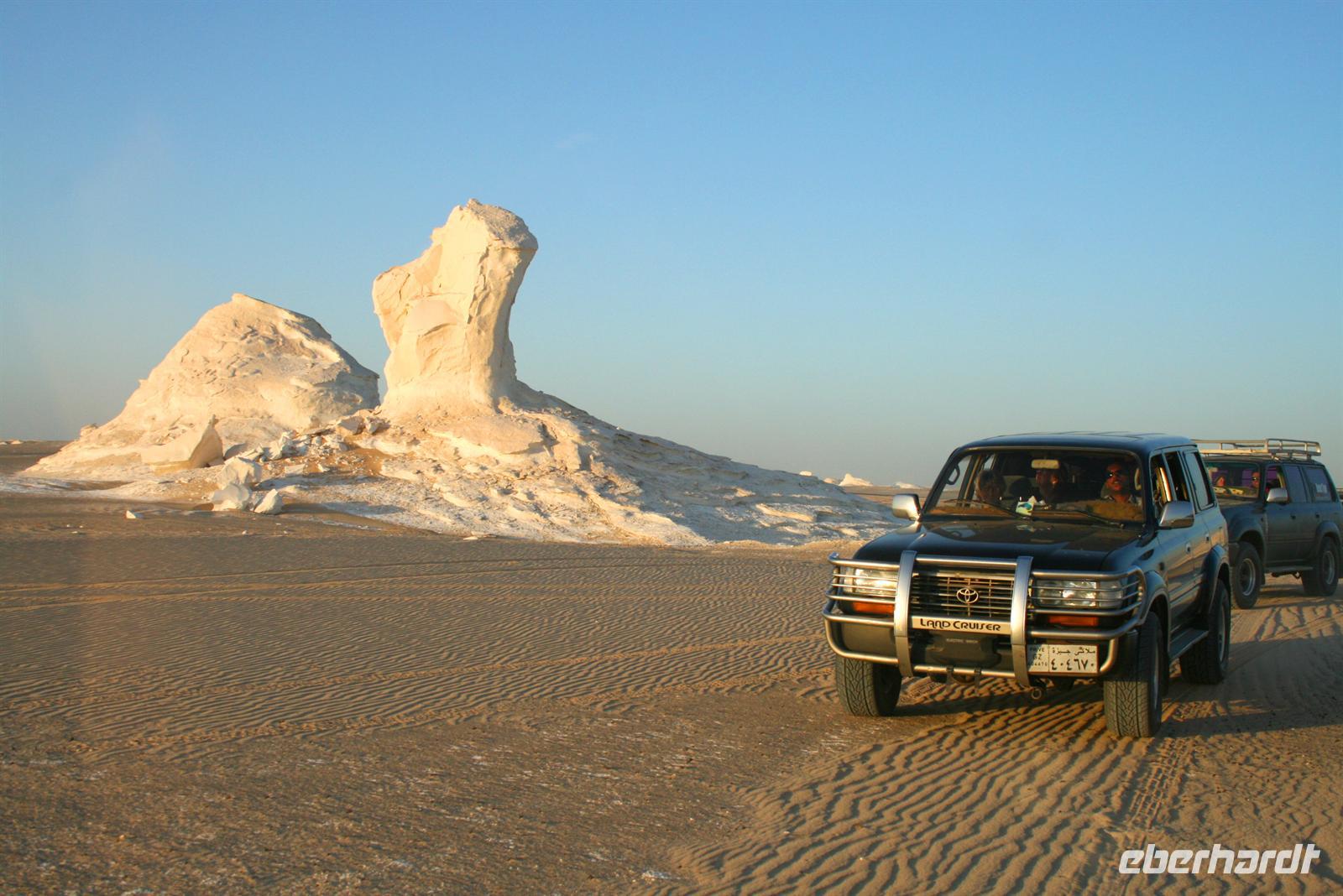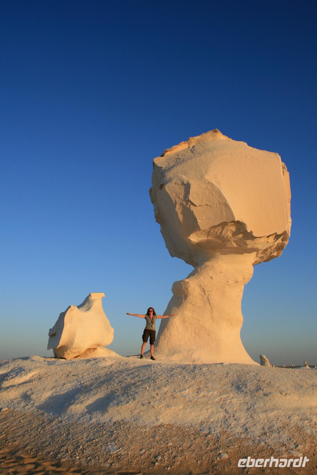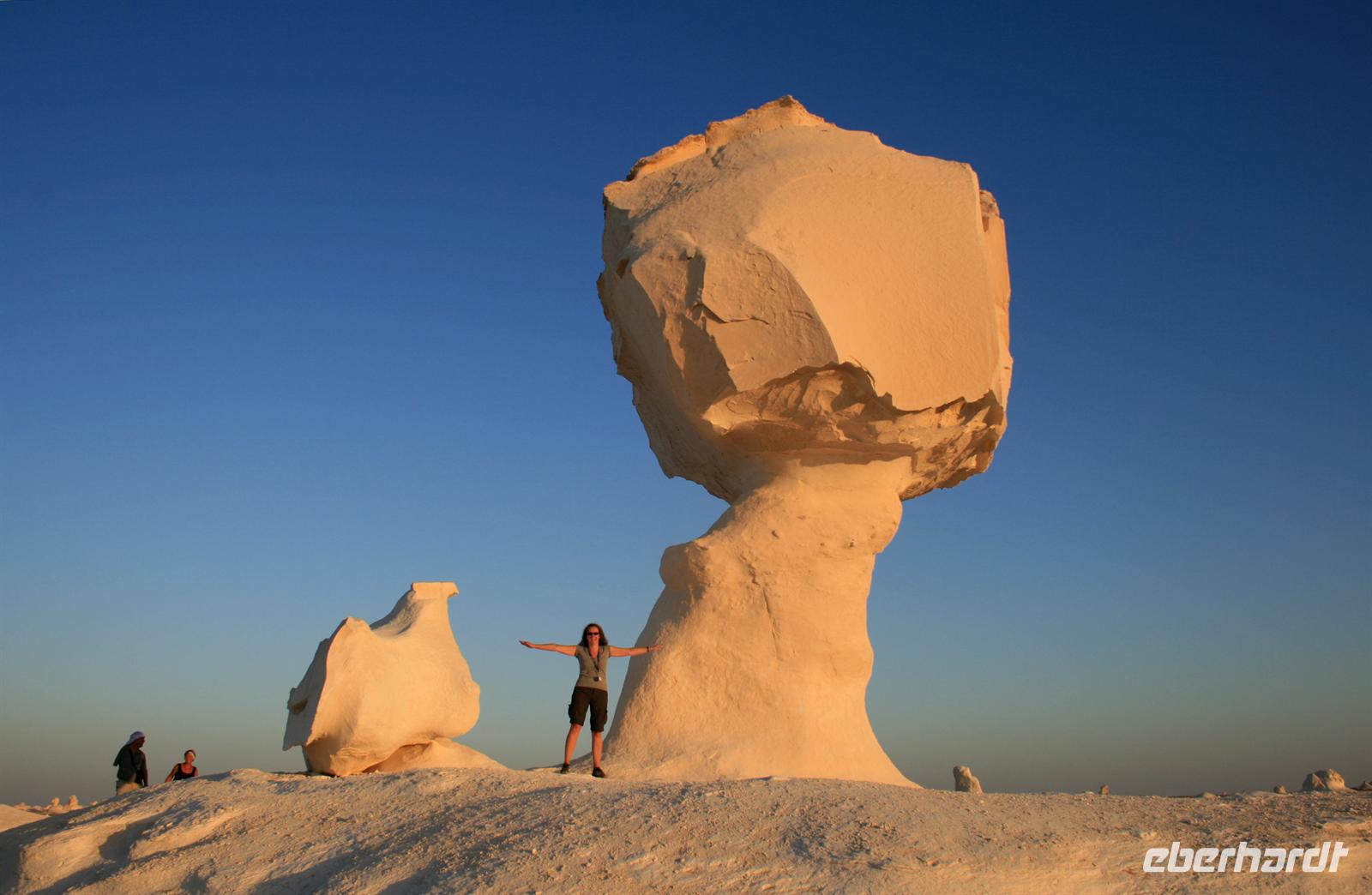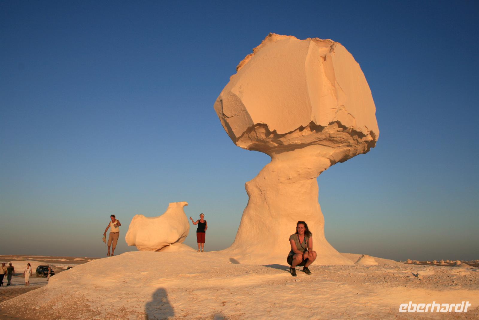 Wenig später erreichen wir den wohl schönsten der ägyptischen Wüste - die Weiße Wüste. Sie bekommt ihren Namen durch das strahlende Weiß des Kalksteins, der vor Millionen von Jahren der Meeresboden eines riesigen Ozeans war. Schon jetzt ist die Landschaft beeindruckend, aber es kommt noch besser! Bald verlassen wir die Straße und fahren hinein in die Weiße Wüste. Bei einigen Fotostopps und kleinen Spaziergängen entstehen am späten Nachmittag die schönsten Fotos. Besonderes Fotomotiv ist eine der bekanntesten Felsformationen, das so genannte „chicken“ (= Huhn). Das warme Licht der Abendsonne lässt die weißen Kalksteinfelsen in verschiedenen Farbtönen strahlen.