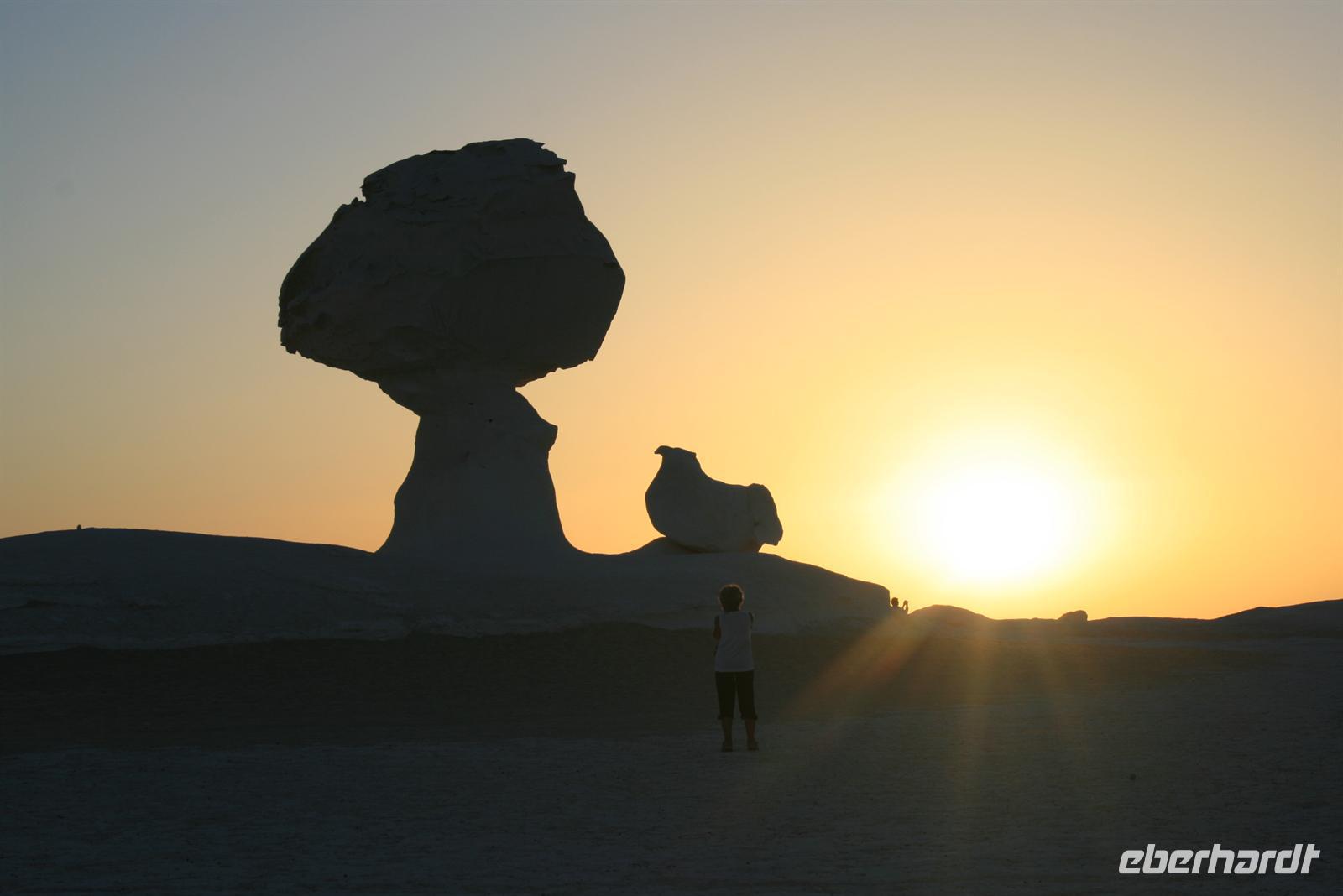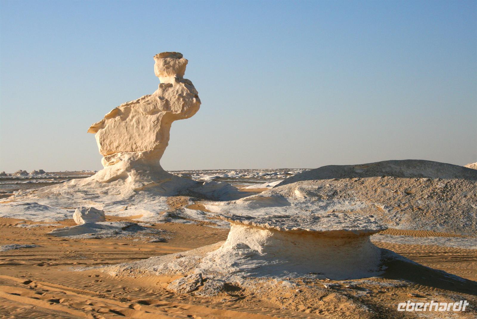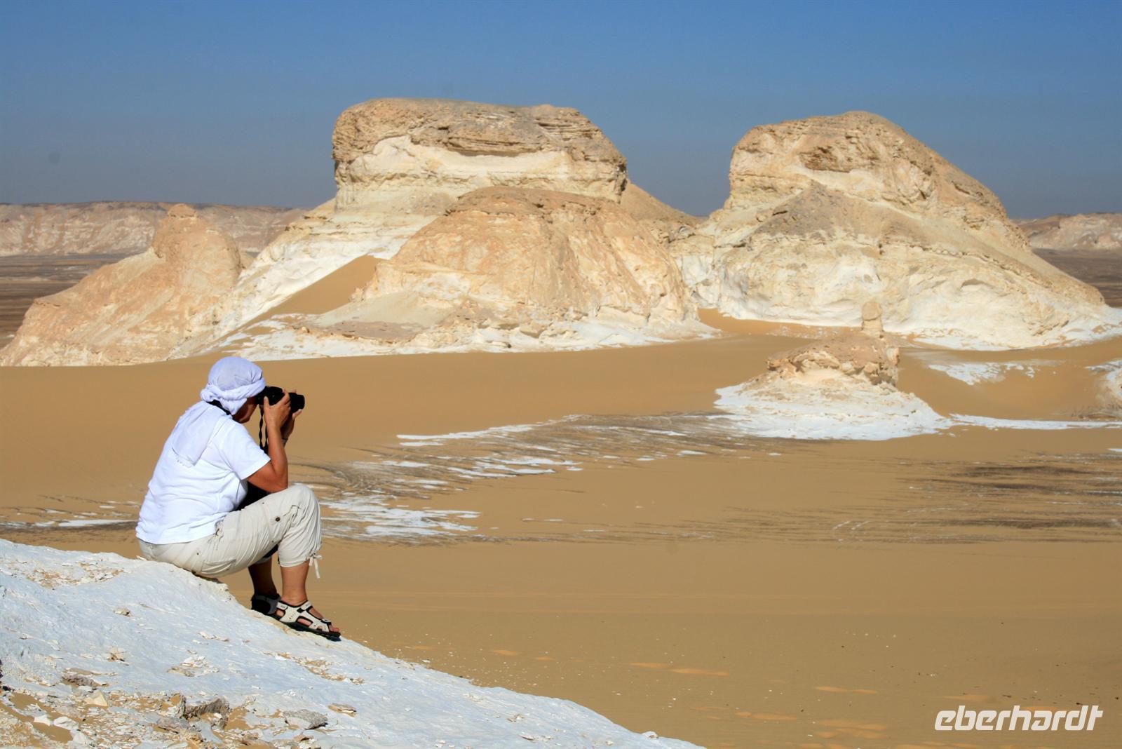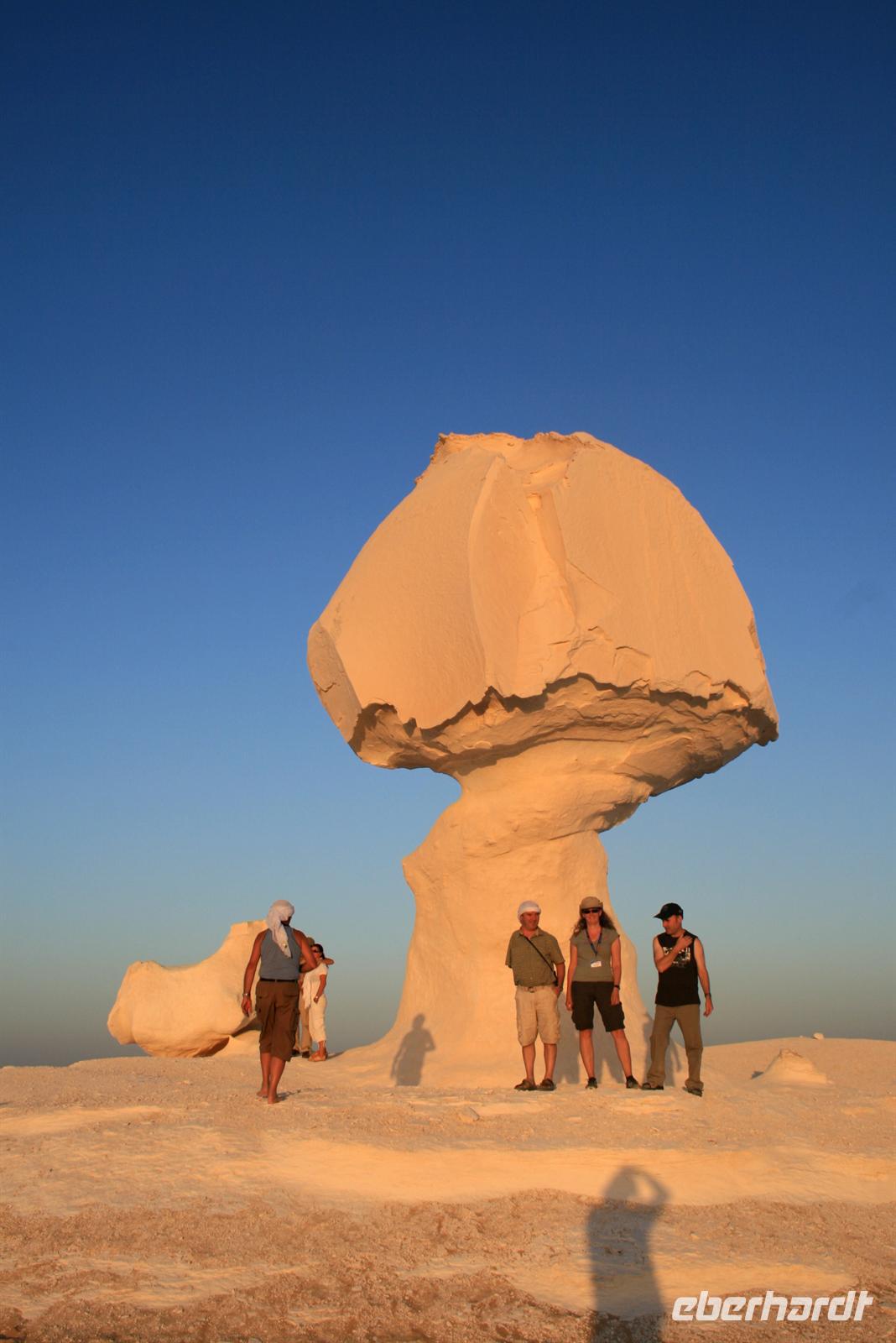 Wenig später erreichen wir den wohl schönsten der ägyptischen Wüste - die Weiße Wüste. Sie bekommt ihren Namen durch das strahlende Weiß des Kalksteins, der vor Millionen von Jahren der Meeresboden eines riesigen Ozeans war. Schon jetzt ist die Landschaft beeindruckend, aber es kommt noch besser! Bald verlassen wir die Straße und fahren hinein in die Weiße Wüste. Bei einigen Fotostopps und kleinen Spaziergängen entstehen am späten Nachmittag die schönsten Fotos. Besonderes Fotomotiv ist eine der bekanntesten Felsformationen, das so genannte „chicken“ (= Huhn). Das warme Licht der Abendsonne lässt die weißen Kalksteinfelsen in verschiedenen Farbtönen strahlen.