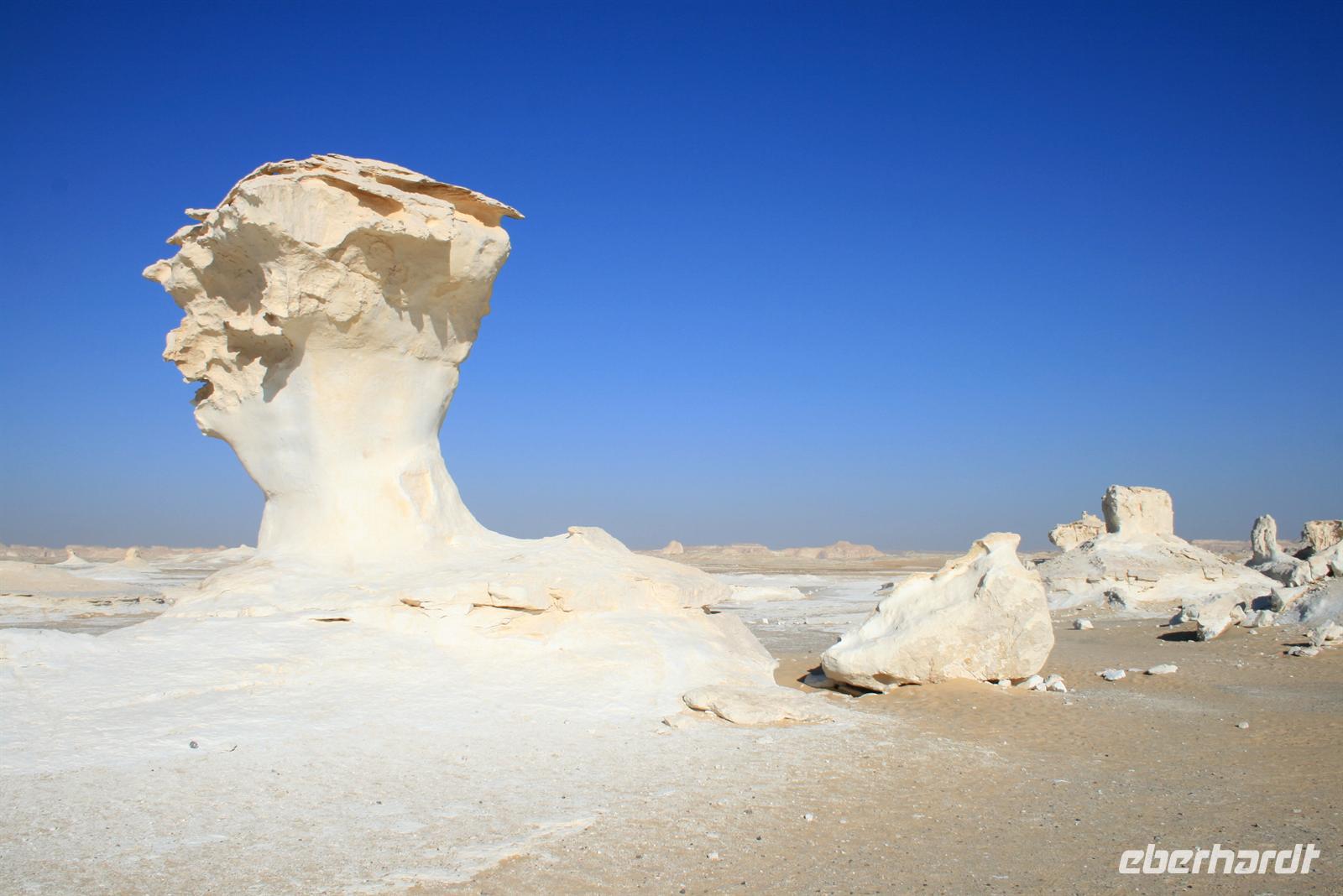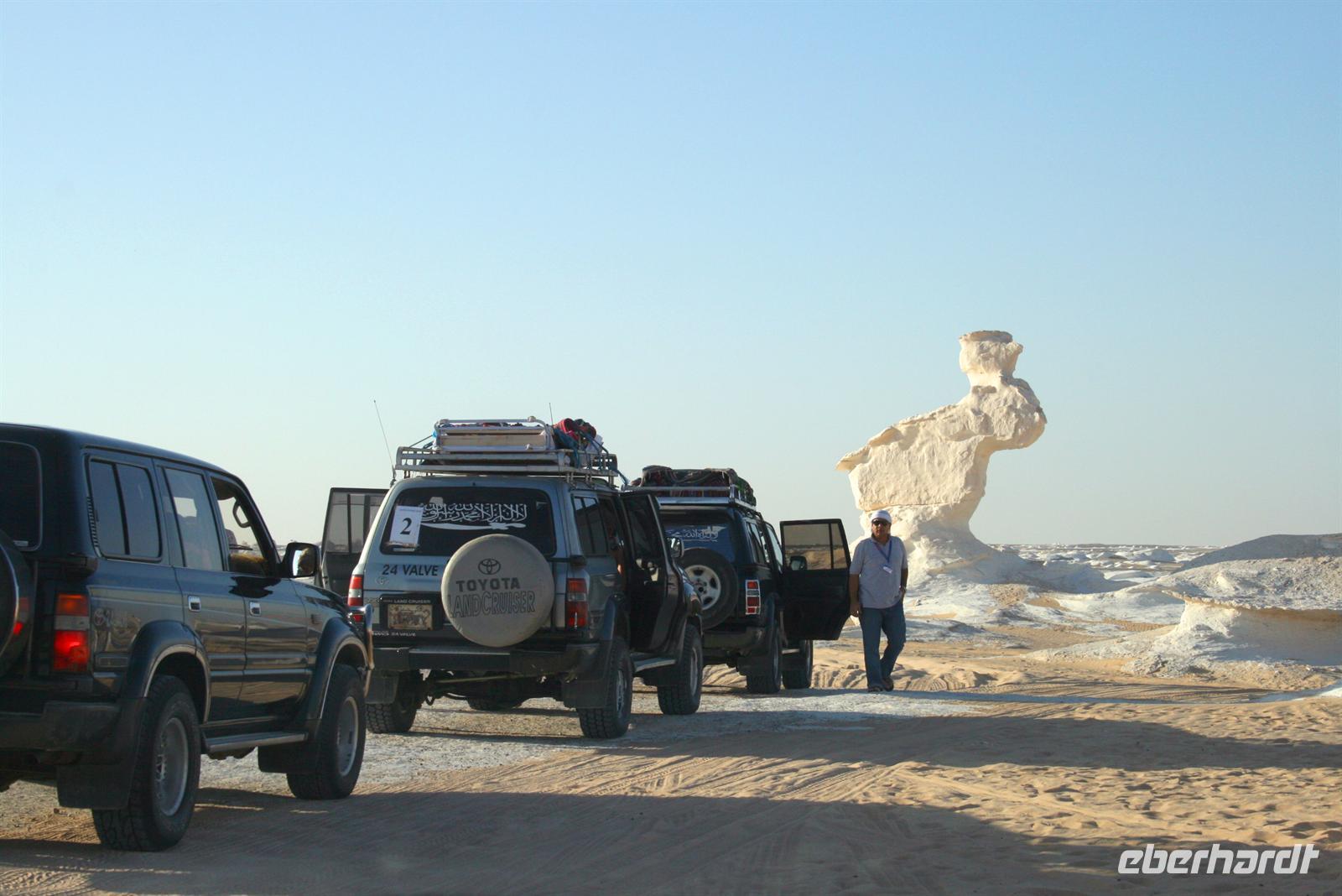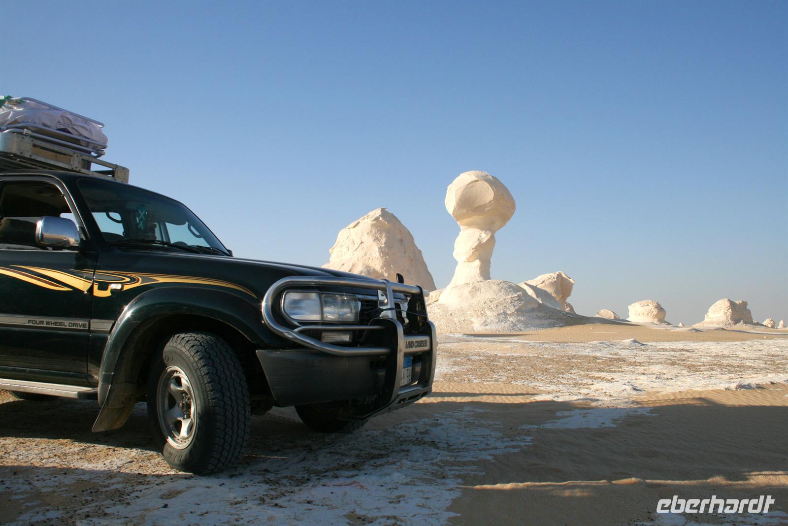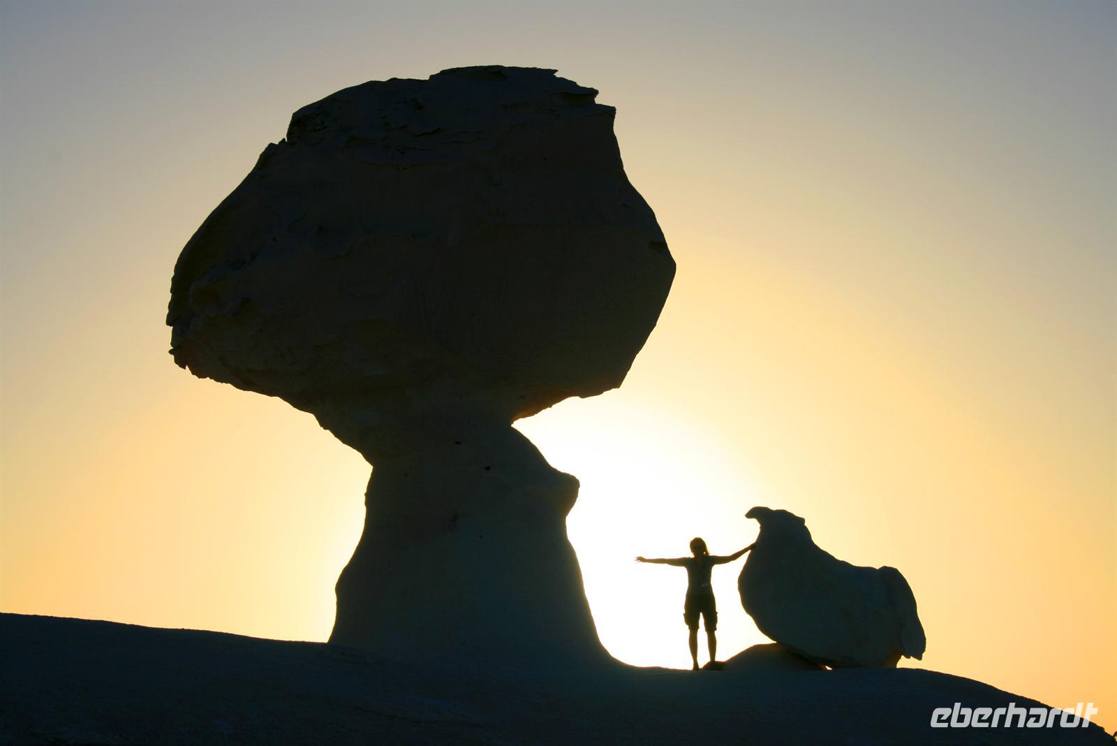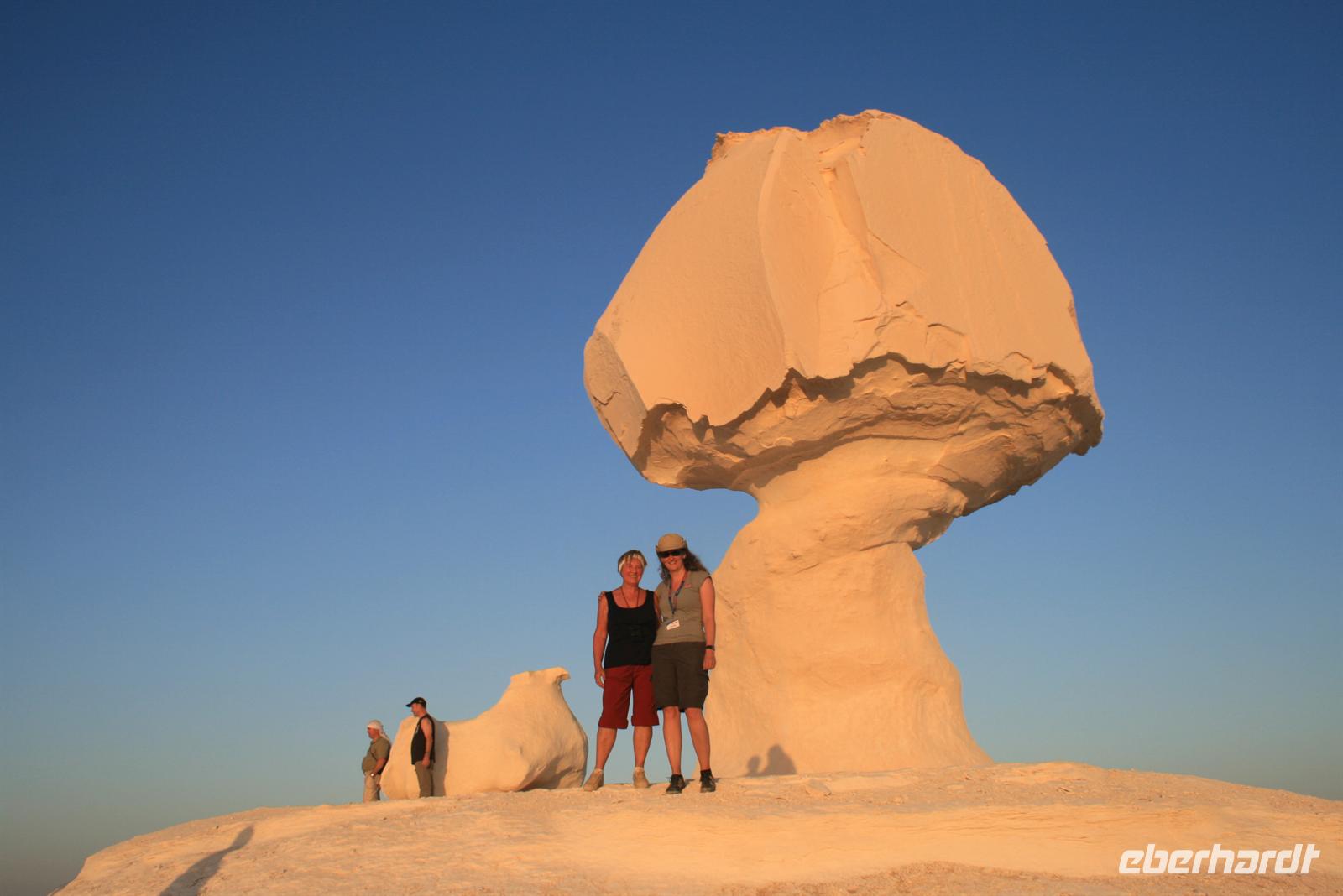 Wenig später erreichen wir den wohl schönsten der ägyptischen Wüste - die Weiße Wüste. Sie bekommt ihren Namen durch das strahlende Weiß des Kalksteins, der vor Millionen von Jahren der Meeresboden eines riesigen Ozeans war. Schon jetzt ist die Landschaft beeindruckend, aber es kommt noch besser! Bald verlassen wir die Straße und fahren hinein in die Weiße Wüste. Bei einigen Fotostopps und kleinen Spaziergängen entstehen am späten Nachmittag die schönsten Fotos. Besonderes Fotomotiv ist eine der bekanntesten Felsformationen, das so genannte „chicken“ (= Huhn). Das warme Licht der Abendsonne lässt die weißen Kalksteinfelsen in verschiedenen Farbtönen strahlen.