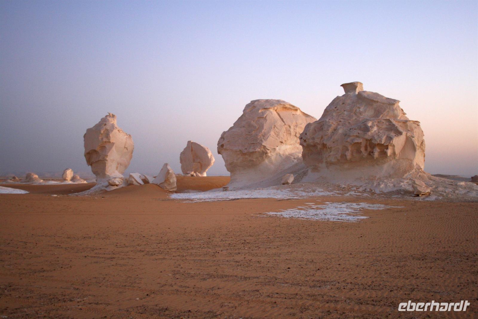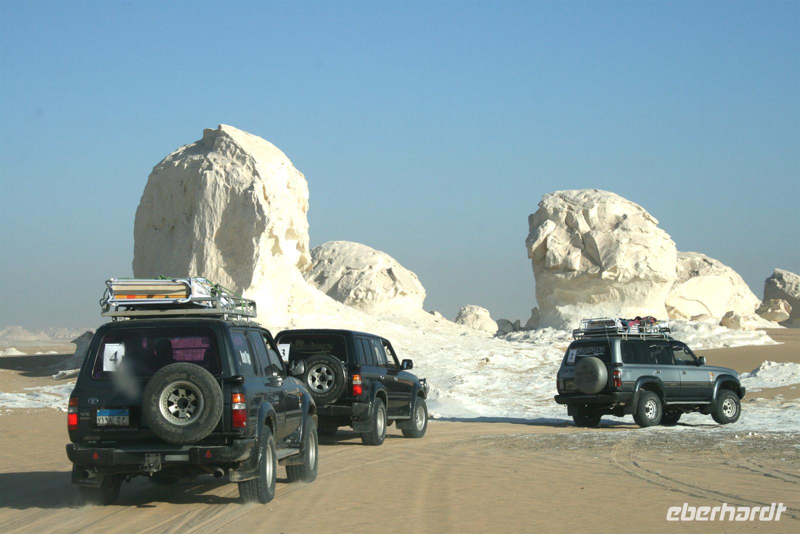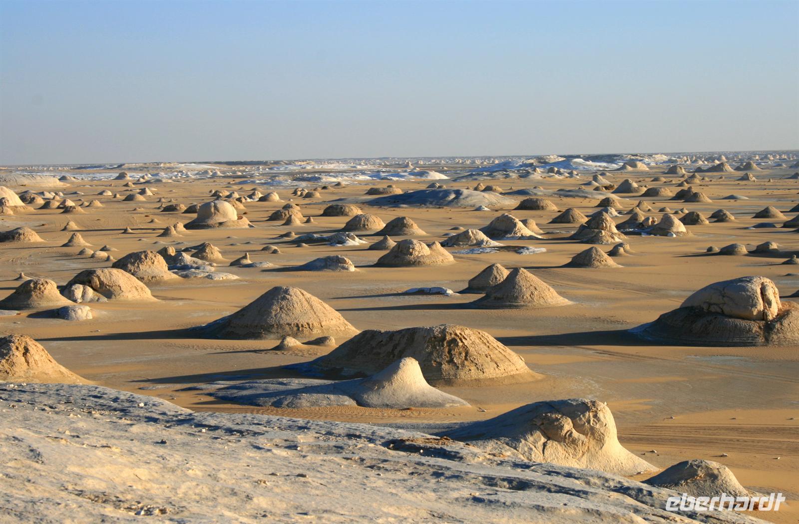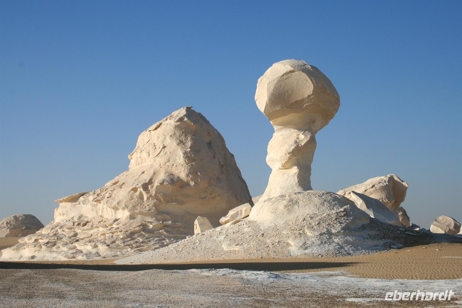 Wenig später erreichen wir den wohl schönsten der ägyptischen Wüste - die Weiße Wüste. Sie bekommt ihren Namen durch das strahlende Weiß des Kalksteins, der vor Millionen von Jahren der Meeresboden eines riesigen Ozeans war. Schon jetzt ist die Landschaft beeindruckend, aber es kommt noch besser! Bald verlassen wir die Straße und fahren hinein in die Weiße Wüste. Bei einigen Fotostopps und kleinen Spaziergängen entstehen am späten Nachmittag die schönsten Fotos. Besonderes Fotomotiv ist eine der bekanntesten Felsformationen, das so genannte „chicken“ (= Huhn). Das warme Licht der Abendsonne lässt die weißen Kalksteinfelsen in verschiedenen Farbtönen strahlen.