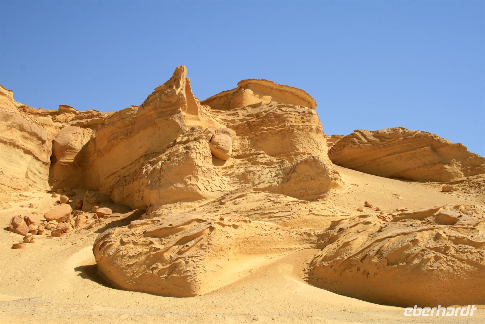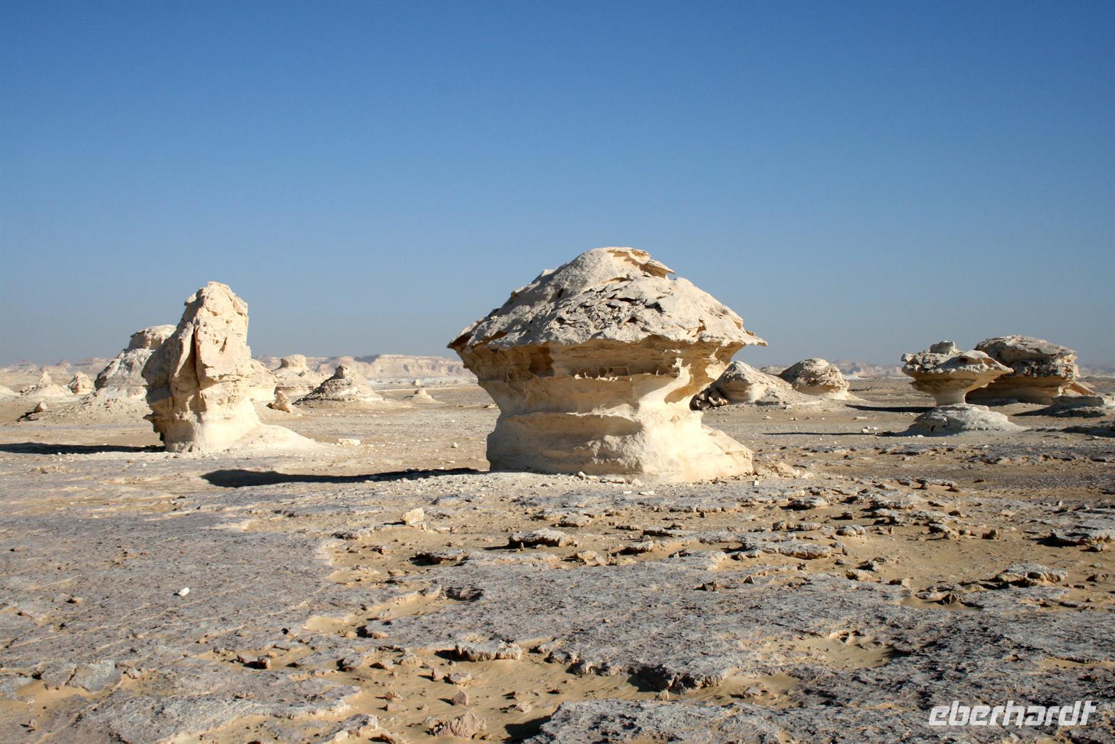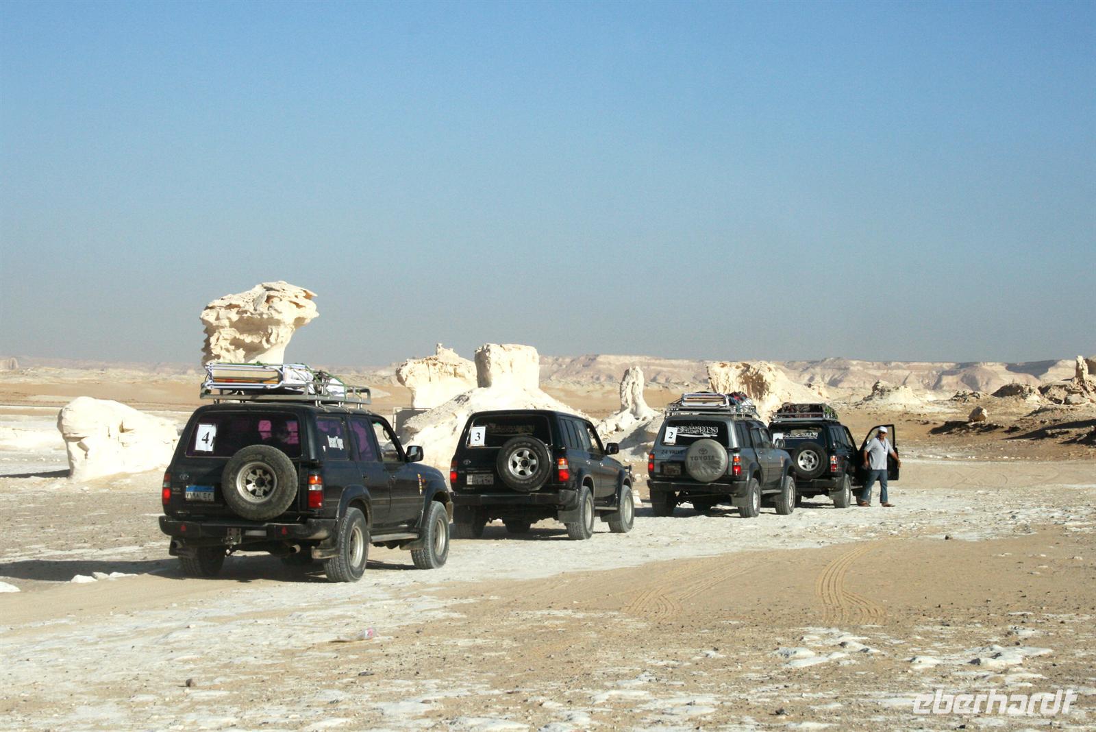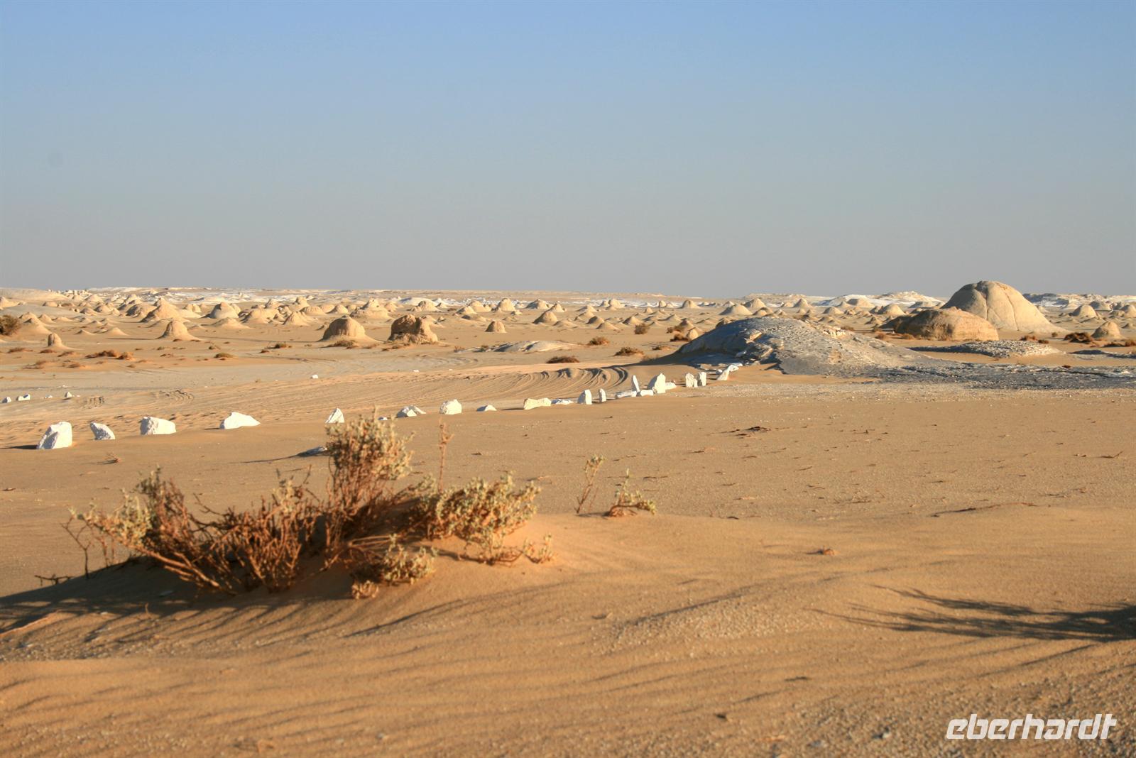 Wenig später erreichen wir den wohl schönsten der ägyptischen Wüste - die Weiße Wüste. Sie bekommt ihren Namen durch das strahlende Weiß des Kalksteins, der vor Millionen von Jahren der Meeresboden eines riesigen Ozeans war. Schon jetzt ist die Landschaft beeindruckend, aber es kommt noch besser! Bald verlassen wir die Straße und fahren hinein in die Weiße Wüste. Bei einigen Fotostopps und kleinen Spaziergängen entstehen am späten Nachmittag die schönsten Fotos. Besonderes Fotomotiv ist eine der bekanntesten Felsformationen, das so genannte „chicken“ (= Huhn). Das warme Licht der Abendsonne lässt die weißen Kalksteinfelsen in verschiedenen Farbtönen strahlen.