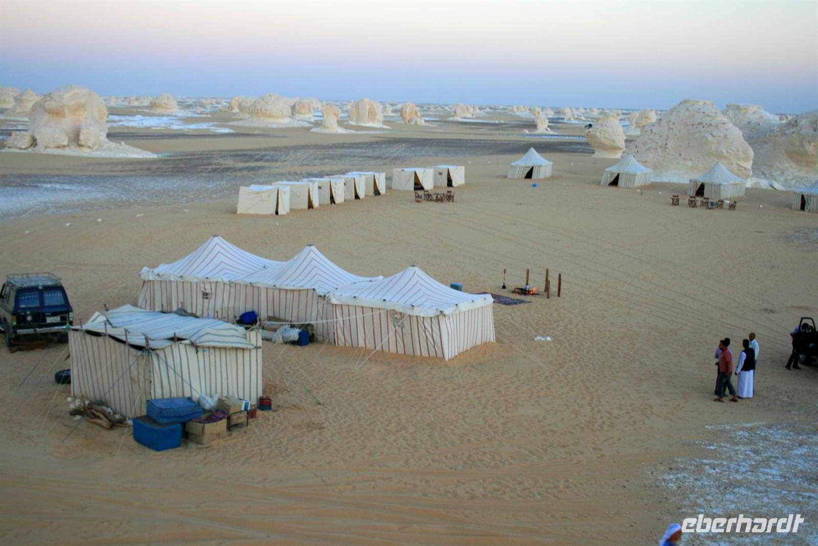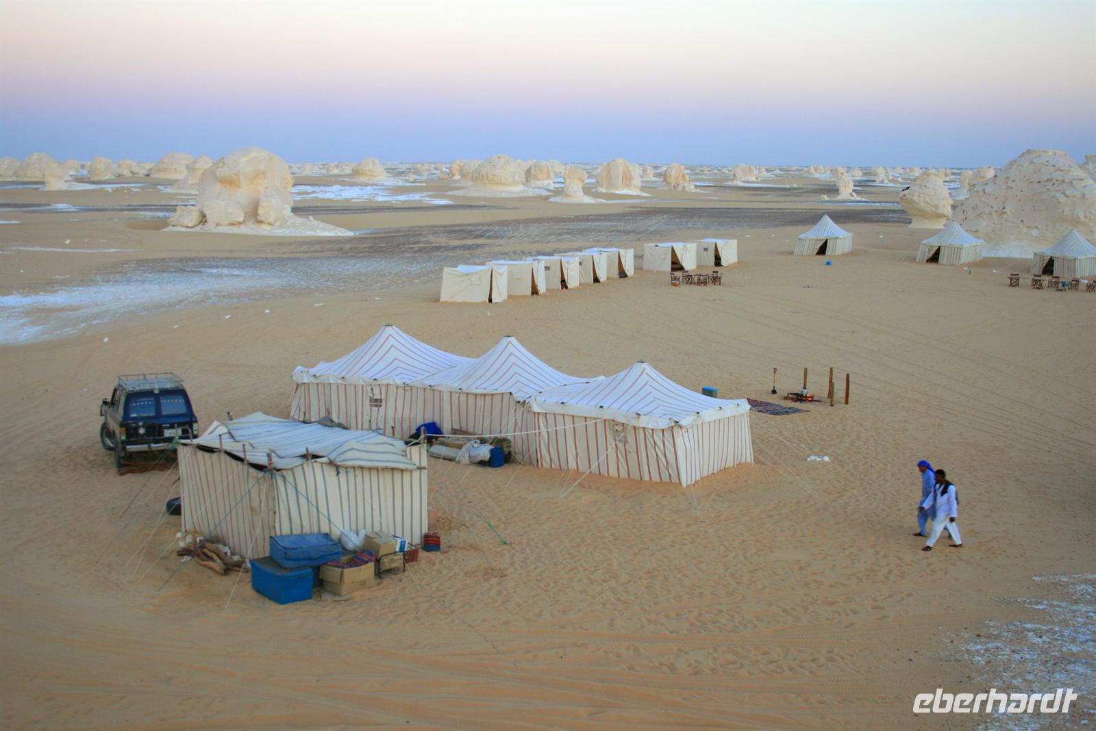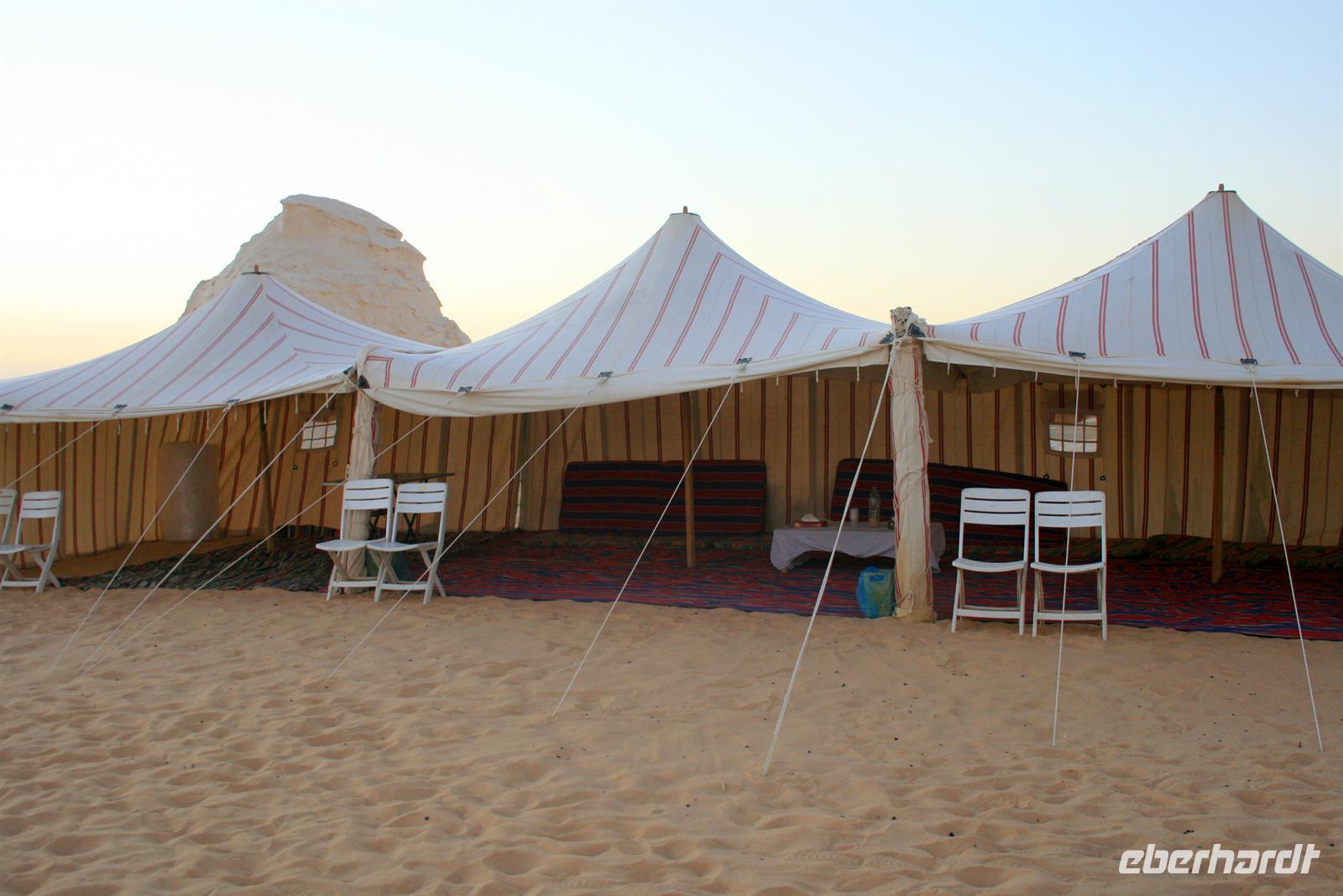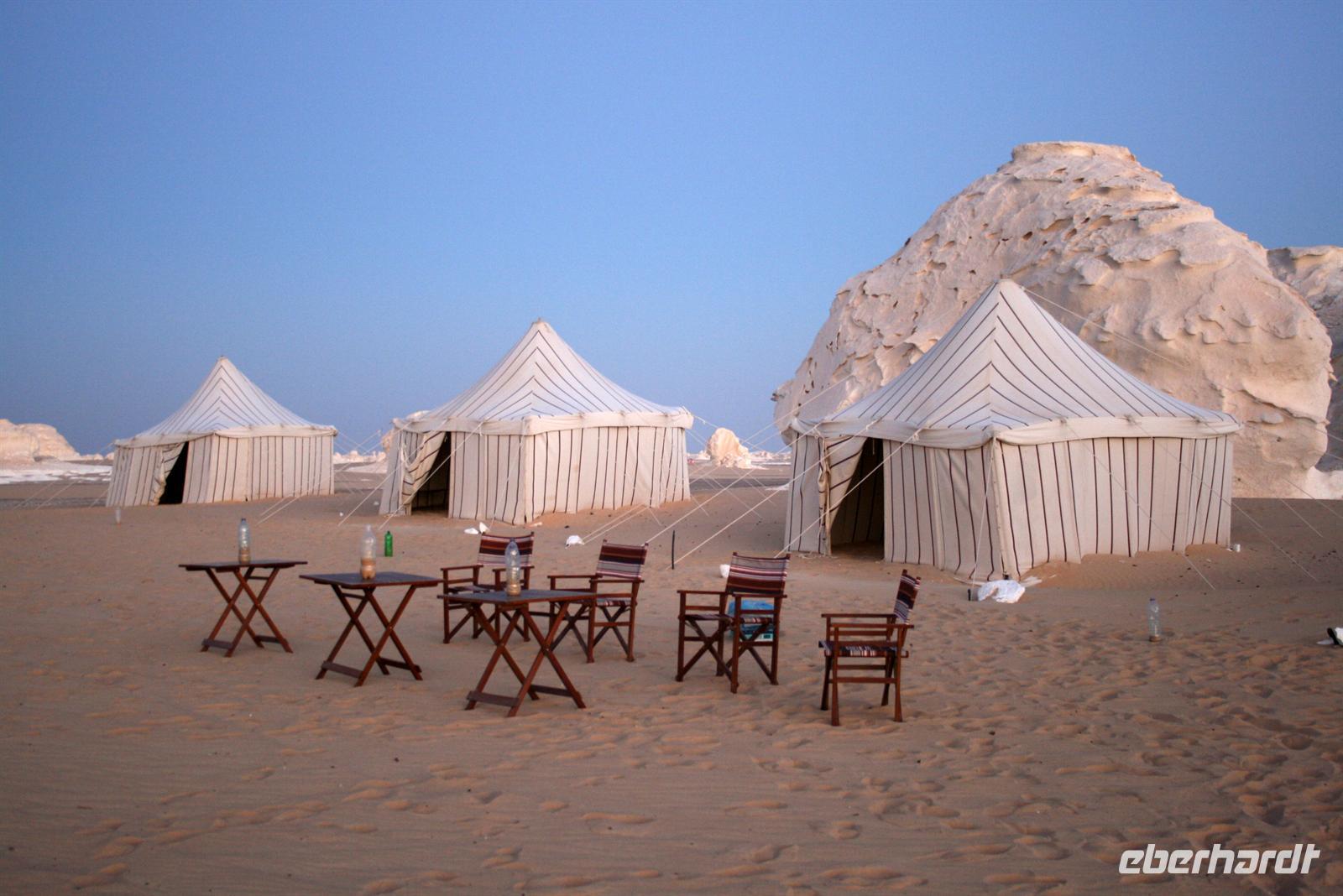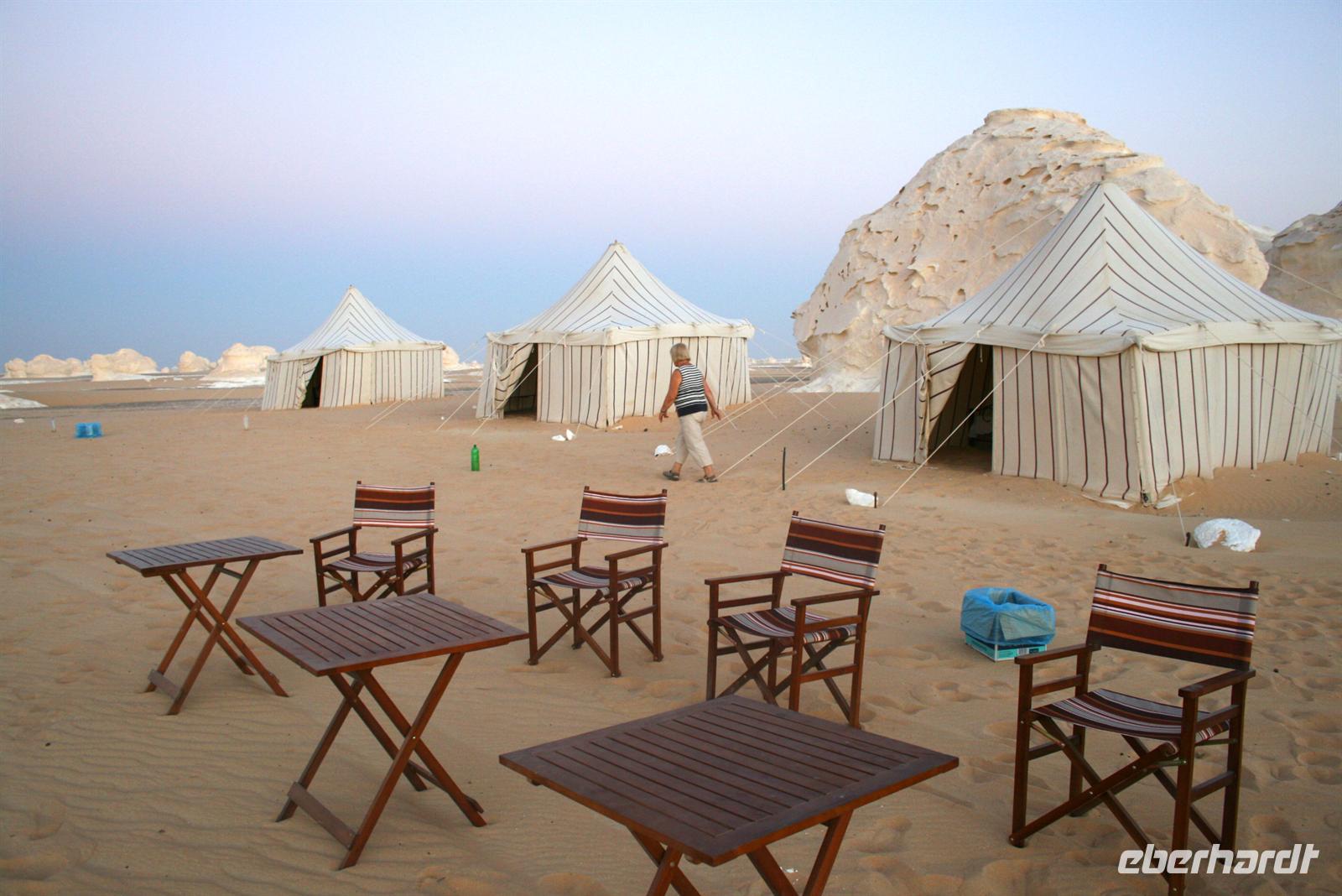 Kurz vor Sonnenuntergang erreichen wir unser Zeltcamp inmitten der Weißen Wüste. Alles ist schon aufgebaut und vorbereitet, nur für unsere kleine Reisegruppe. Mehr als 160 Kilometer wurden die großen Zelte, die Ausrüstung und die Lebensmittel für uns bis hier her transportiert. Die Zelte sind sehr geräumig, mit Teppich ausgelegt und mit je einer oder zwei Klappliegen und einem kleinen Tisch ausgestattet. Wir schlafen also nicht auf dem Boden, sondern auf Liegen, die mit Matratzen, Bettlaken, Kissen und Steppdecken bezogen sind. Außerdem steht ein kleines Zelt mit Chemie-Toilette zur Verfügung und Kanister mit Wasser zum Waschen. Das Camp-Personal bringt auf Wunsch das Reisegepäck in das private Zelt. Man braucht auf nichts zu verzichten.