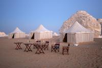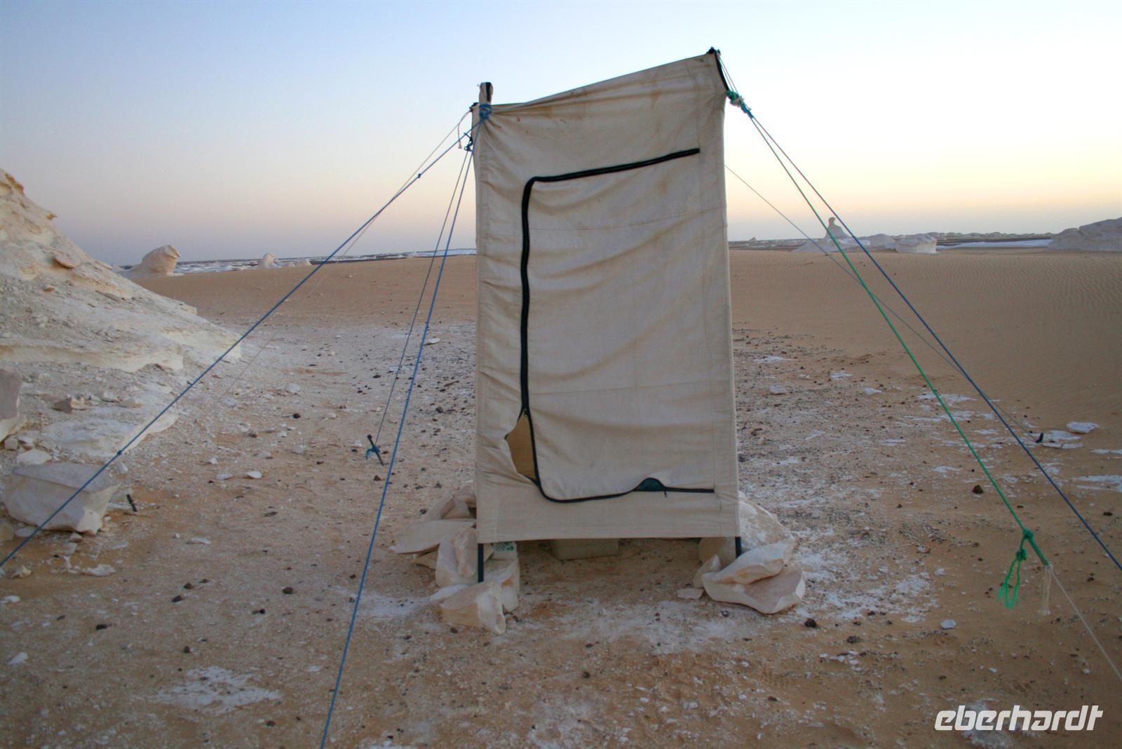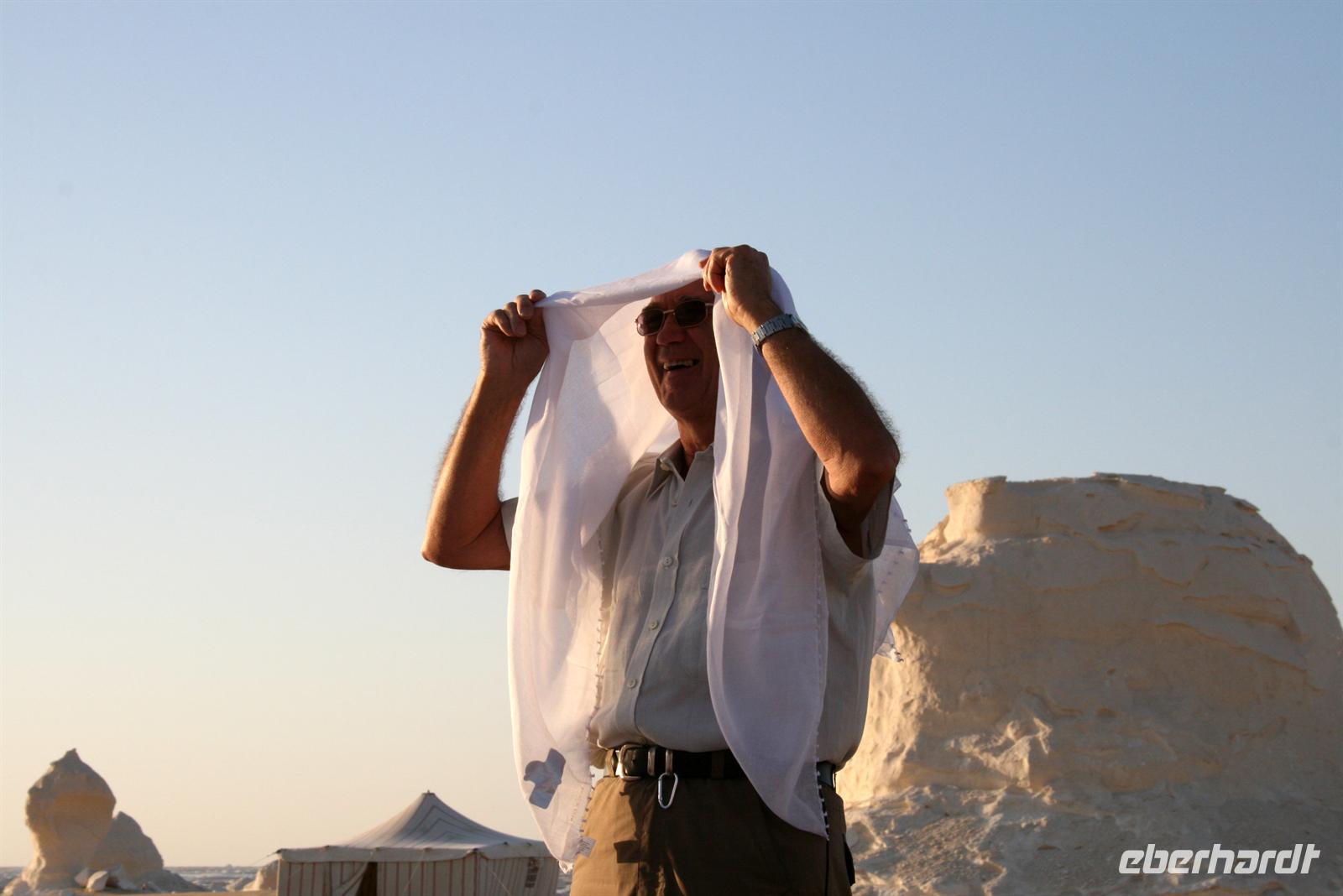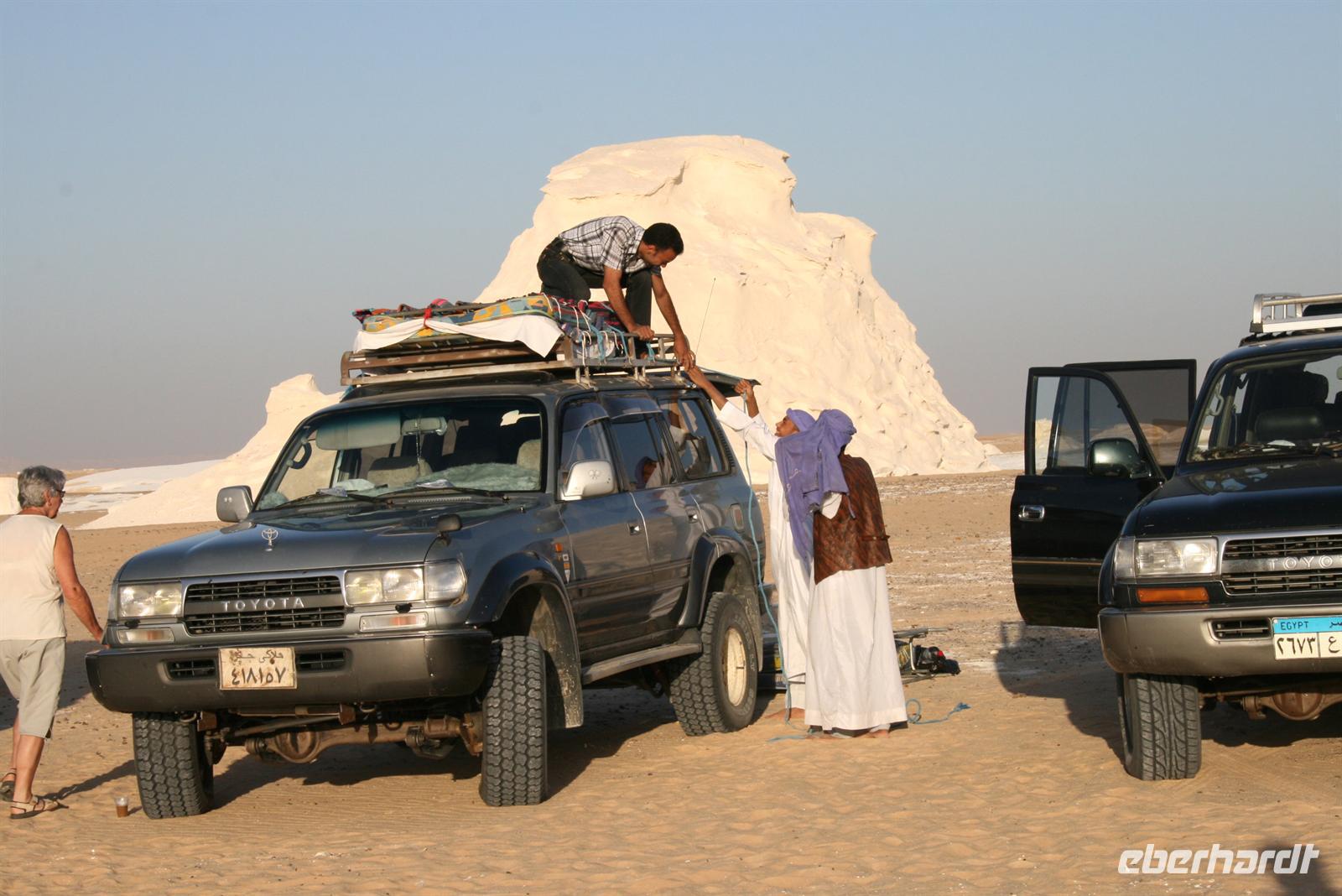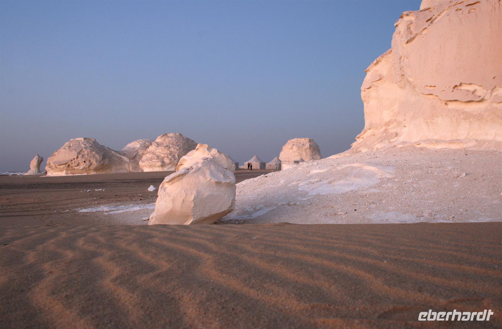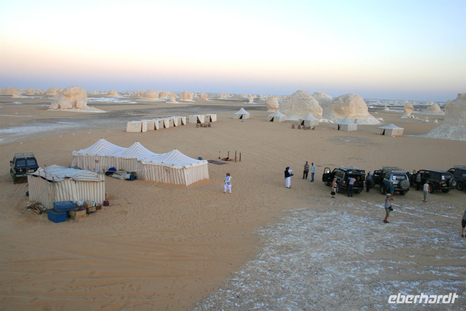 Kurz vor Sonnenuntergang erreichen wir unser Zeltcamp inmitten der Weißen Wüste. Alles ist schon aufgebaut und vorbereitet, nur für unsere kleine Reisegruppe. Mehr als 160 Kilometer wurden die großen Zelte, die Ausrüstung und die Lebensmittel für uns bis hier her transportiert. Die Zelte sind sehr geräumig, mit Teppich ausgelegt und mit je einer oder zwei Klappliegen und einem kleinen Tisch ausgestattet. Wir schlafen also nicht auf dem Boden, sondern auf Liegen, die mit Matratzen, Bettlaken, Kissen und Steppdecken bezogen sind. Außerdem steht ein kleines Zelt mit Chemie-Toilette zur Verfügung und Kanister mit Wasser zum Waschen. Das Camp-Personal bringt auf Wunsch das Reisegepäck in das private Zelt. Man braucht auf nichts zu verzichten.