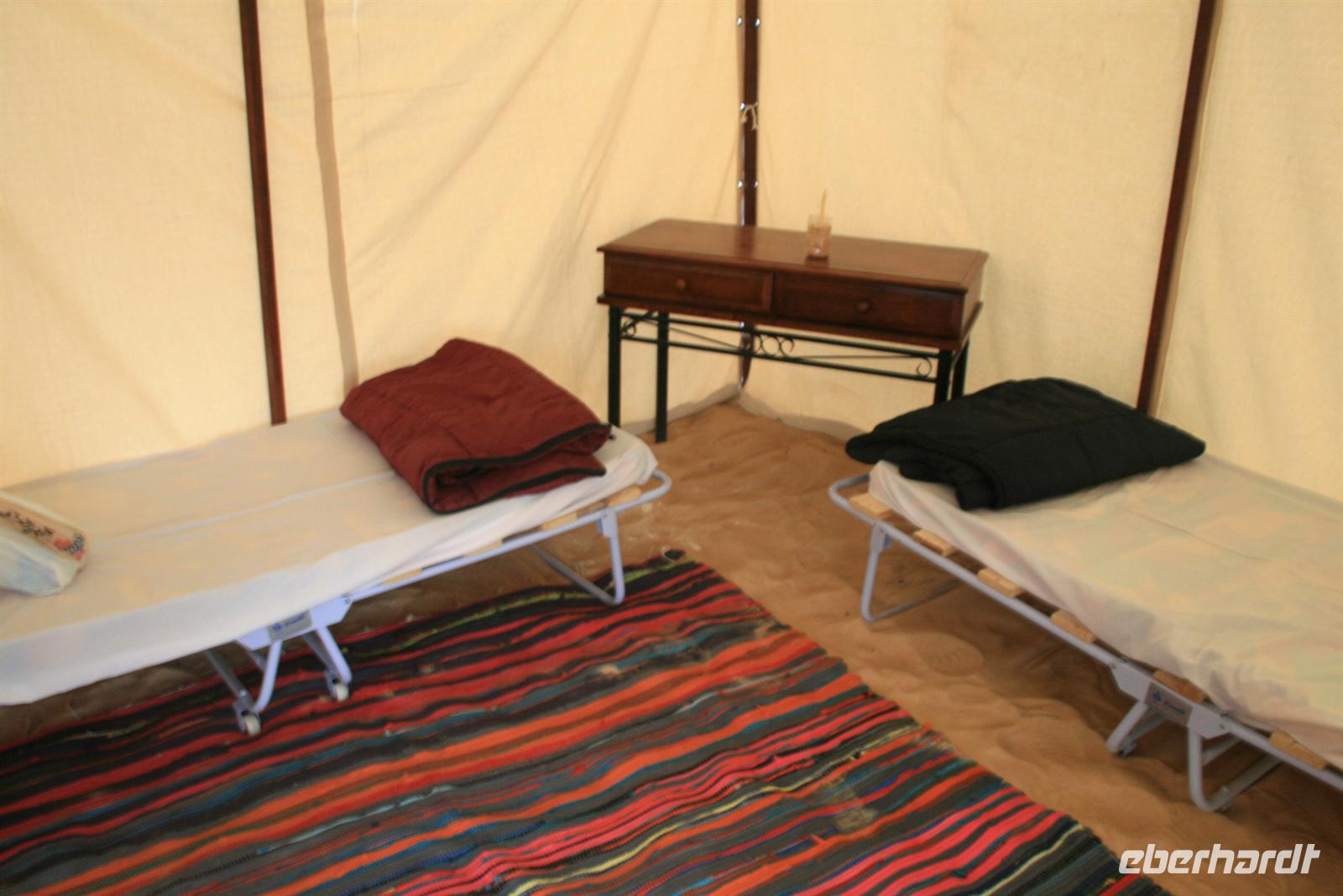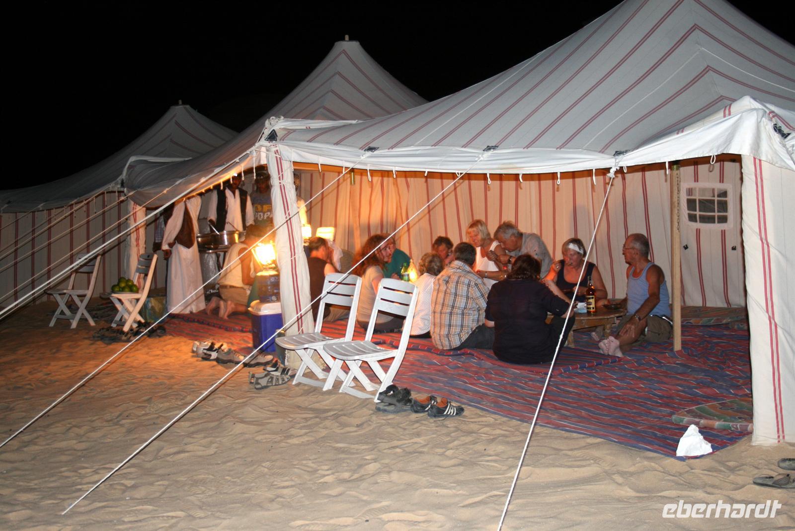 Lange sitzen wir noch draußen unter freiem Himmel, bevor wir uns schließlich in unsere Zelte zurückziehen. Die Temperatur fällt nachts ein ganzes Stück. Bei uns waren es schätzungsweise 15°C in der Nacht. Man sollte lieber ein paar warme Sachen bereit legen. Auch eine Taschenlampe ist empfehlenswert, denn in der Wüste ist es wirklich stockdunkel.