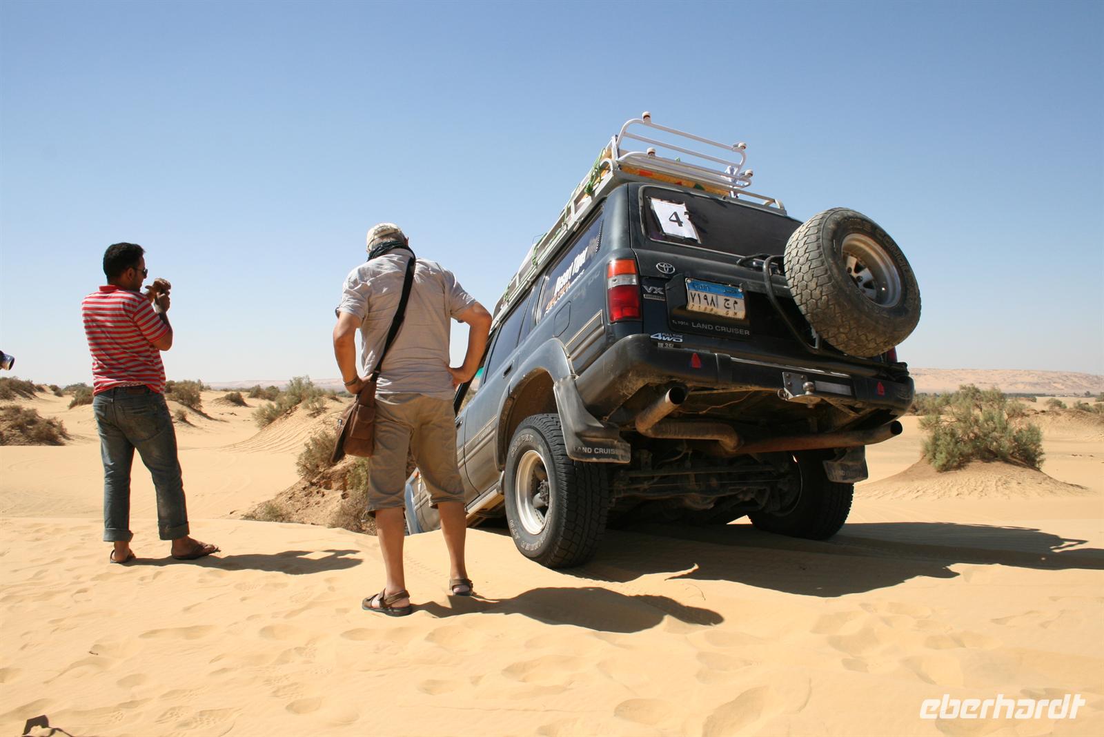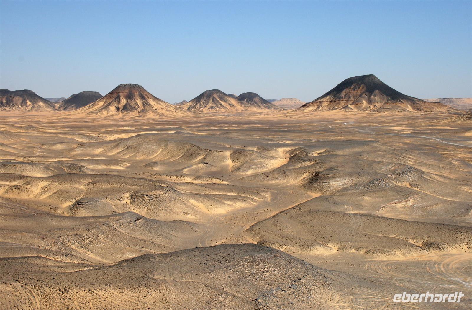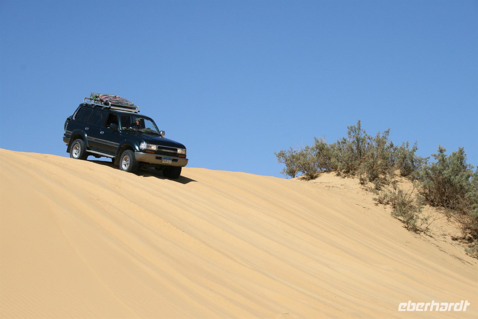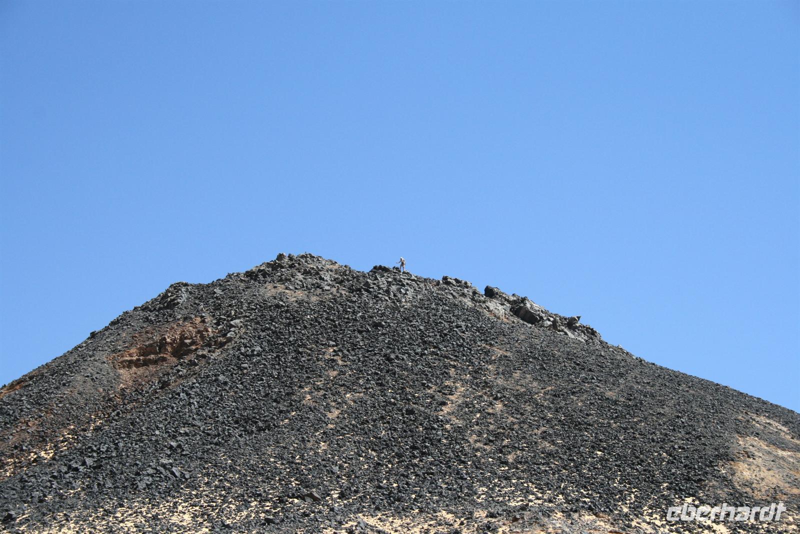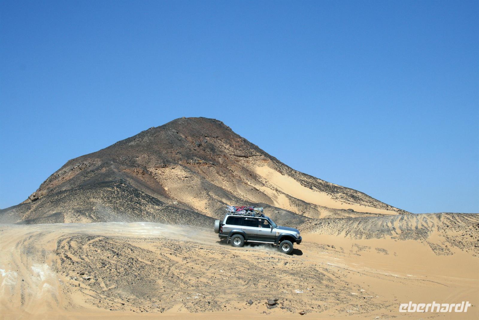 Wieder ändert sich das Aussehen der Wüste. Nun ist das Gestein eher schwarz, denn es ist vulkanischen Ursprungs. Daher wird dieser Teil der ägyptischen Wüste auch Schwarze Wüste genannt. Den nächsten Halt machen wir an einer der größten Sanddünen. Sie ist ungefähr 50 Meter hoch und die meisten von uns erklimmen die Düne entlang des Kammes.