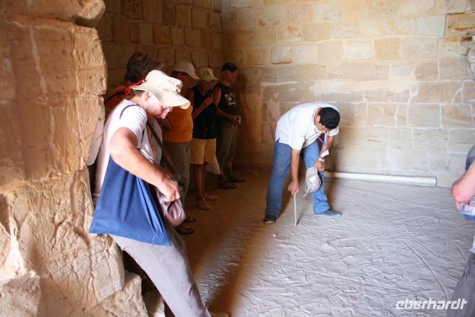 Von hier oben können wir wunderbare Fotos machen. Durch die Schwarze Wüste gelangen wir schließlich zur Oase Bahareya und unser Hotel „Bawity“. Wie eine Art Höhlenhotel scheint die Anlage direkt aus dem Fels gehauen zu sein. Die Gebäude und Terrassen wurden aus großen Felssteinen gemauert. Dadurch wirkt die kleine Hotelanlage sehr urig und landestypisch. Wir freuen uns nach der Nacht in der Wüste natürlich erstmal auf eine wohltuende Dusche. Die Zimmer sind sehr groß und urig, aber einfach eingerichtet. Fernseher, Telefon und Klimaanlage gibt es nicht, dafür aber Ventilatoren und gemütliche Sitzgruppen auf den Terrassen vor den Zimmern. Nach dem Mittagessen in dem kleinen Hotelrestaurant und nachdem wir uns alle ein wenig frisch gemacht haben, starten wir am Nachmittag zu einer kleinen Besichtigungstour rund um die Oase Bahareya. Wir besuchen die Sammlung der Goldenen Mumien und zwei Grabanlagen, in denen man schöne Grabmalereien bewundern kann. In den Gräbern liegen keine Könige, sondern Adlige, die zu Zeiten der alten Ägypter scheinbar einen hohen Rang hatten und sich solche Grabanlagen leisten konnten. Durch enge, niedrige Gänge steigen wir hinunter.