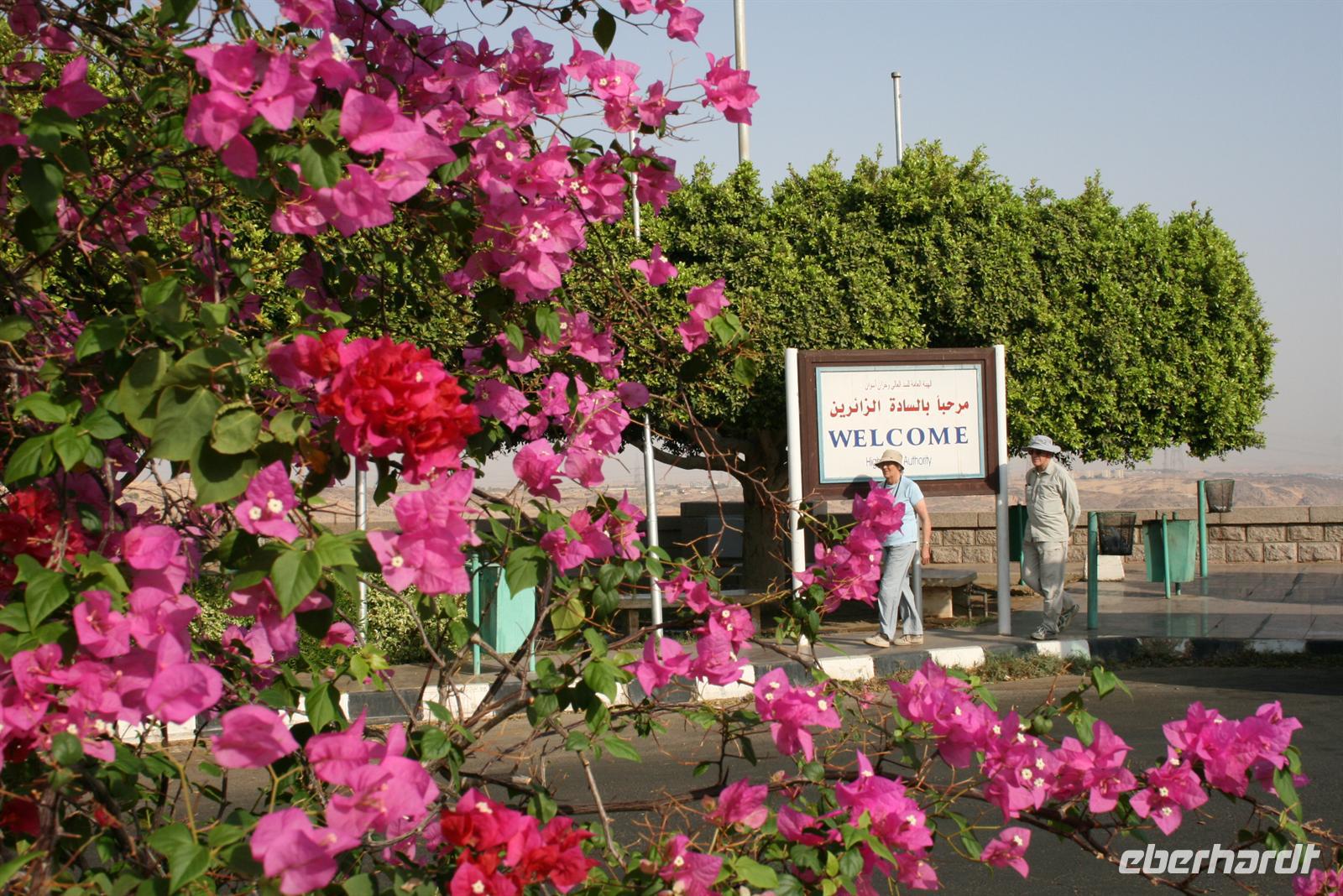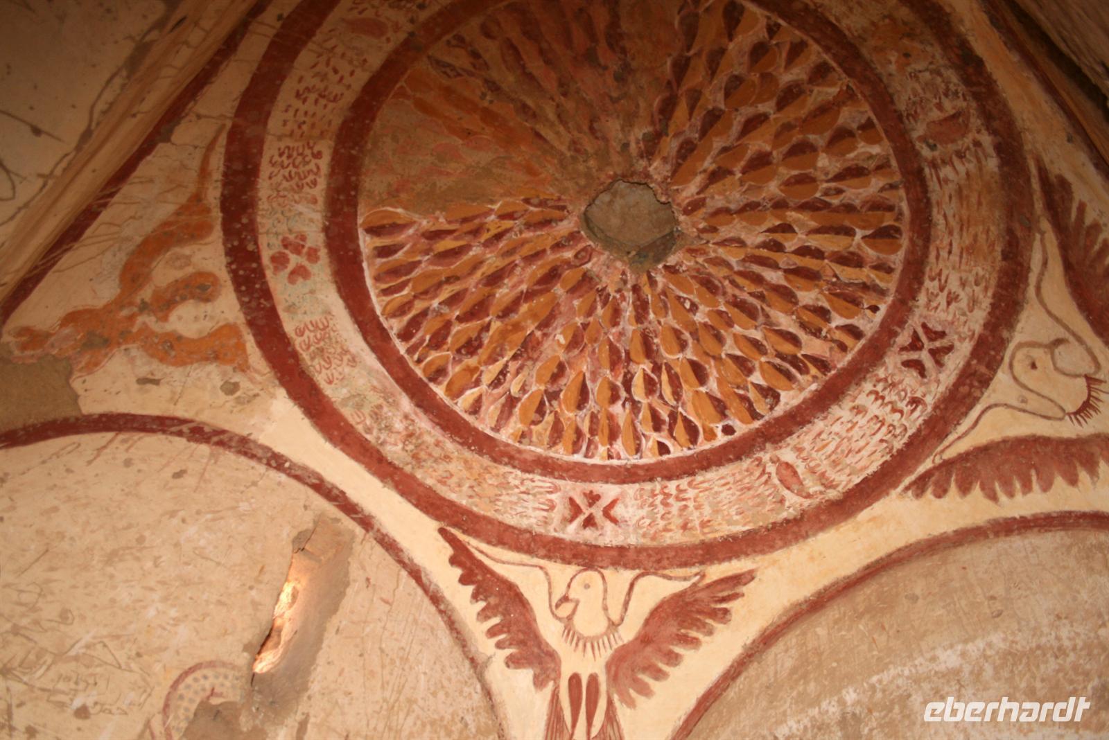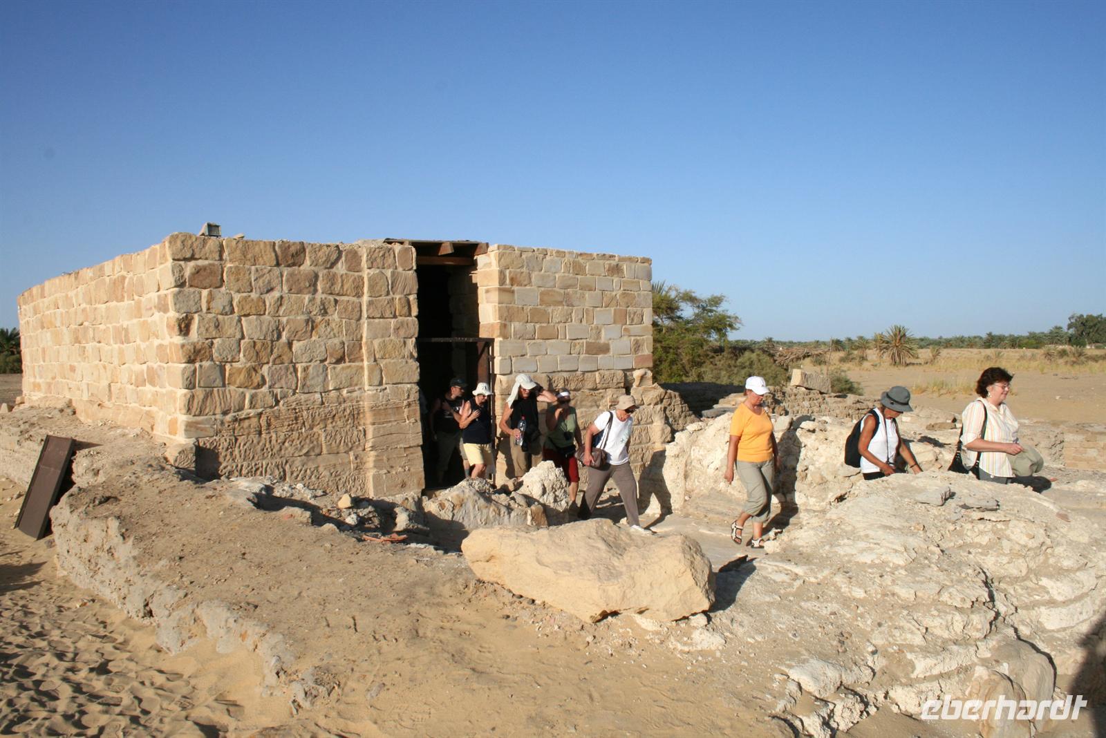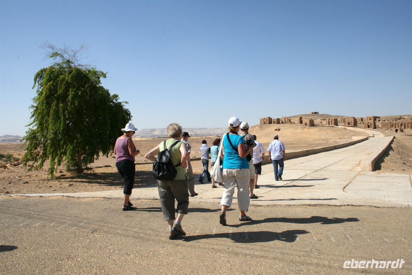 Nach dem Mittagssnack heißt es Hände waschen in der heißen Quelle. Dann besichtigen wir mit unserem Reiseleiter Aladin den alten christlichen Friedhof von Bagawat. Er ist einer der ältesten christlichen Friedhöfe der Welt aus dem 3. bis 6. Jahrhundert. Wir bestaunen die Grabkapellen, die im Inneren mit christlichen Motiven bemalt sind. Das Gelände liegt auf einer Anhöhe und ist sehr weitläufig, nicht zu vergleichen mit den Friedhöfen, wie wir sie heutzutage kennen. Nur ein paar hundert Meter entfernt befindet sich der Hibis-Tempel, den wir aufgrund von Restaurierungsarbeiten allerdings nicht besichtigen können.