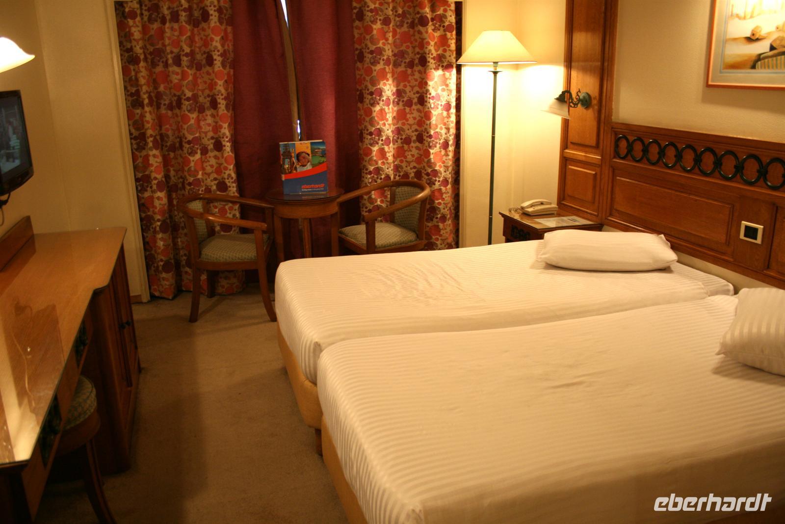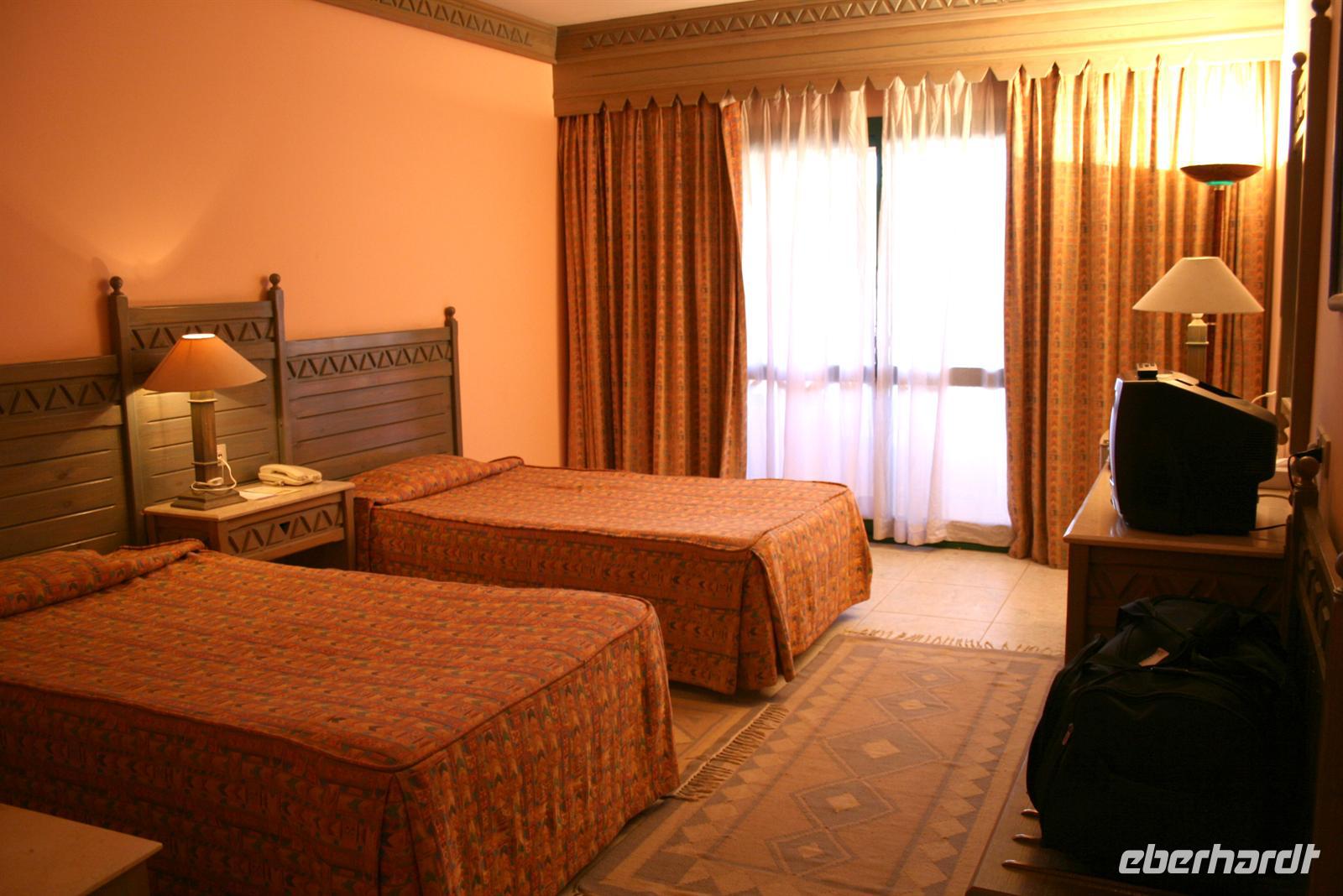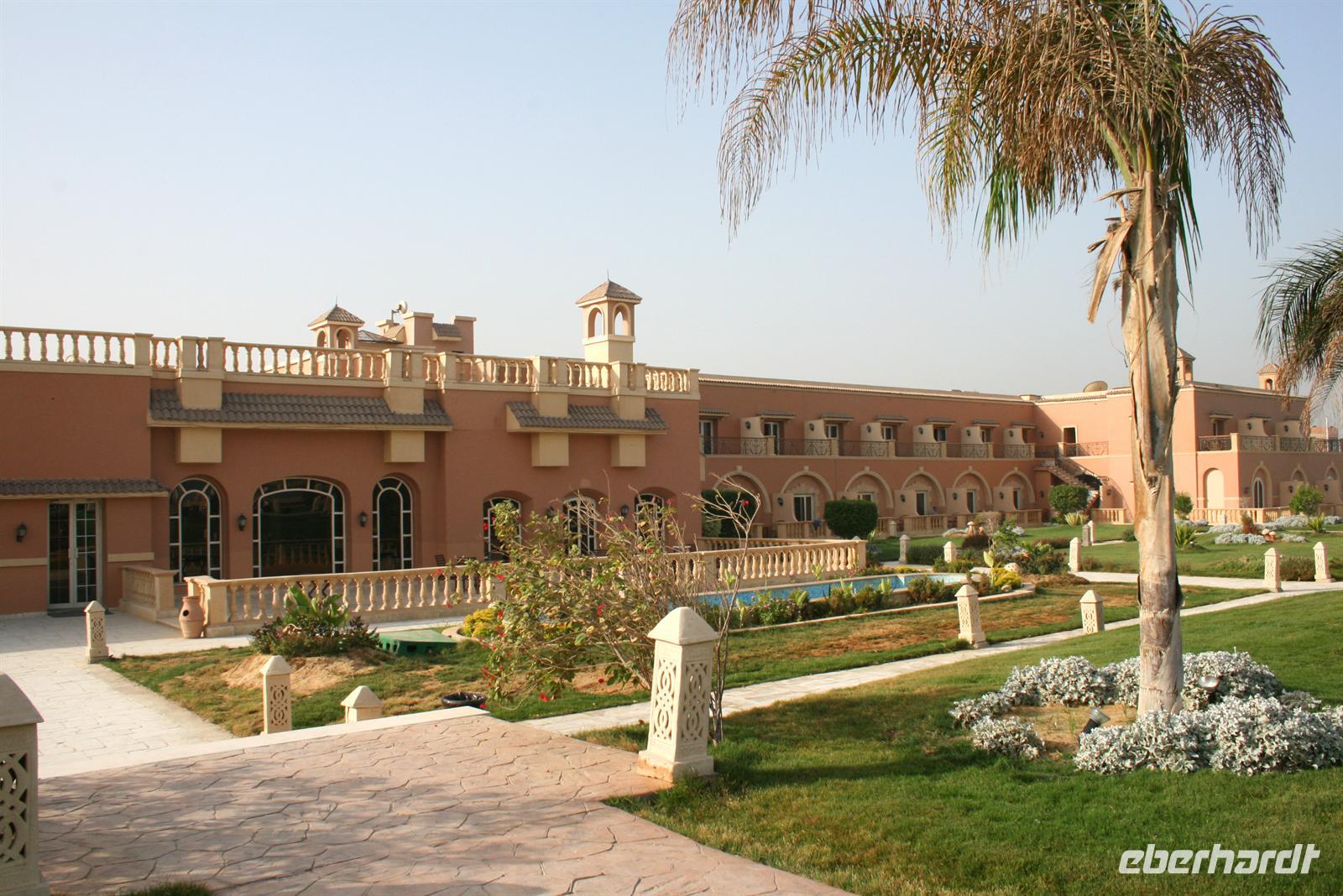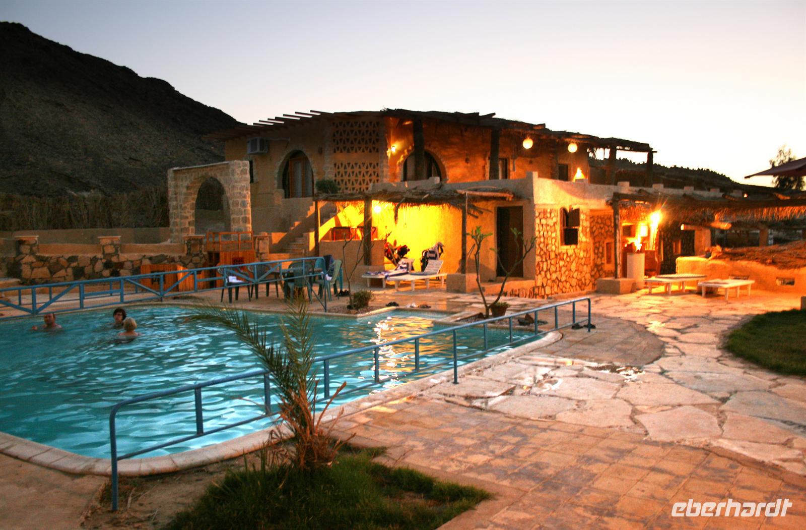 Am Nachmittag beziehen wir unser 4-Sterne-Hotel „Pioneer“ in der Oase Kharga. Wir hatten nicht erwartet, hier so ein modernes und gut ausgestattetes Hotel vorzufinden. Alle sind angenehm überrascht. Die Zimmer sind groß und komfortabel eingerichtet mit Bad/WC, Telefon, TV, Minibar und Klimaanlage. Im Innenhof der Hotelanlage gibt es eine große Grünfläche mit einem großen Pool, den einige von uns gleich für ein erfrischendes Bad nutzen.