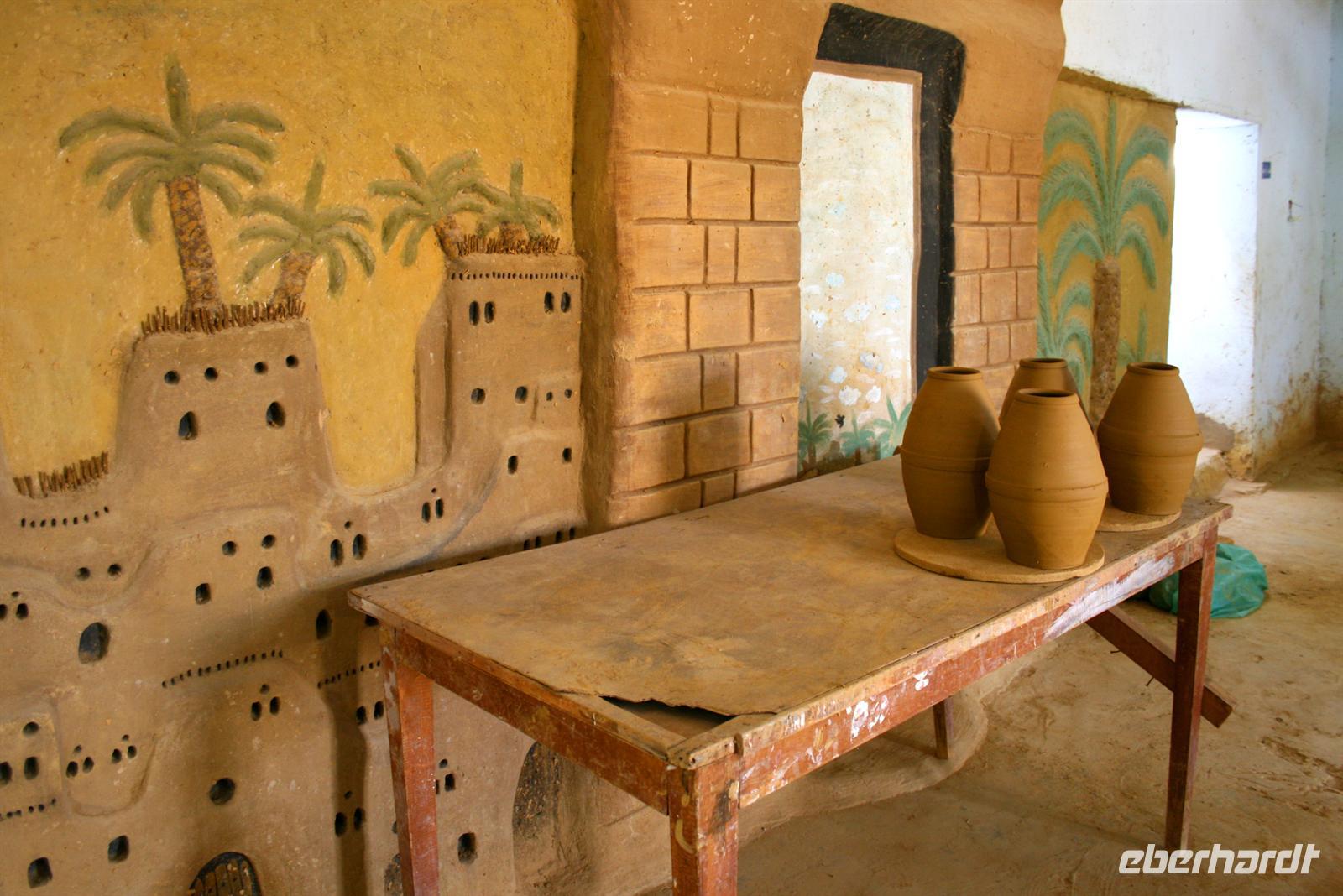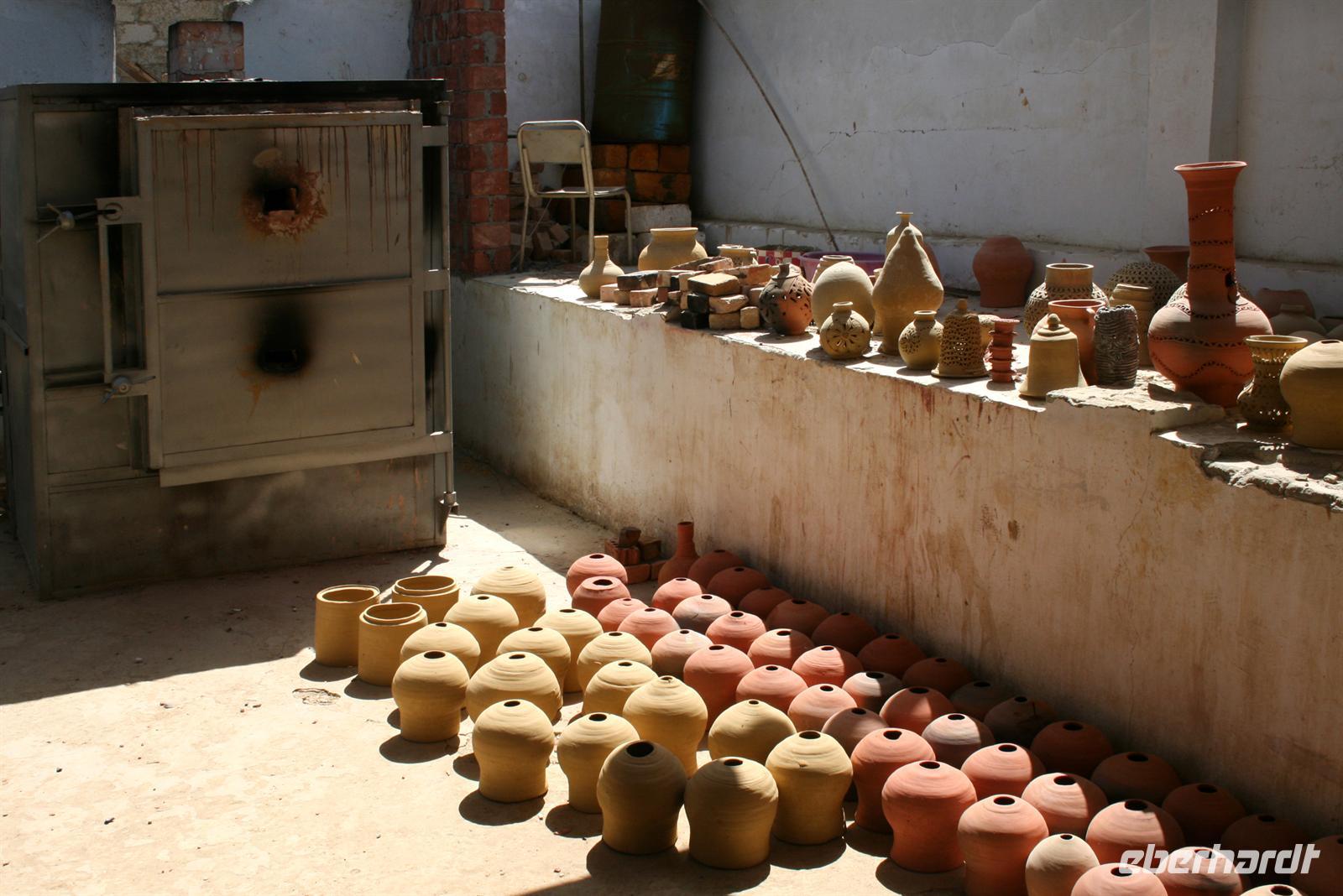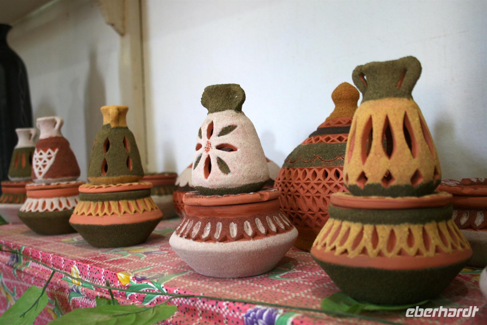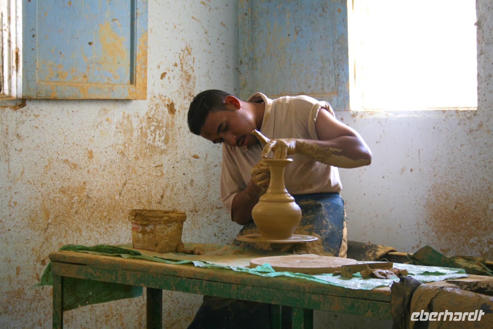 Wir besuchen eine kleine Töpferei, in der uns die Mitarbeiter das Töpfern und das Bemalen und Verzieren der traditionellen Tongefäße vorführen. Alles wird hier wieder in Handarbeit hergestellt. In einem kleinen Laden können wir für ganz wenige ägyptische Pfund wunderbare Souvenirs kaufen - Vasen, Schalen und Dosen aus terrakottafarbenem oder bunt bemaltem Ton.