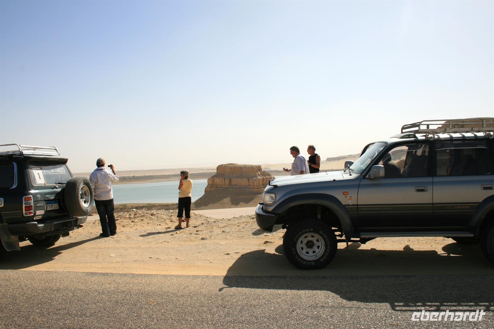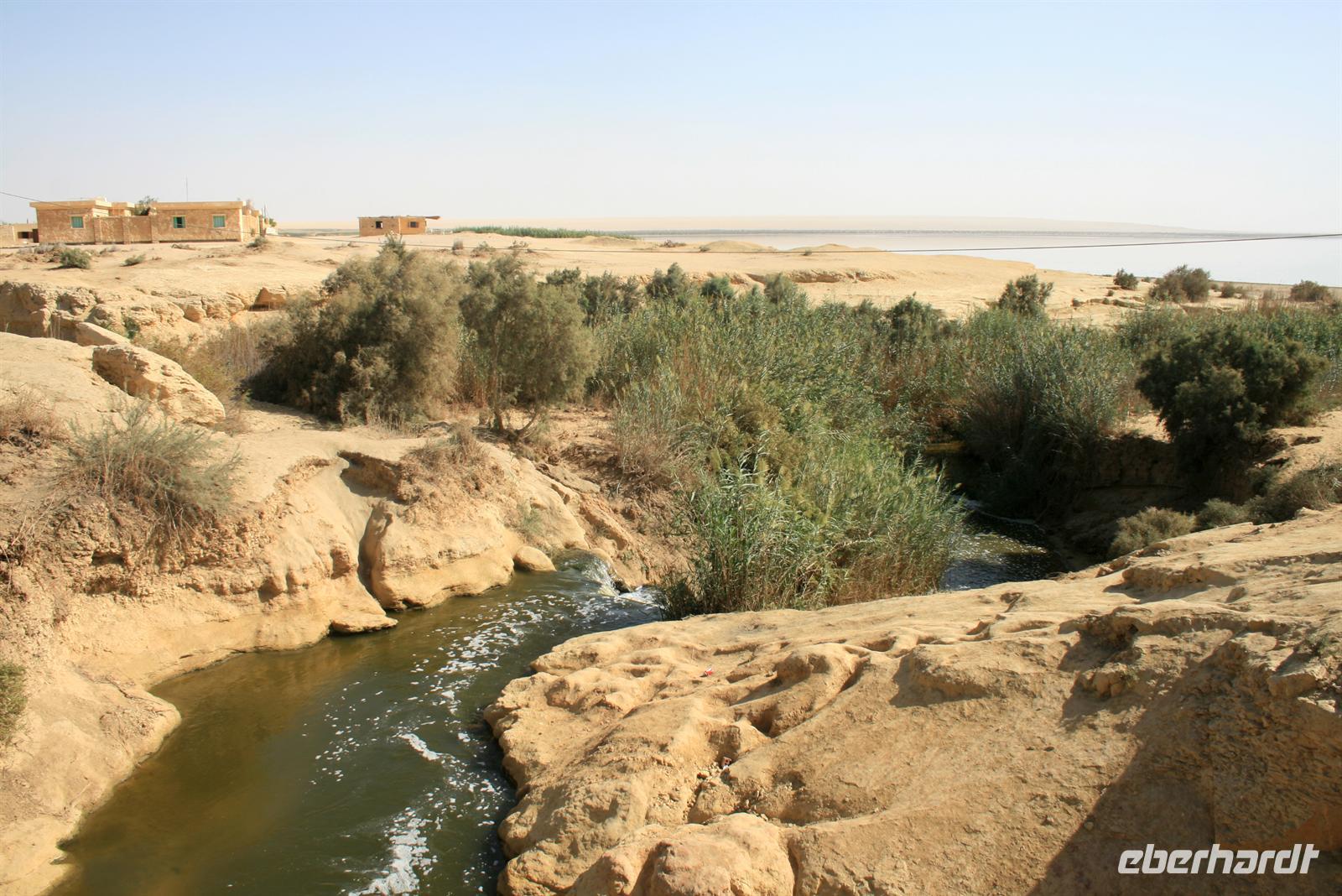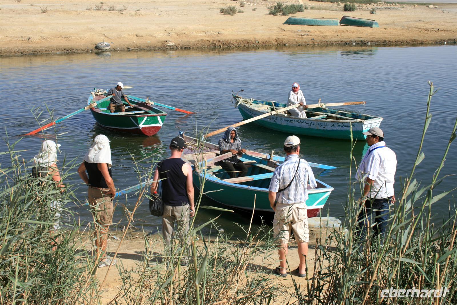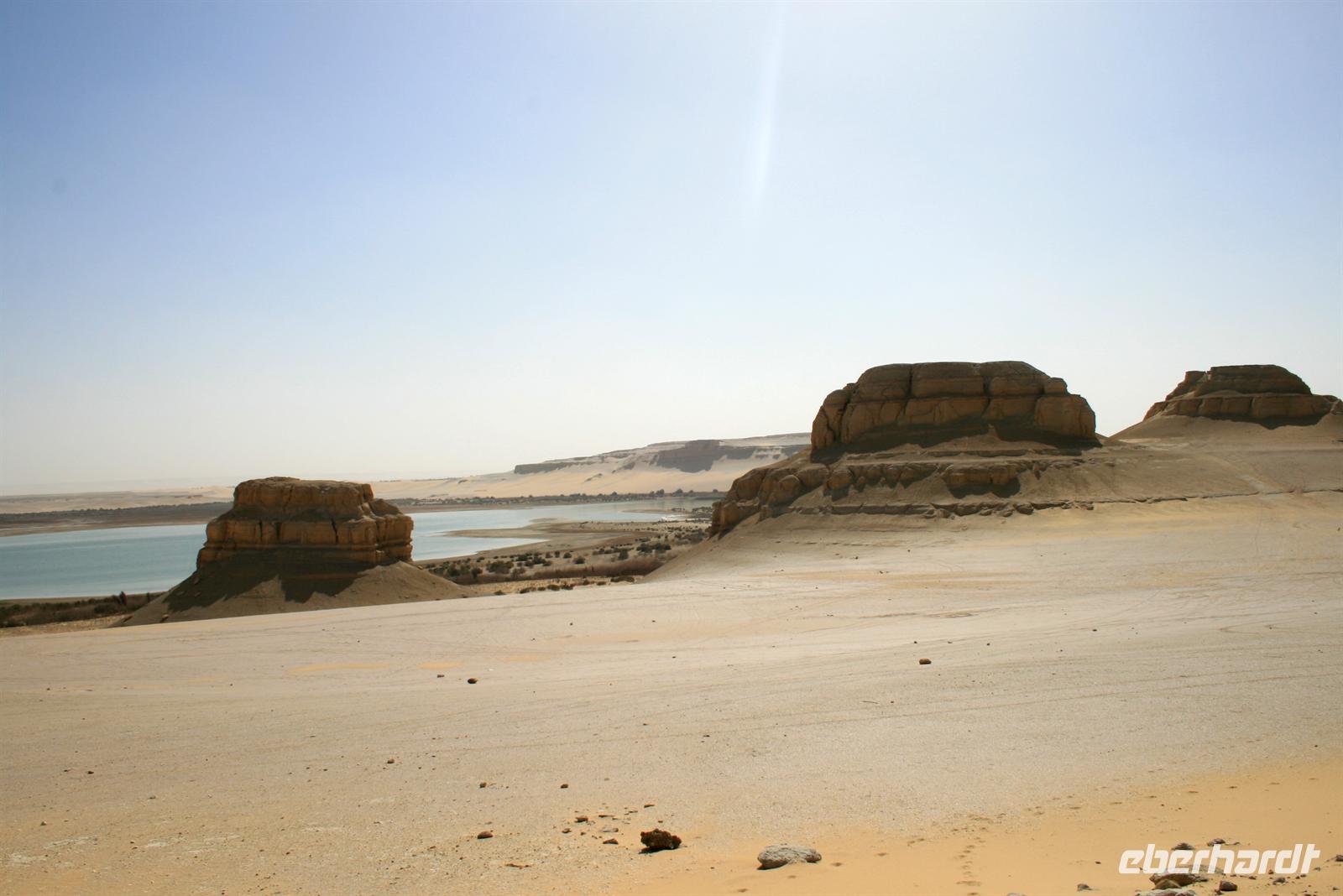 Nach einer weiteren Stunde Fahrt durch die beeindruckende Wüstenlandschaft gelangen wir zum Wadi Hitan - eine kleine Siedlung aus ein paar Häusern inmitten der Wüste, im so genannten Waltal. Dieses Tal heißt so, weil hier zahlreiche maritime Fossilien gefunden wurden. Auf einem Rundgang kann man die Funde bestaunen: das Skelett eines Wals, Dinosaurier-Knochen, versteinerte Mangroven-Bäume und Fossilien von anderen Meeresbewohnern. Zum Mittag gibt es heute ein Lunchpaket mit belegten Brötchen, Obst und Getränken. Nach einer halben Stunde Fahrt verlassen wir die Wüste und sehen den Qarun-See vor uns liegen. Wir besuchen den einzigen Wasserfall Ägyptens, der zugegebenermaßen ehr klein und nicht gerade wohlriechend ist J. Dennoch kann man von ihm in jedem Ägypten-Reiseführer lesen und wenn man schon einmal hier ist, lohnt sich ein kleiner Zwischenstopp. Mit einigen Fischern, die hier arbeiten unternehmen wir eine kleine Bootsfahrt mit einfachen Ruderbooten auf dem Qarun-See. In dem Café lassen wir uns ein kühles Getränk oder einen Tee schmecken.
