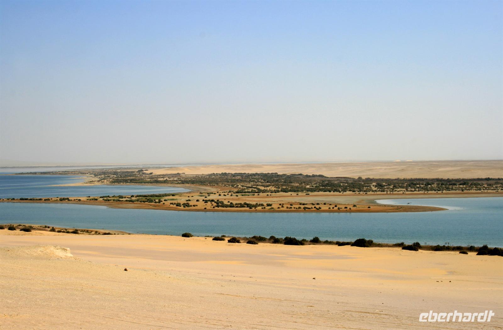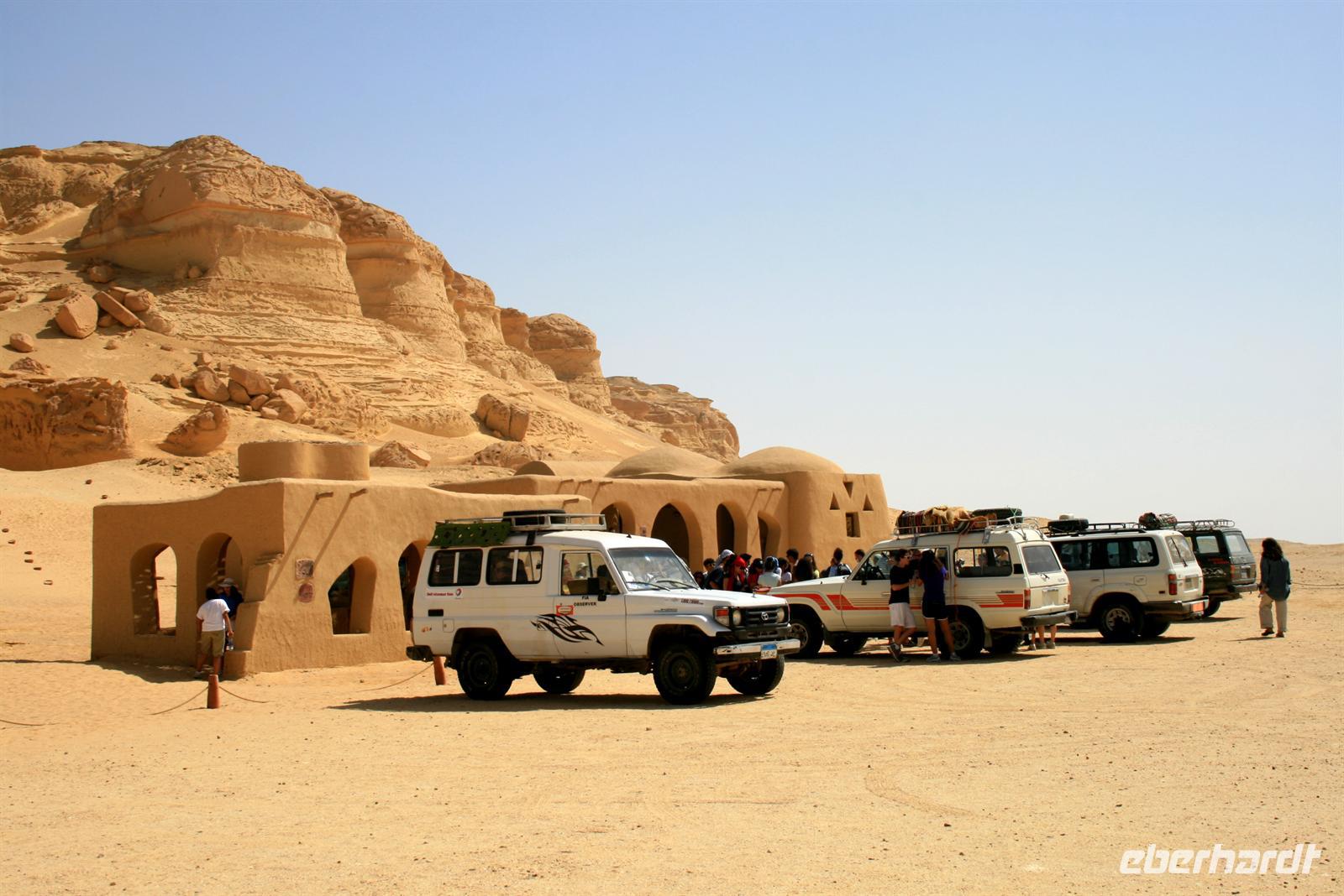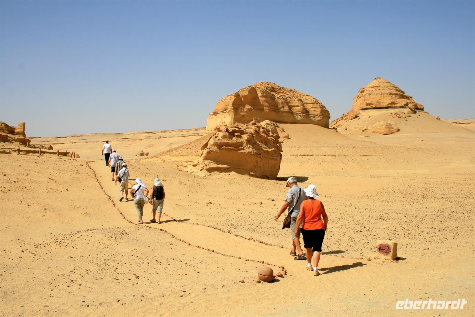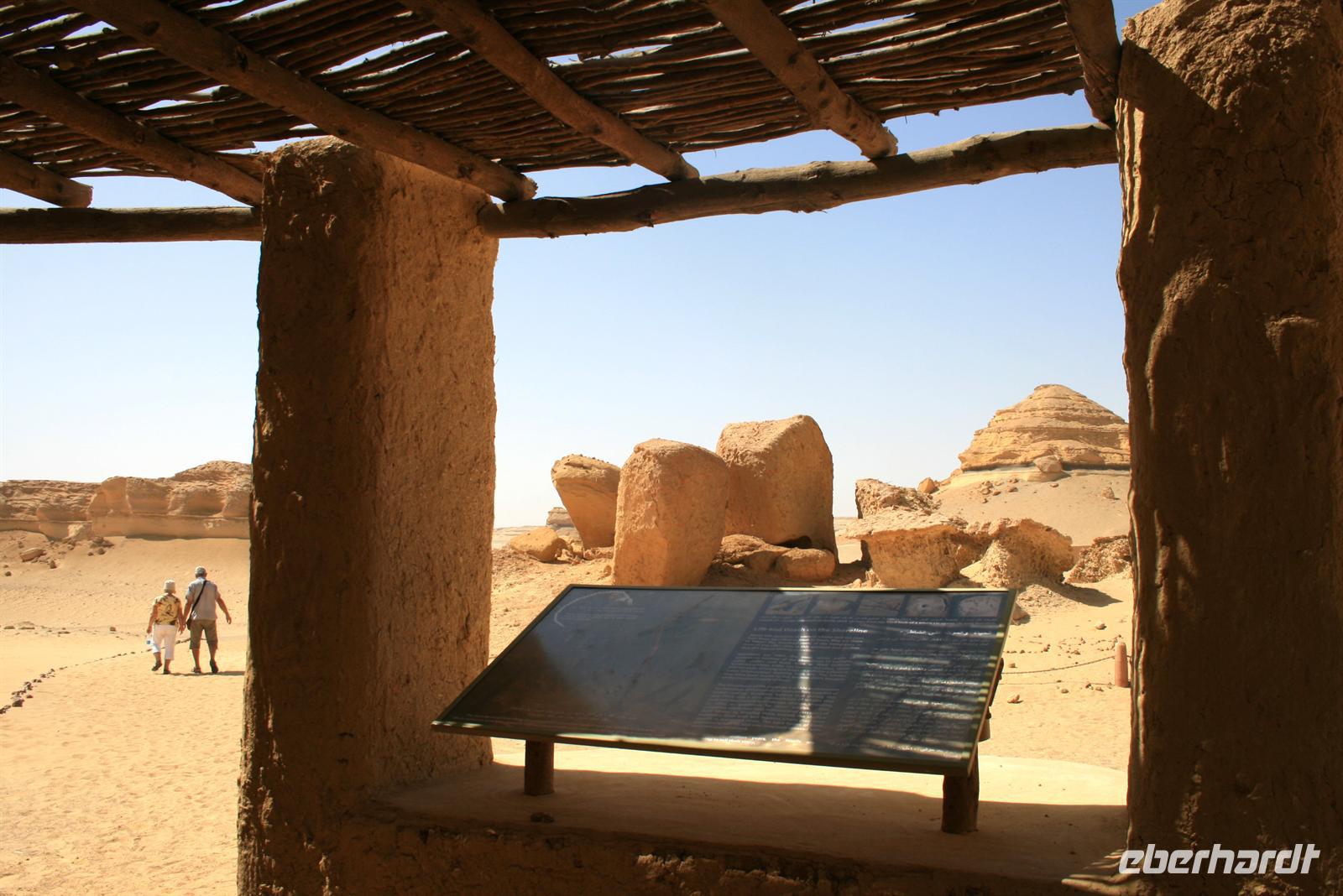 Nach einer weiteren Stunde Fahrt durch die beeindruckende Wüstenlandschaft gelangen wir zum Wadi Hitan - eine kleine Siedlung aus ein paar Häusern inmitten der Wüste, im so genannten Waltal. Dieses Tal heißt so, weil hier zahlreiche maritime Fossilien gefunden wurden. Auf einem Rundgang kann man die Funde bestaunen: das Skelett eines Wals, Dinosaurier-Knochen, versteinerte Mangroven-Bäume und Fossilien von anderen Meeresbewohnern. Zum Mittag gibt es heute ein Lunchpaket mit belegten Brötchen, Obst und Getränken. Nach einer halben Stunde Fahrt verlassen wir die Wüste und sehen den Qarun-See vor uns liegen. Wir besuchen den einzigen Wasserfall Ägyptens, der zugegebenermaßen ehr klein und nicht gerade wohlriechend ist J. Dennoch kann man von ihm in jedem Ägypten-Reiseführer lesen und wenn man schon einmal hier ist, lohnt sich ein kleiner Zwischenstopp. Mit einigen Fischern, die hier arbeiten unternehmen wir eine kleine Bootsfahrt mit einfachen Ruderbooten auf dem Qarun-See. In dem Café lassen wir uns ein kühles Getränk oder einen Tee schmecken.