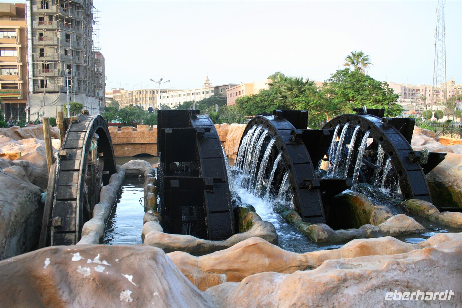 Am späten Nachmittag erreichen wir die Stadt Fayoum in der gleichnamigen Oase. Eigentlich ist Fayoum keine klassische Oase, denn das Wasser kommt nicht aus unterirdischen Quellen, sondern aus dem Qarun-See, der wiederum vom Nil gespeist wird. Wir fahren in die Innenstadt, die aus einem alten und einem modernen Stadtteil besteht. Wir statten den alten hölzernen Wasserrädern einen Besuch ab, die die Stadt schon früher über unterirdische Kanäle mit Wasser versorgten. Aladin erklärt uns alles Wissenswerte zum Kanalsystem und zur Stadt Fayoum.