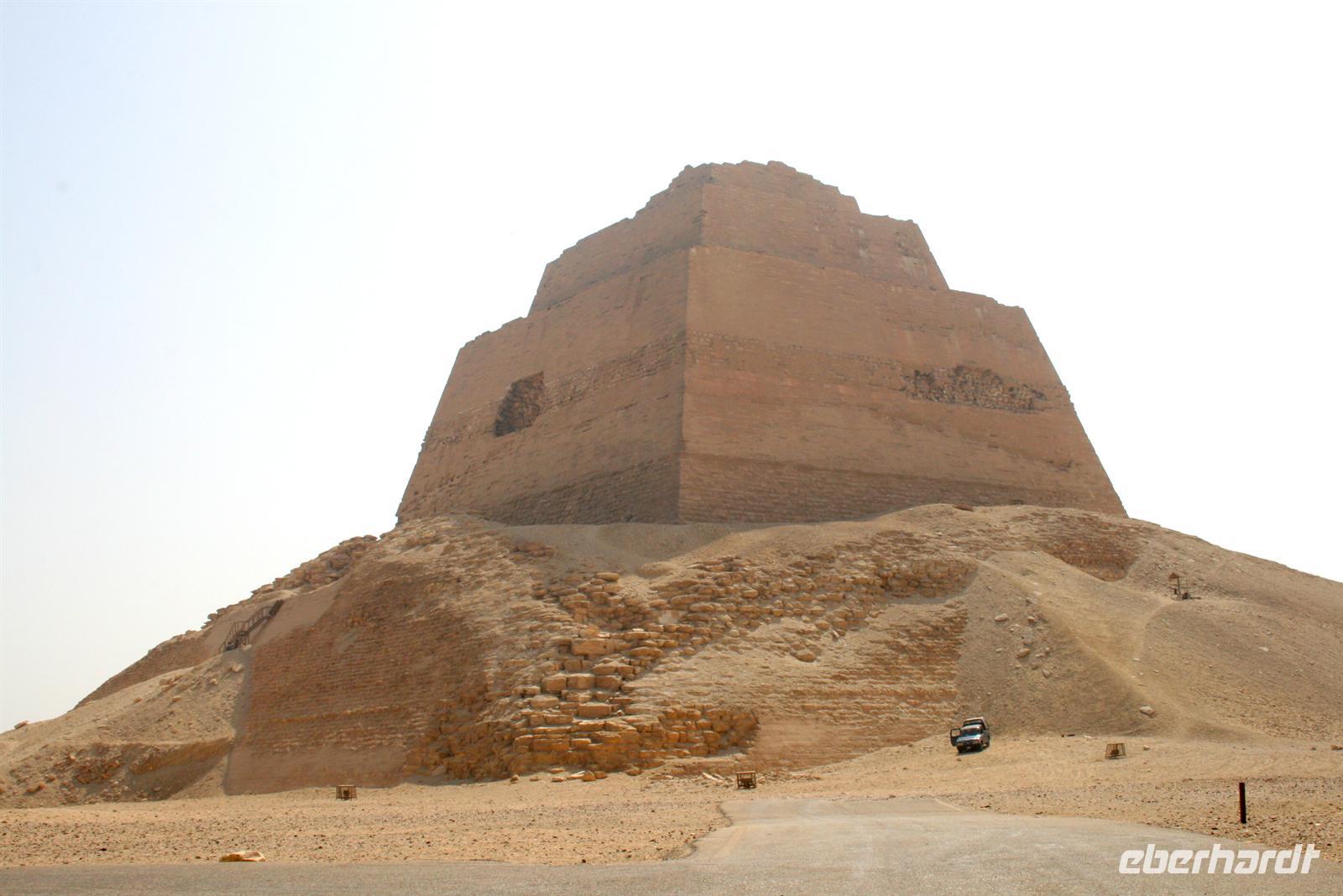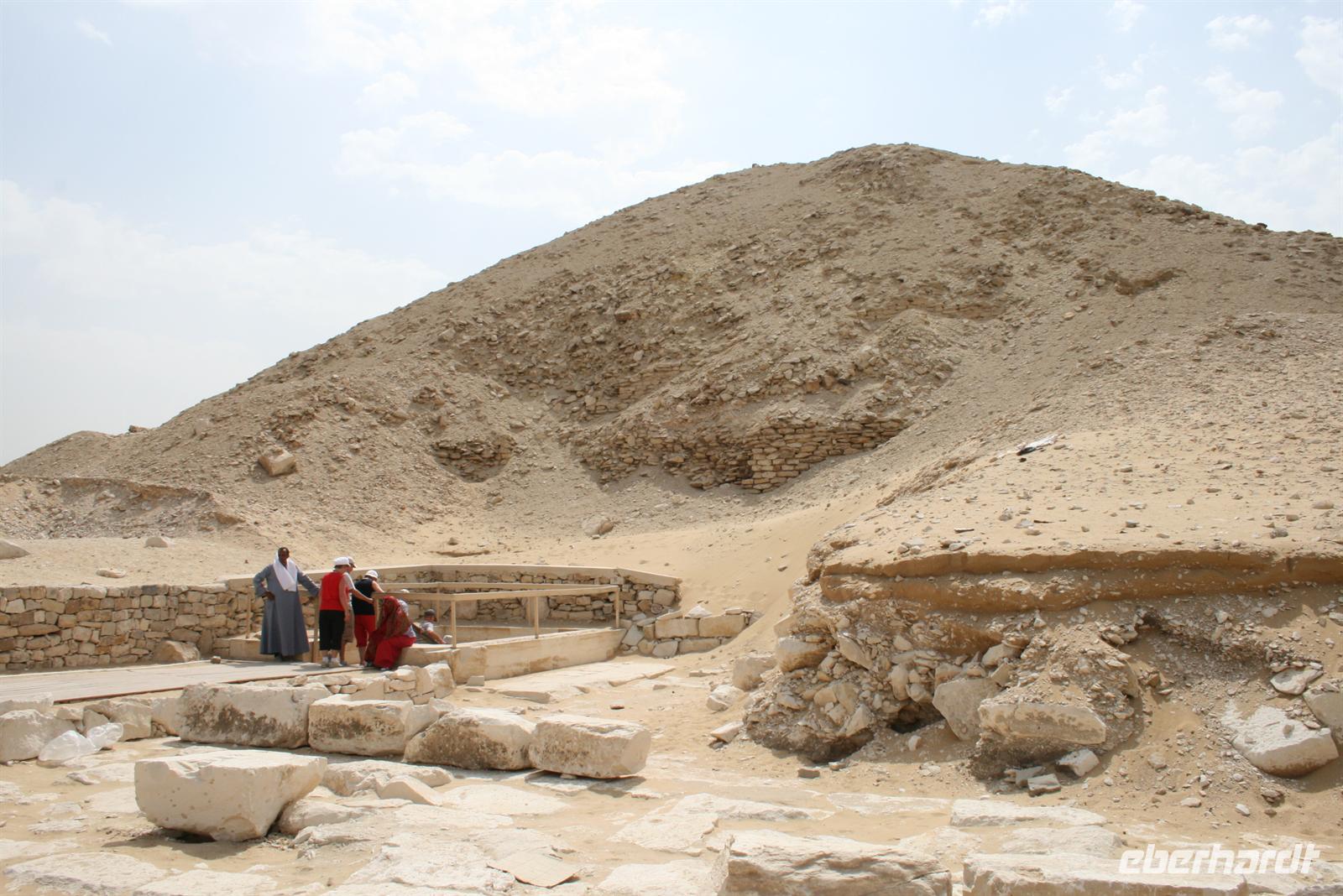 Heute ist leider schon der letzte Tag unserer Reise. Es geht weiter mit dem Reisebus. Da unser Flug erst am Nachmittag startet, nutzen wir den Vormittag für die Besichtigung der Pyramide von Meidum, welche etwa eine Stunde von Fayoum entfernt liegt. Die Pyramide ist ein Vorgänger der großen Pyramiden von Giseh, was man an der Stufen-Bauweise erkennt. Wer möchte, kann sogar in die Pyramide hinein gehen und hinunter in die Grabkammer steigen.
