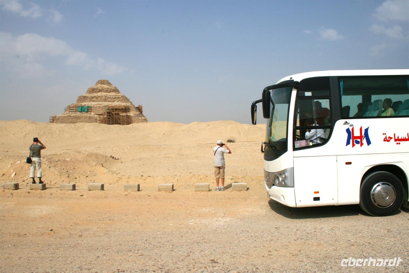 Mit dem Reisebus geht es nach Sakkara und in die alte Hauptstadt Unterägyptens nach Memphis. Der Fahrer hat natürlich genügend Wasser an Bord. Für einen Euro kann man jederzeit zwei 0,5 Liter Flaschen Mineralwasser kaufen. Viel Trinken ist bei den Temperaturen von 30 bis 38°C sehr wichtig!