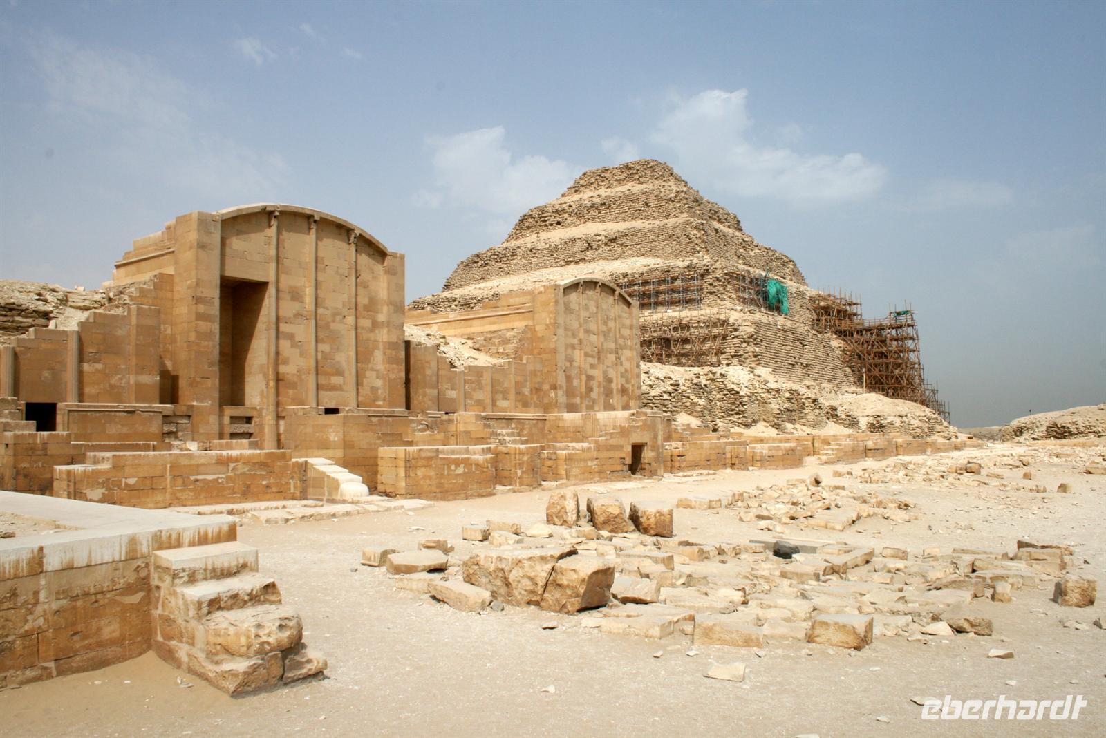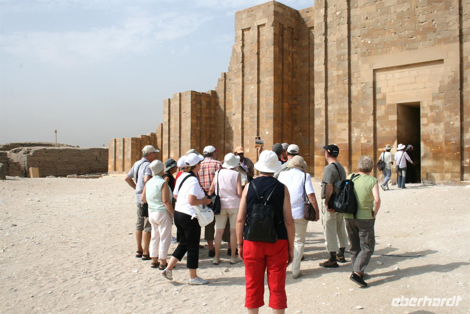 Unser erster Programmpunkt heute ist Sakkara mit dem Djoser-Tempel und der Stufenpyramide aus dem alten ägyptischen Reich. Aladin erklärt uns die Bauweise der Tempelanlage und der Pyramide, die als Vorform der großen Pyramiden von Giseh gilt.
