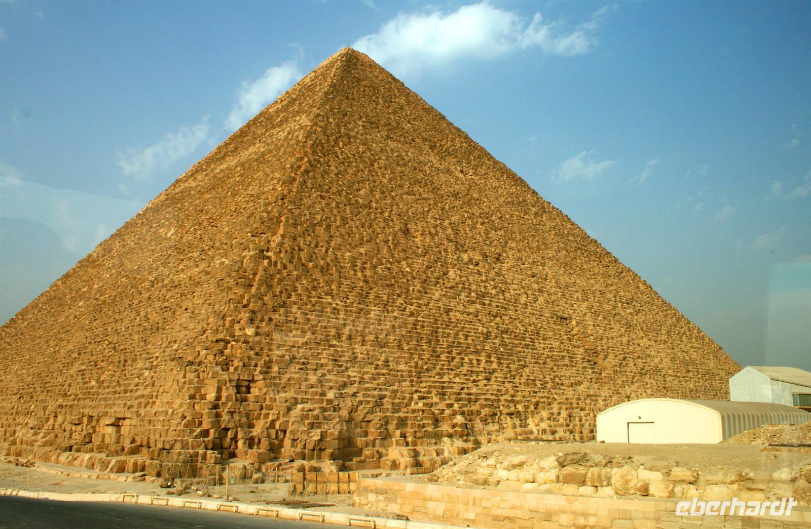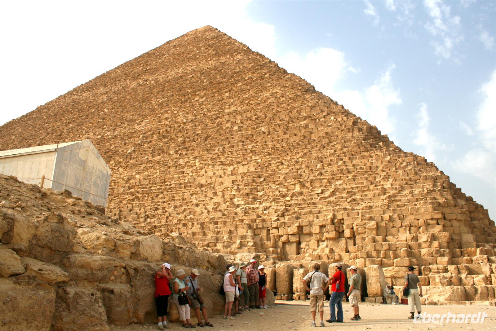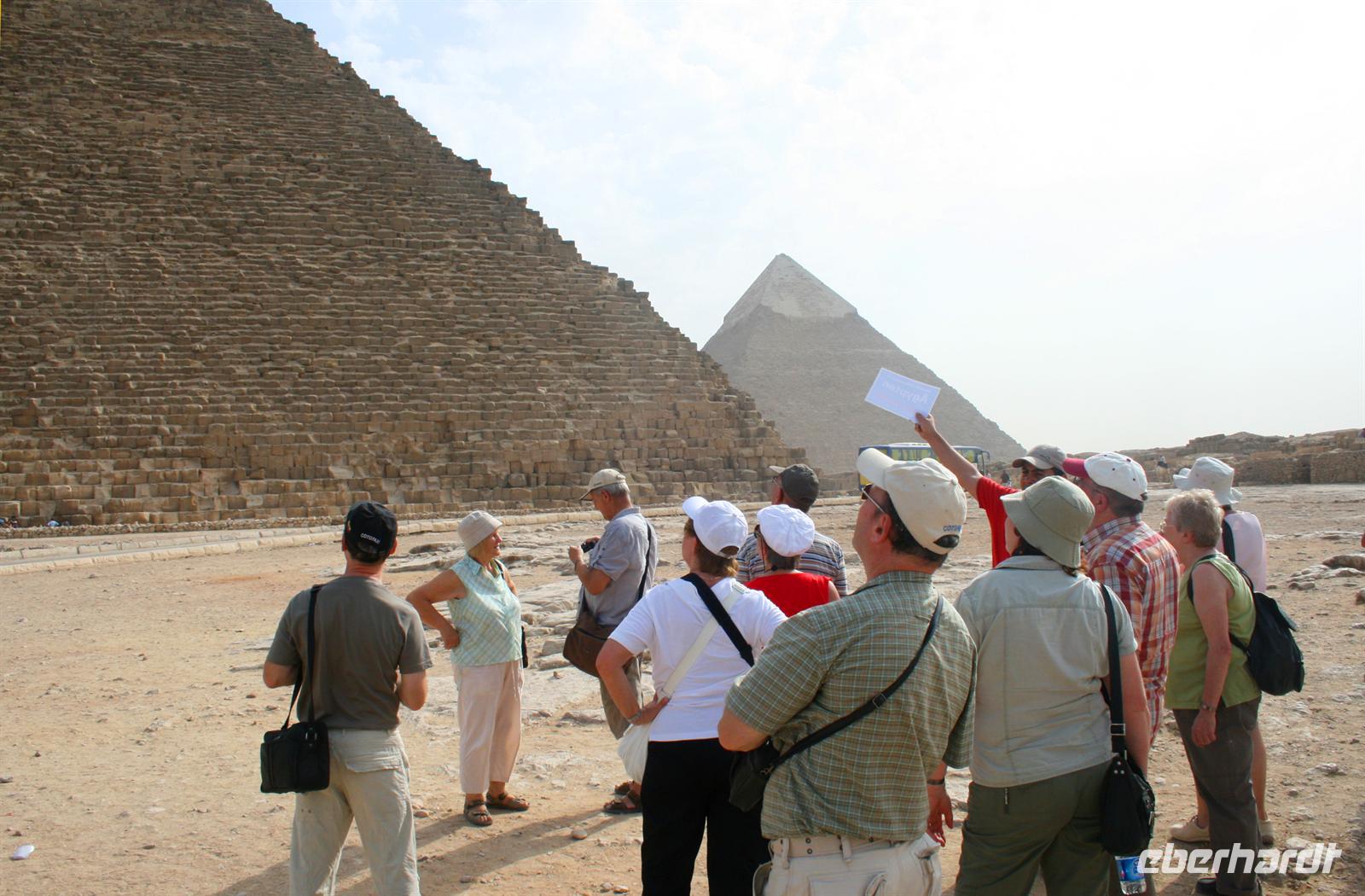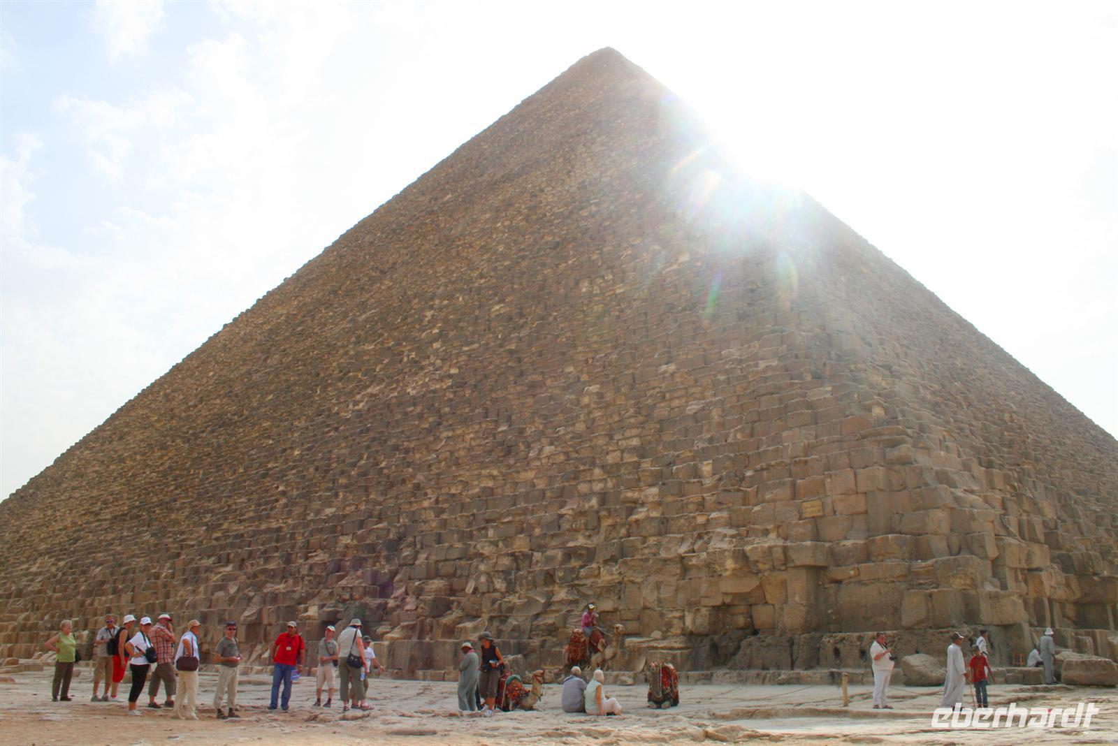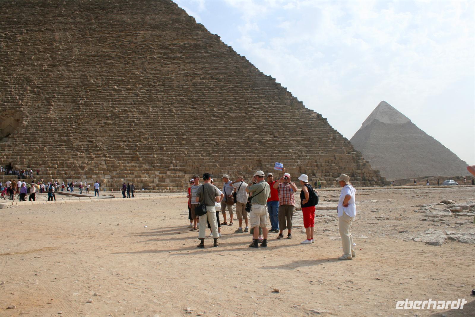 Nach dem Essen geht es weiter mit dem Höhepunkt unseres Tagesprogramms. Wir fahren zurück nach Kairo und zu den Pyramiden von Giseh, welche sich direkt am Rand der Stadt erheben. Am Eingang erfolgt die obligatorische Taschenkontrolle, die es bei den meisten Sehenswürdigkeiten Ägyptens gibt. Aladin erklärt uns alles Wissenswerte zu den drei großen Pyramiden von Giseh - die Grabstätten der Pharaonen Cheops, Chephren und Mykerinos. Zu Fuß spazieren wir um die Cheops-Pyramide und lassen dieses Weltwunder auf uns wirken. Einfach gigantisch wenn man als kleiner Mensch ganz unten steht! Mit dem Bus fahren wir an einen Aussichtspunkt oberhalb der Pyramiden und machen unser erstes Gruppenbild vor dieser einmaligen Kulisse. Anschließend fahren wir hinunter zur Besichtigung der großen Sphinx. Leider kann man nicht mehr direkt bis an die Sphinx hinan. Nur von einer Plattform kann man die Sphinx noch besichtigen und fotografieren.