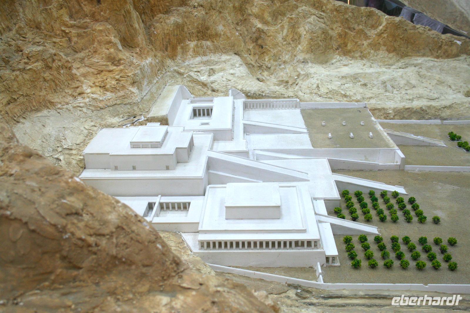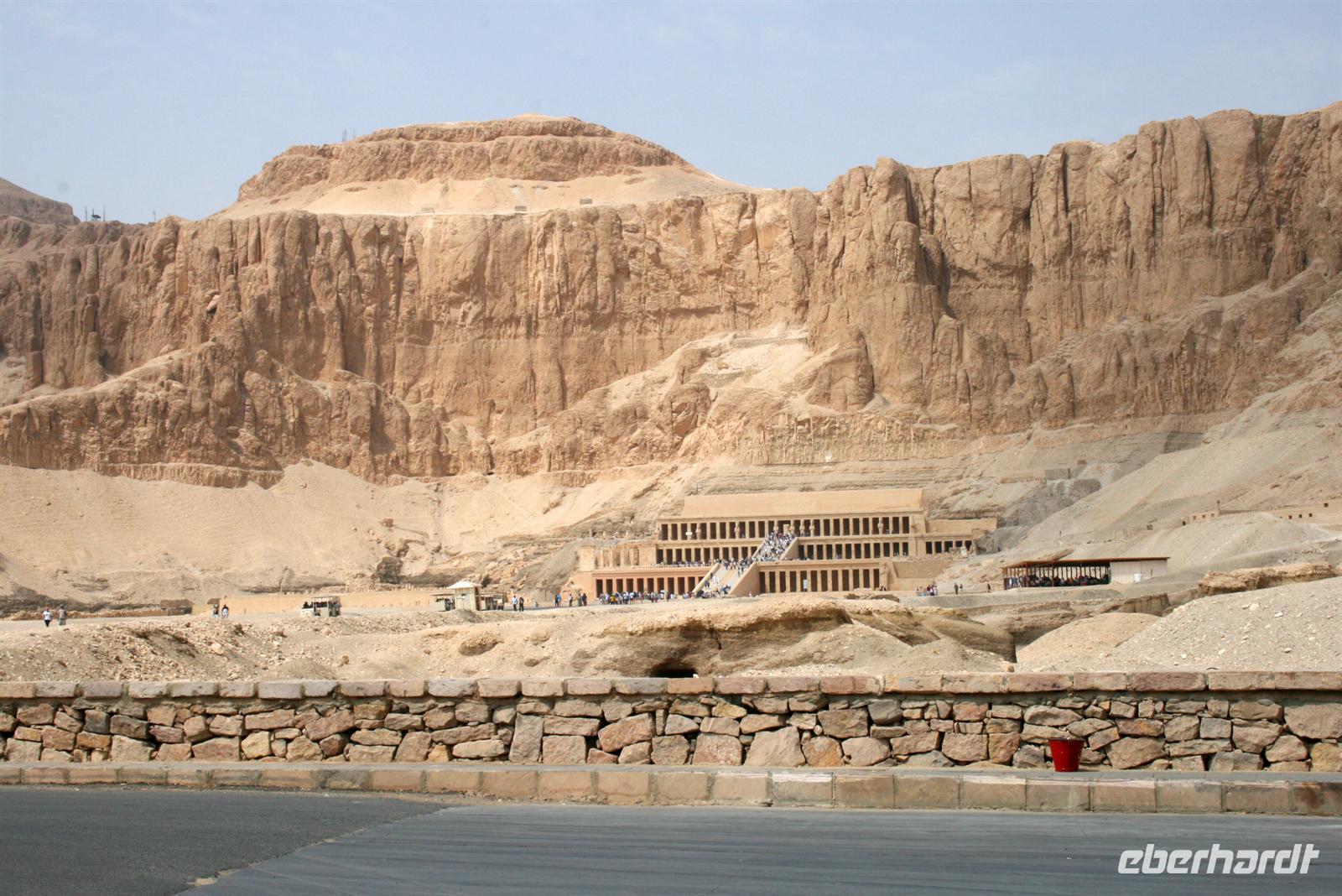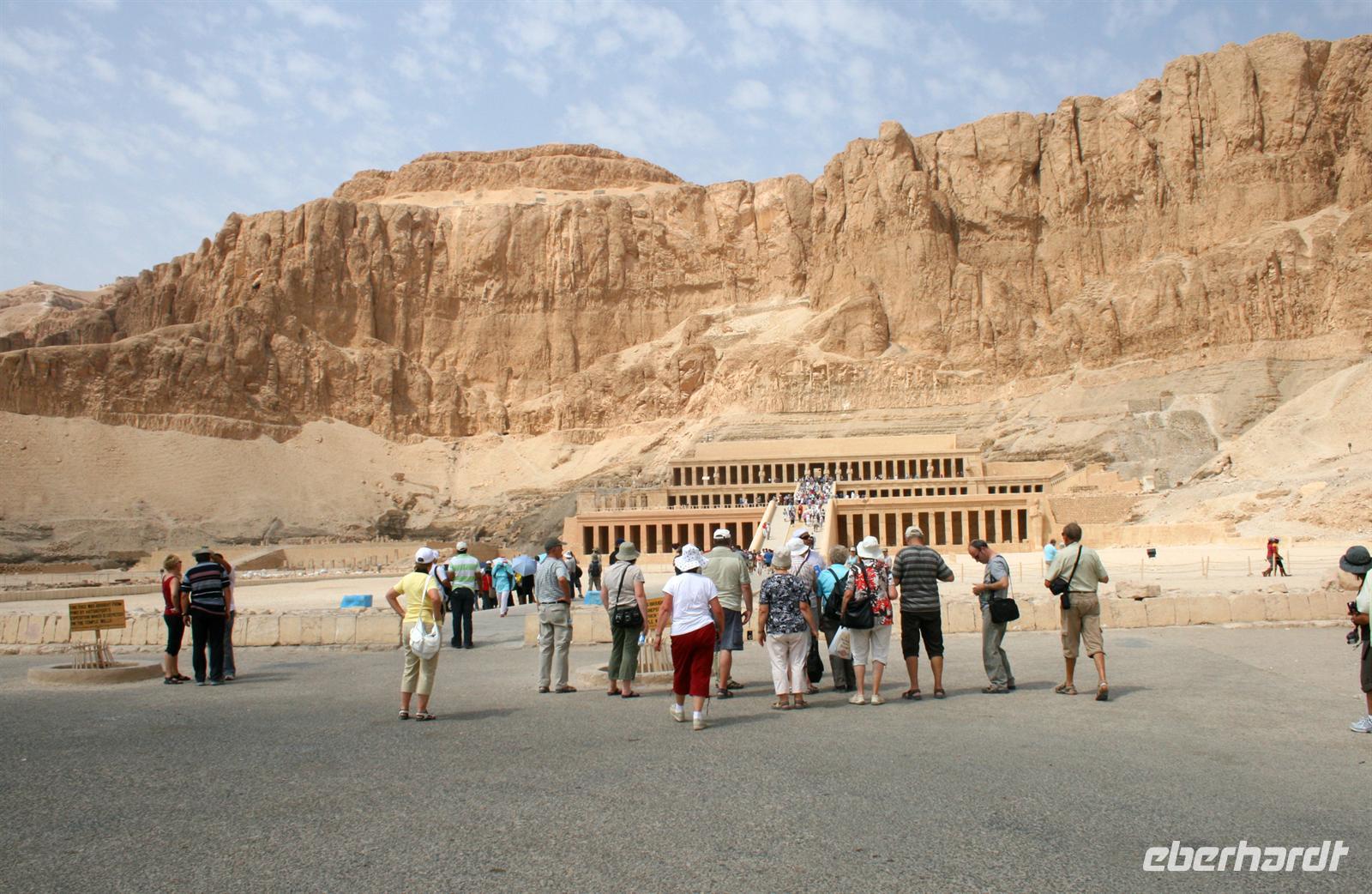 Unser erstes Ziel ist das Tal der Könige. Da wir sehr früh am Tag hier sind, ist es noch nicht so heiß und voll an den Königsgräbern. Mit der Eintrittskarte können wir je drei Gräber nach Wahl besichtigen. Für einige Gäste ist das Tal der Könige ein Höhepunkt der Reise. Wir verbringen etwa 2,5 Stunden hier mit Besichtigungen und Erläuterungen unseres Reiseleiters Aladin. In den Grabgängen und Grabkammern sieht man herrliche Reliefs und Malereien mit Hieroglyphen und Szenen aus der ägyptischen Mythologie. Einige Gäste besuchen sogar die sehenswerten Gräber, die weiter oben im Tal liegen und die einen kleinen Fußmarsch voraussetzen. Alle sind begeistert! Dann fahren wir weiter zum Tempel der Pharaonin Hatschepsut. Die terrassenförmig angelegte Tempelanlage ist die größte erhaltene Tempelanlage am Westufer des Nils in Luxor. Es ist sehr heiß, etwa 40°C, sodass einige Gäste nach einer kurzen Besichtigung des Tempels im Caféhaus lieber ein kaltes Getränk genießen.