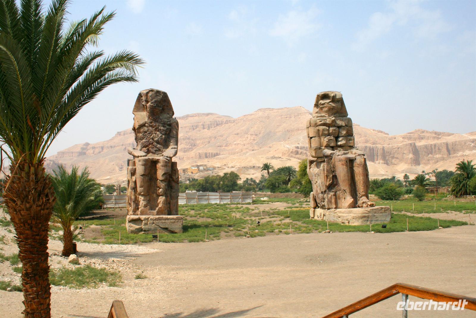 Danach machen wir einen Fotostopp an den riesigen Kolossalstatuen der einstigen Tempelanlage des Pharaos Amenophis III., die so genannten Memnon-Kolosse flankierten einst den Eingangspylon des 500 Meter langen Königstempels.