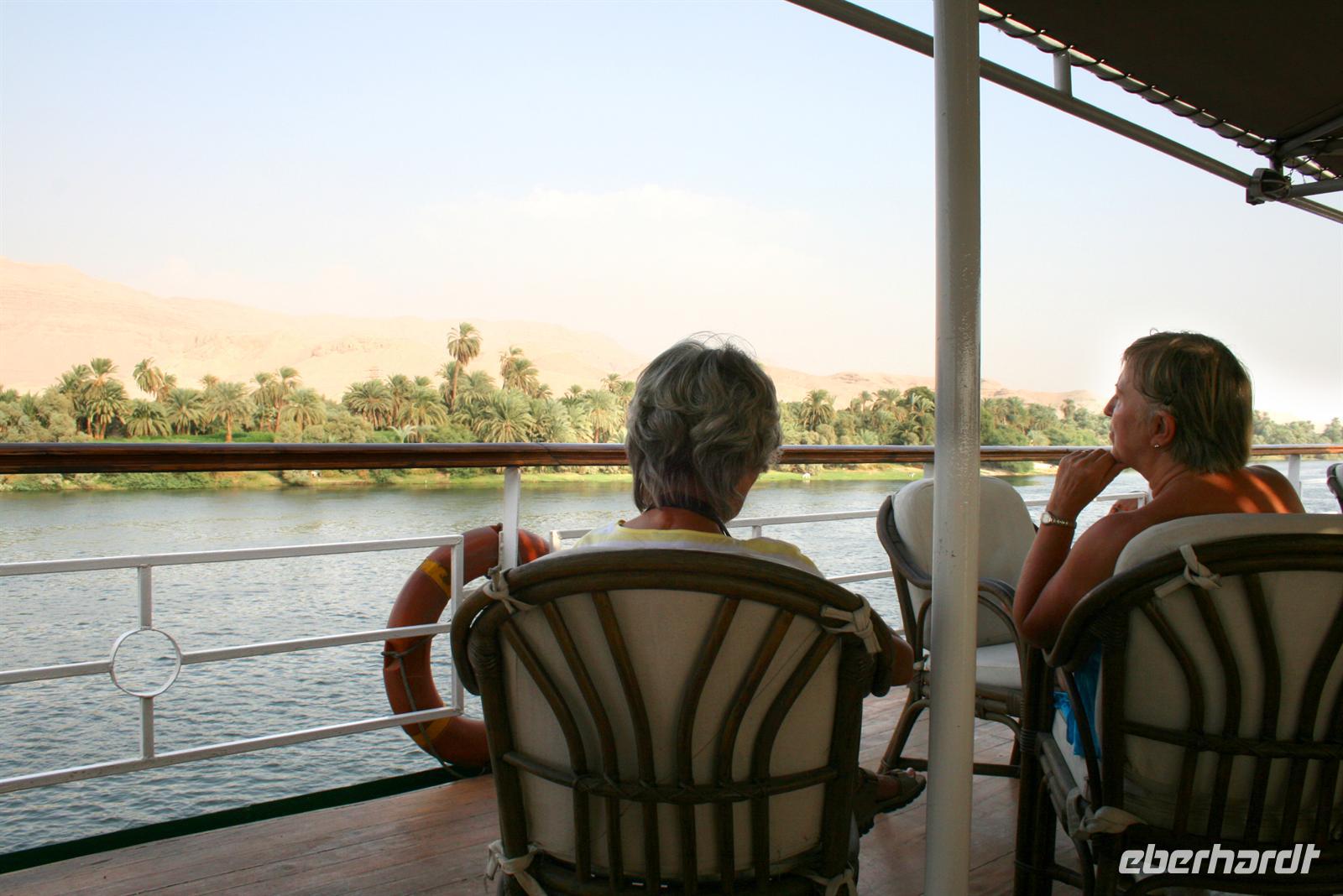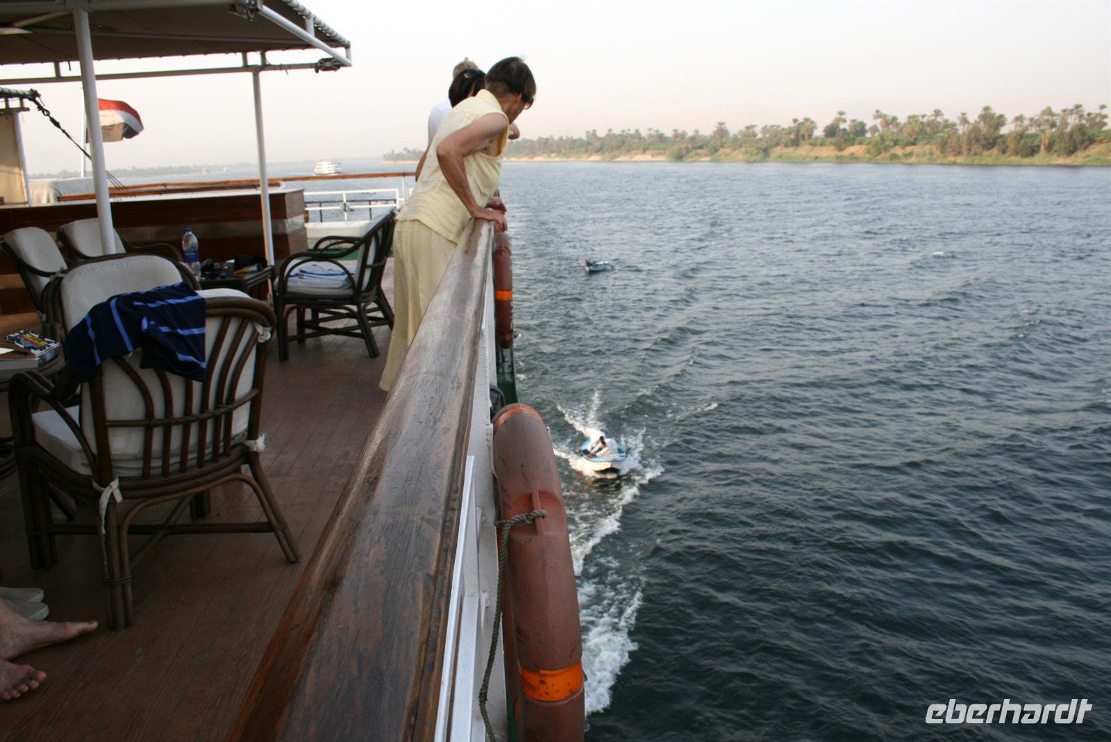 Den heutigen Tag verbringen wir komplett an Bord unseres Schiffes „Mirage“. Das Sonnendeck lädt zum Entspannen ein. Höhepunkt des Tages ist das Passieren der Schleuse bei Esna. Mit kleinen Booten kommen Händler an unser Schiff und bieten uns Souvenirs an. Nach dem Abendessen findet eine Galabia-Party in der Bar statt. Einige von uns kaufen sich im Bordshop eines der hübschen Gewänder (Galabia) für 5 bis 10 Euro. Wir haben eine Menge Spaß am Abend.