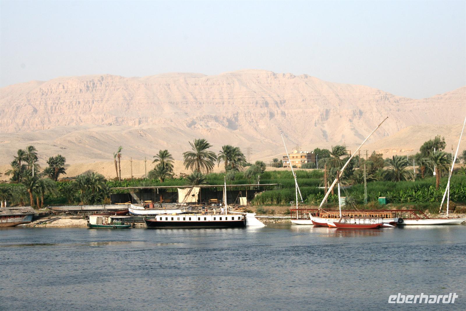 Mit dem Bus fahren wir zurück zum Nil und nehmen unser Mittagessen auf einem der großen Restaurantschiffe ein, die hier am Ufer des Nils liegen.