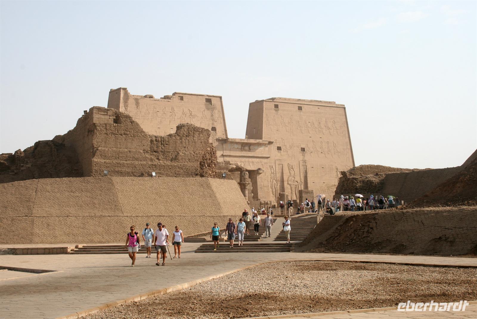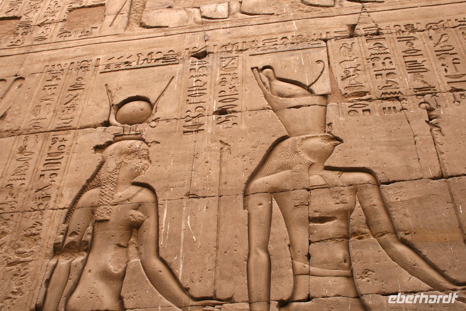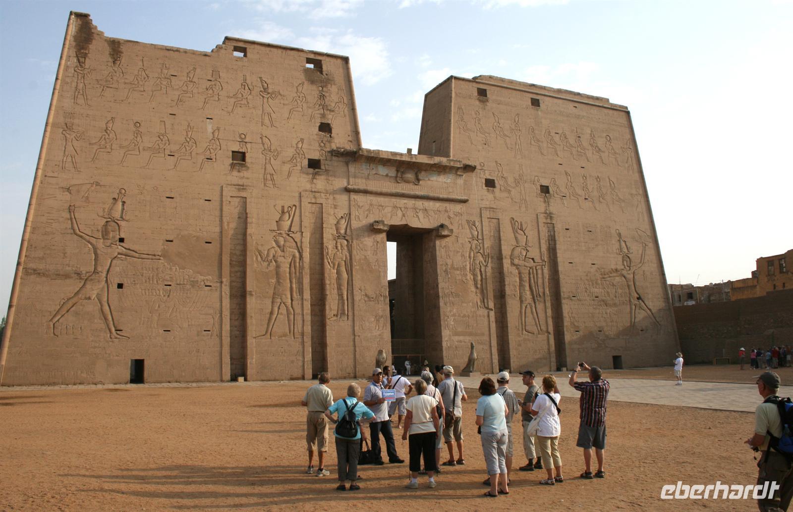 Am nächsten Morgen steht nach dem Frühstück an Bord ein Besuch des Horus-Tempels in Edfu auf dem Programm. Mit dem Bus gelangen wir zum Tempel. Er wurde zur ptolemäischen Zeit erbaut und ist dadurch noch sehr gut erhalten. Der riesige Eingangspylon, die Säulen und die Reliefs des Tempels zeigen Hieroglyphen und Darstellungen der ägyptischen Mythologie, beispielsweise den Kampf von Horus und Isis gegen den "bösen" Gott Seth. Auch die Parfümherstellung der alten Ägypter wird hier auf Reliefs an den Tempelwänden dargestellt.