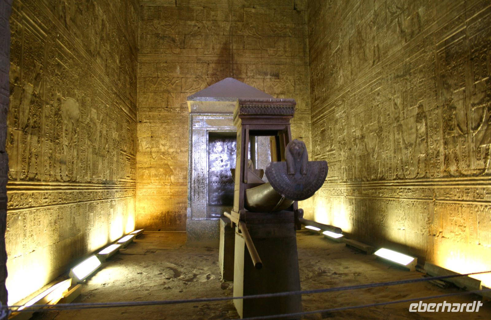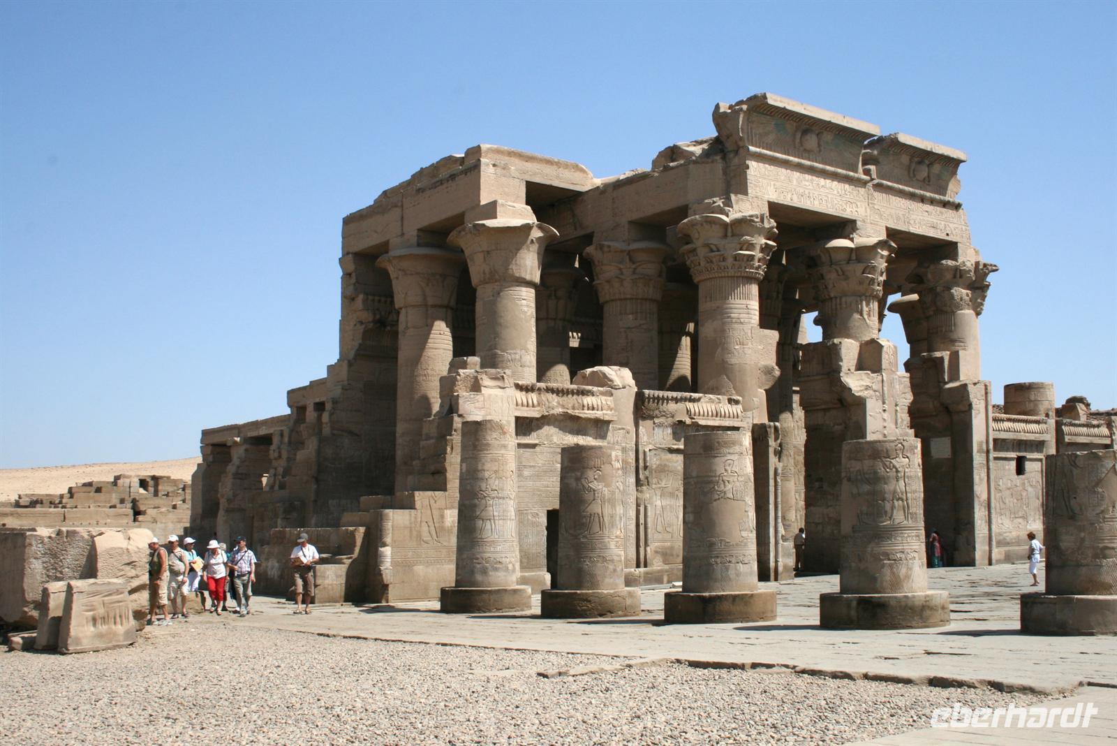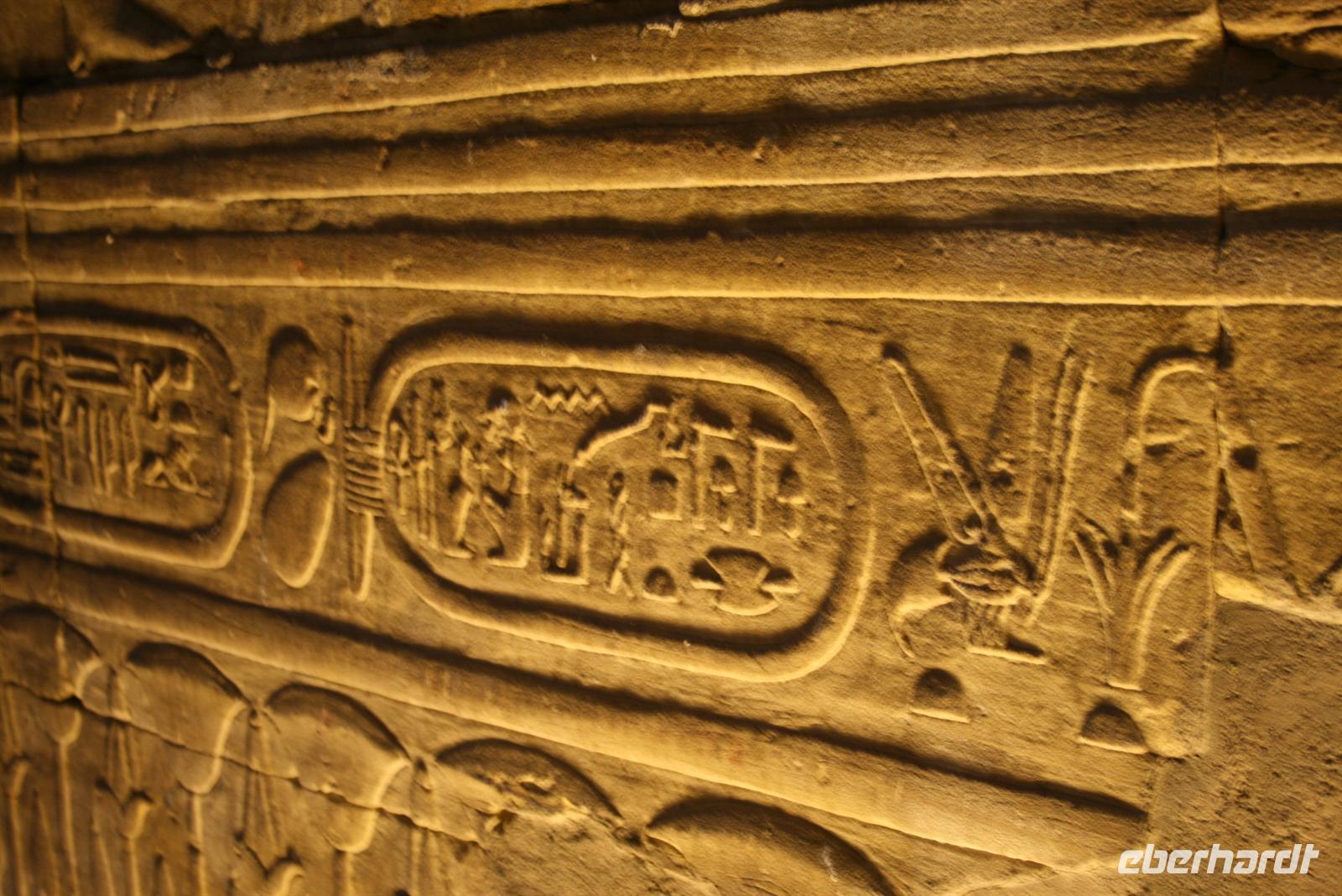 Am nächsten Morgen steht nach dem Frühstück an Bord ein Besuch des Horus-Tempels in Edfu auf dem Programm. Mit dem Bus gelangen wir zum Tempel. Er wurde zur ptolemäischen Zeit erbaut und ist dadurch noch sehr gut erhalten. Der riesige Eingangspylon, die Säulen und die Reliefs des Tempels zeigen Hieroglyphen und Darstellungen der ägyptischen Mythologie, beispielsweise den Kampf von Horus und Isis gegen den "bösen" Gott Seth. Auch die Parfümherstellung der alten Ägypter wird hier auf Reliefs an den Tempelwänden dargestellt.