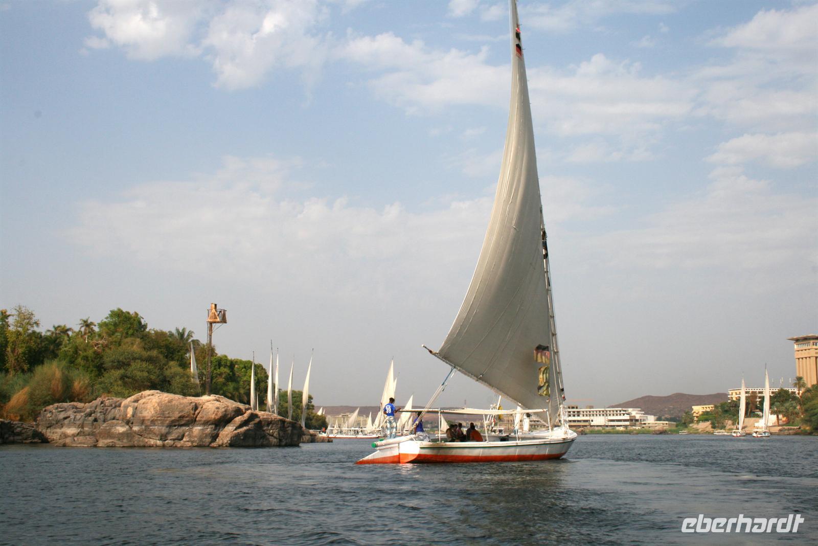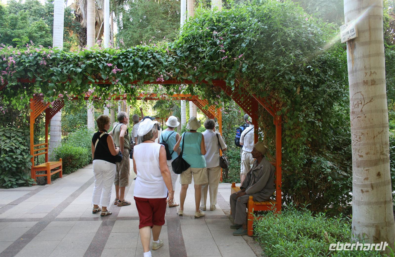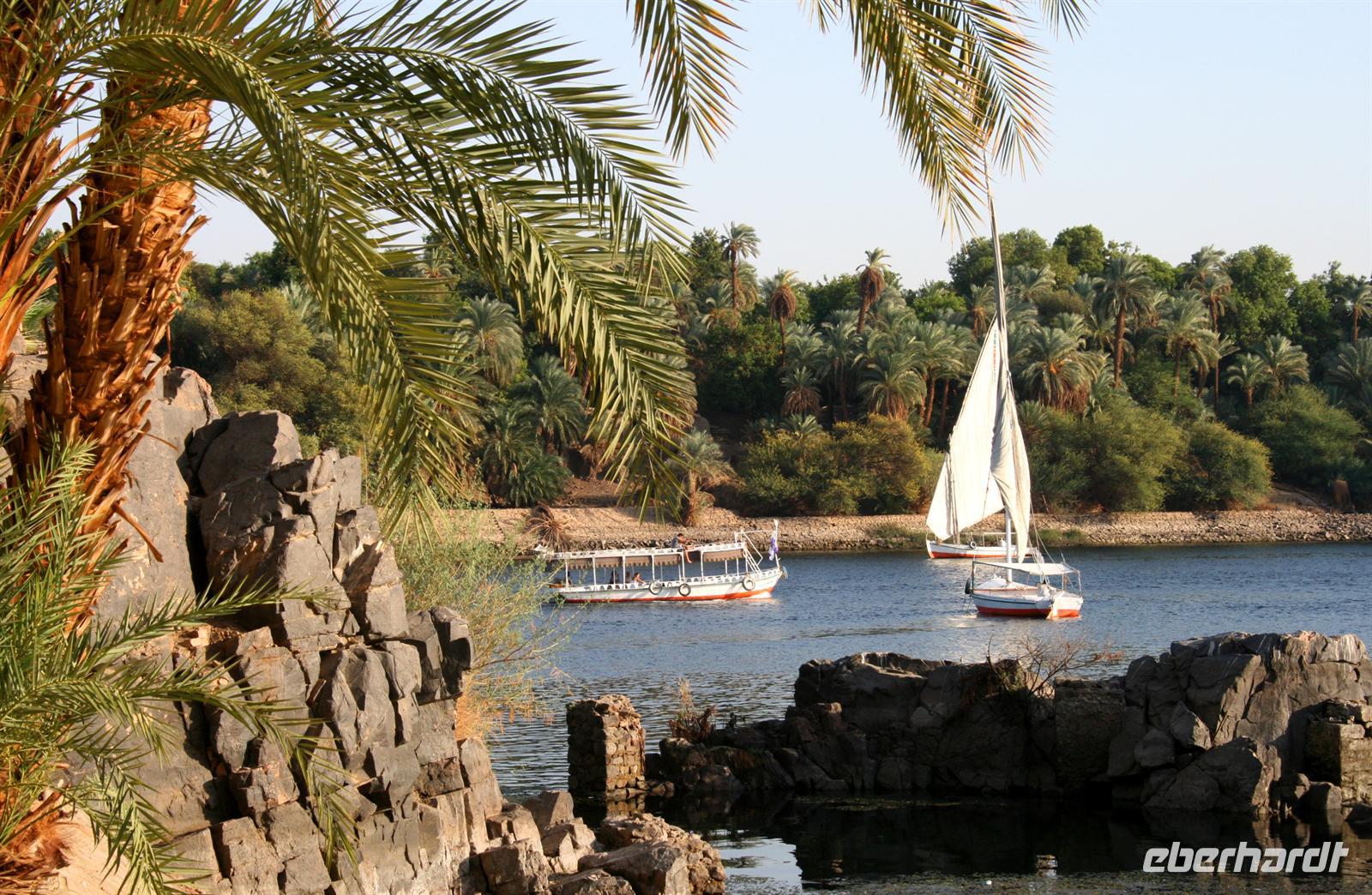 Zum Mittagessen sind wir zurück in Assuan. Nach einem kleinen Mittagsschläfchen oder einer Abkühlung im Pool gehen wir am Nachmittag noch einmal von Bord. Mit einem der typischen Segelboote - einer Felukke - fahren wir zur Kitchener Insel in Assuan. Hier befindet sich ein wunderschöner grüner botanischer Garten mit Pflanzen, Palmen und anderen Bäumen aus der ganzen Welt. Das satte Grün ist eine Wohltat für die Augen!