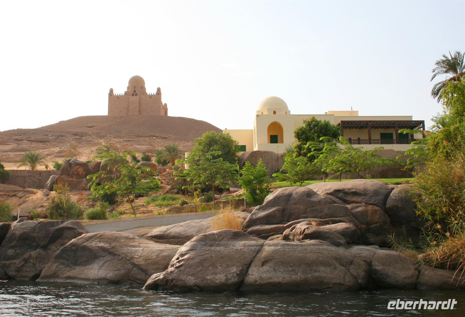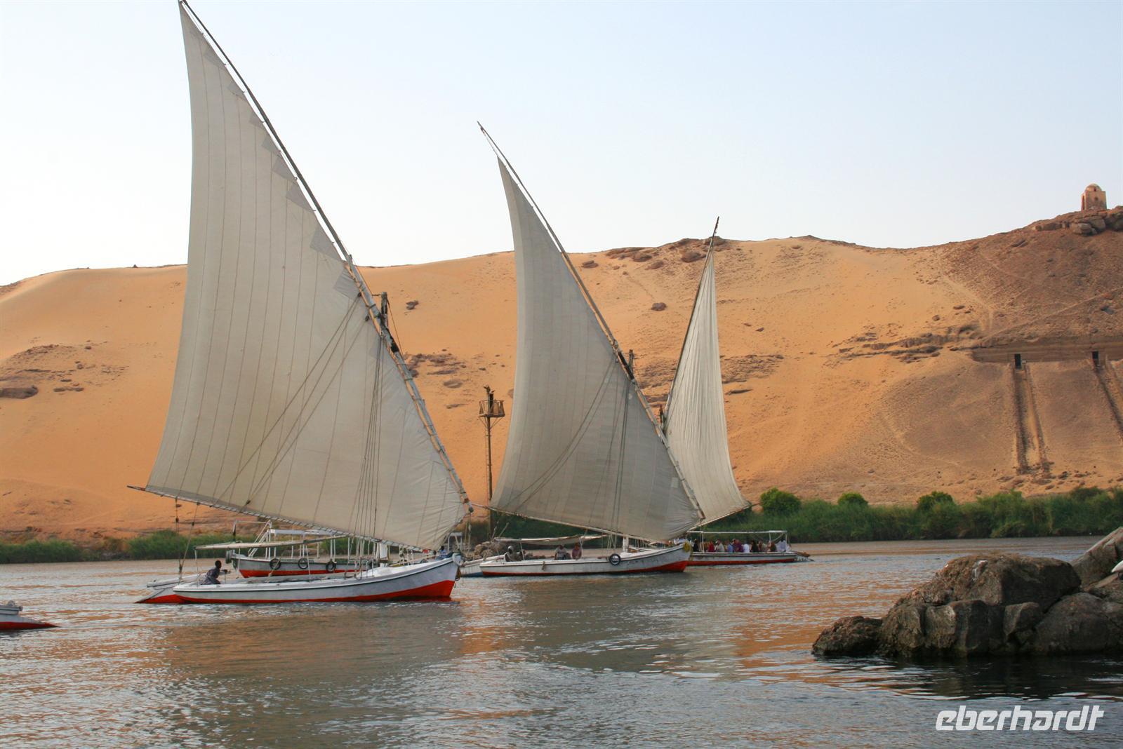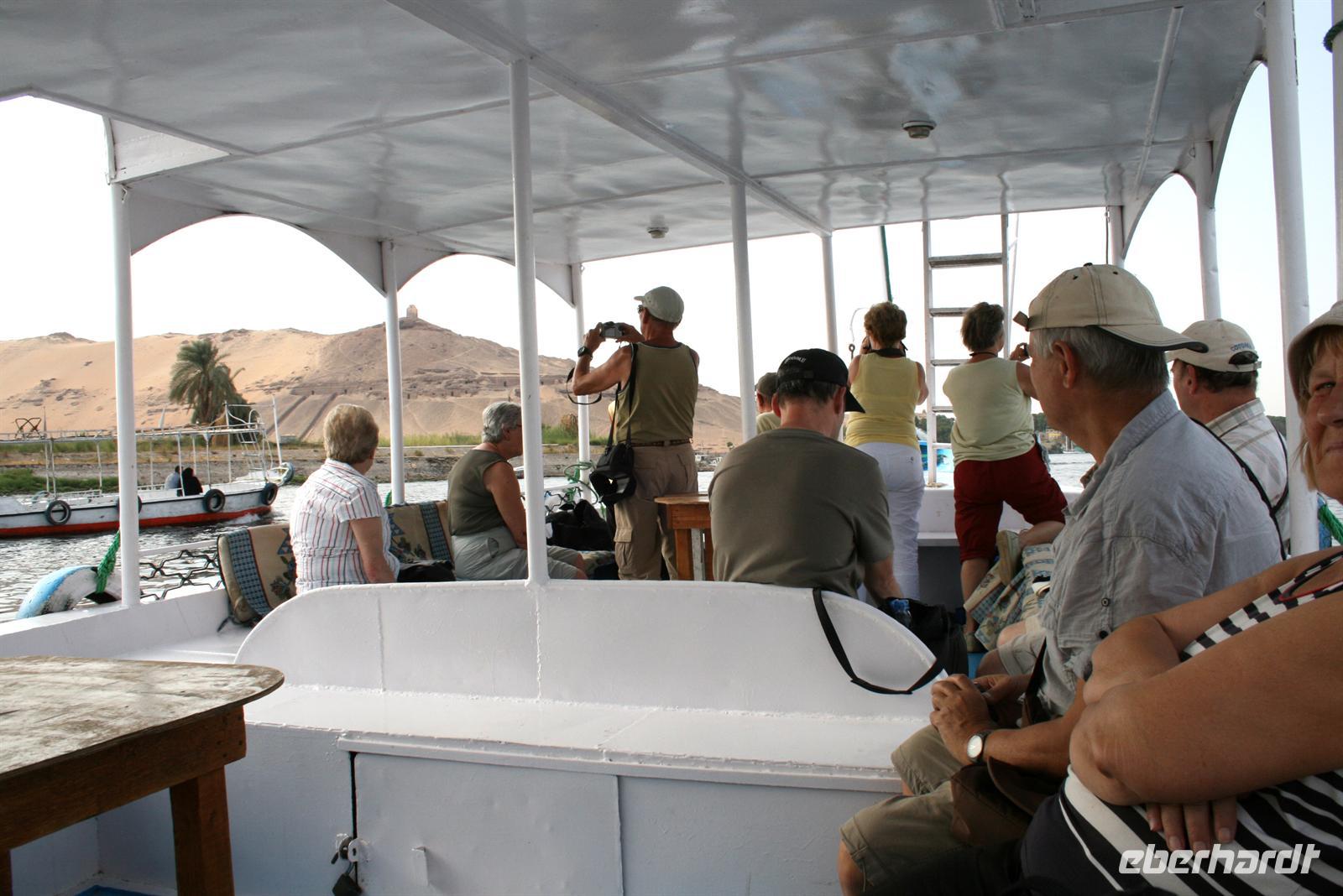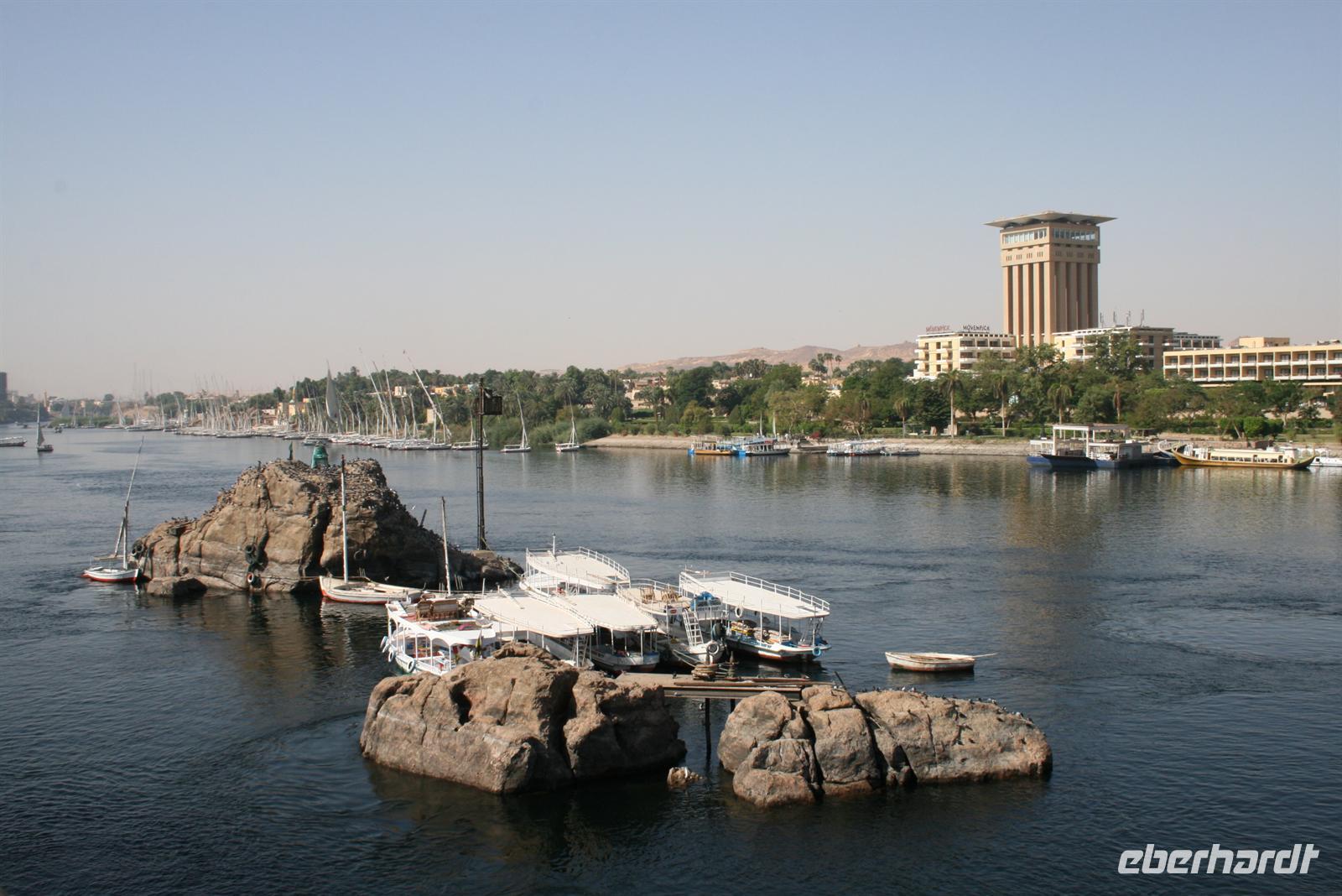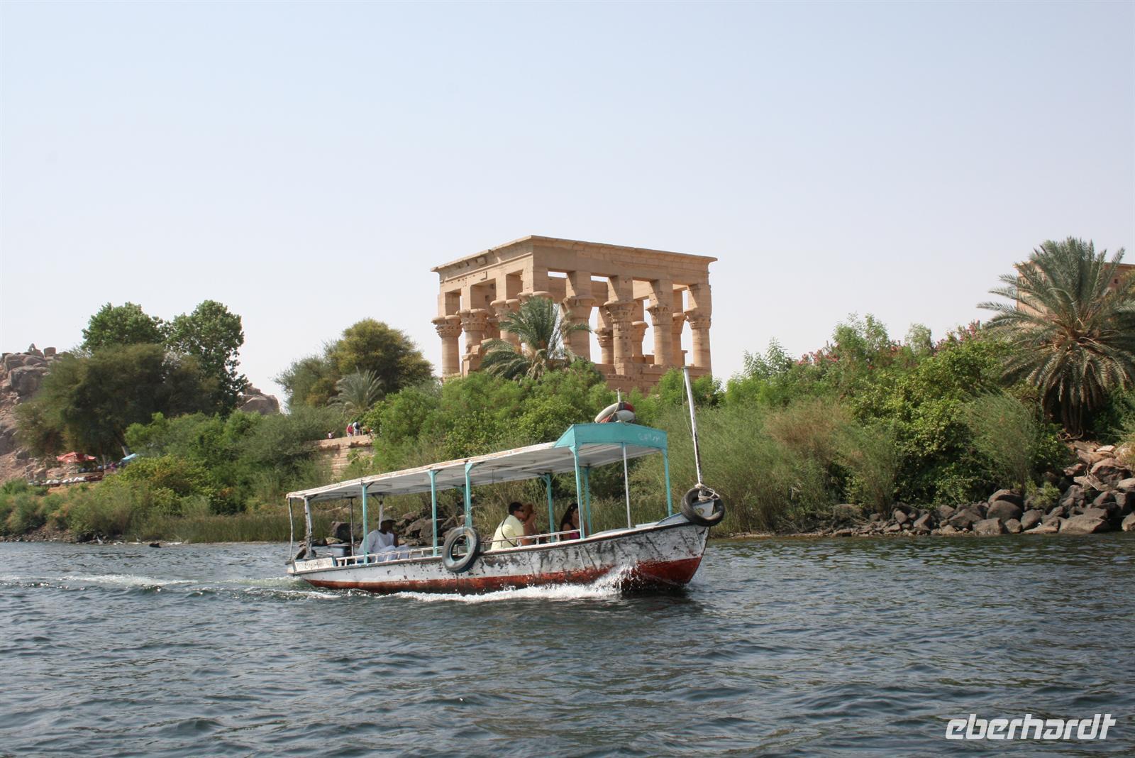 Auch die nächsten beiden Nächte liegt unser „schwimmendes Hotel“ in Assuan und wir können die grüne Stadt im Süden Ägyptens in aller Ruhe erkunden. Assuan ist für mich die schönste Stadt am Nil. Alles geht ruhiger zu als in Kairo oder Luxor, die vielen Inseln im Nil und die zahlreichen Grünflächen machen den Reiz dieser Region aus. Wieder früh (7 Uhr) geht es los zu unserem ersten Ausflug. Wir besuchen den Assuan-Staudamm, der den riesigen Nasser-See und den Weiterlauf des Nils trennt. Danach setzen wir mit dem Boot zur Insel Agilkia übe.