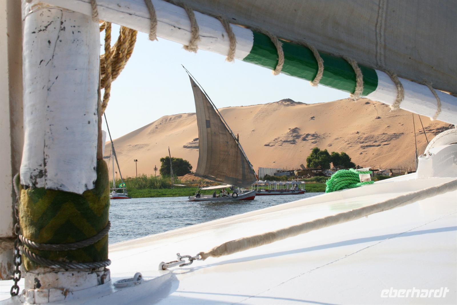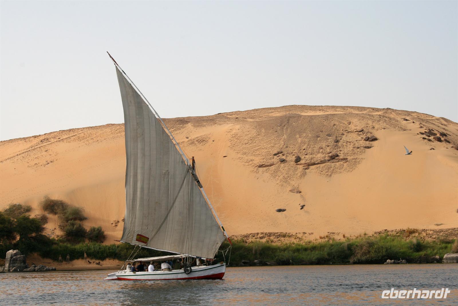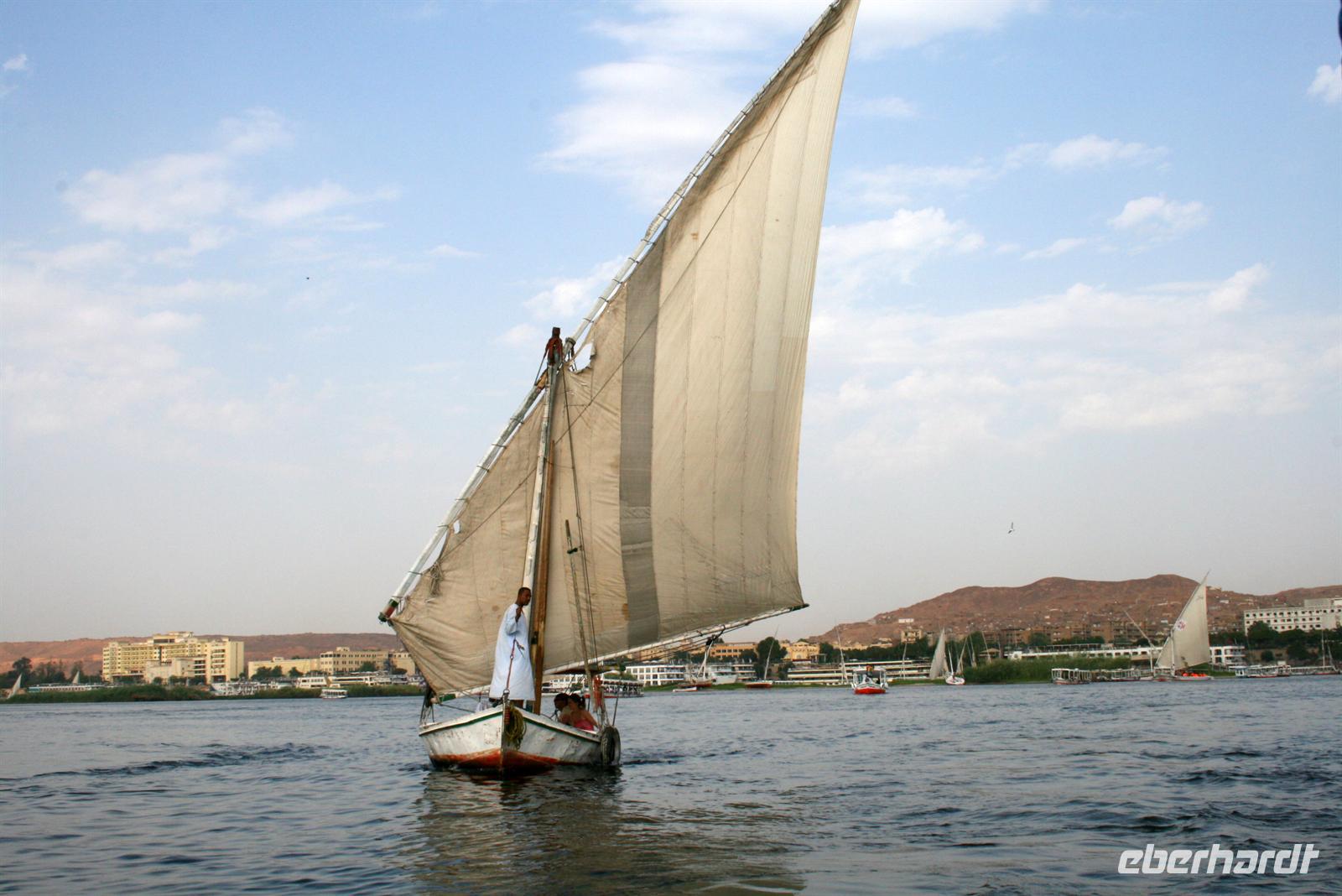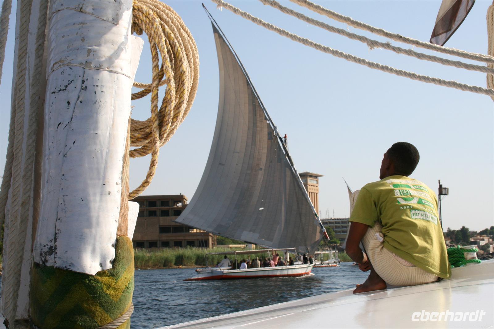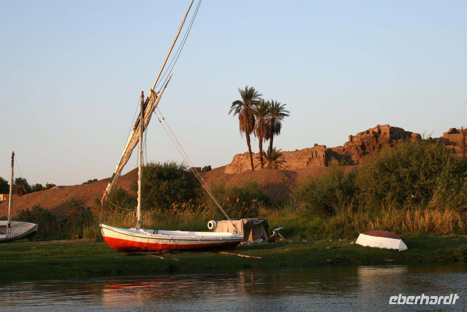 Sanft gleitet die Felukke bei unserer Rückfahrt über den Nil und die Abendsonne taucht die Umgebung in ein tolles warmes Licht. Wir genießen die Ruhe, die Aussicht und das leise Plätschern des Nils. Jede Minute bietet andere wunderbare Fotomotive!
