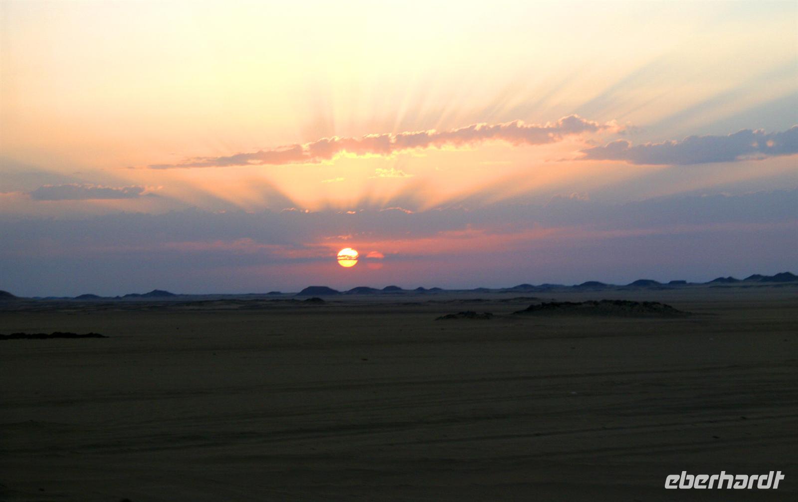 Am nächsten Morgen sind die meisten Gäste schon wach, um den Sonnenaufgang in der Wüste nicht zu verpassen. Wieder ergeben sich tolle Fotomotive! Das Frühstück gibt es unter freiem Himmel in der Morgensonne. Wir lassen uns den frisch am Feuer gebrühten Kaffee und Tee und das vom Camppersonal vorbereitete Essen schmecken. Schon kurz nach 6 Uhr ist das Gepäck in unseren Jeeps verladen und unsere Wüstentour geht weiter.