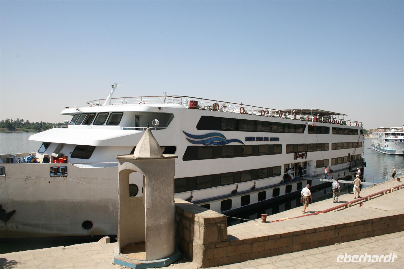 Zur Mittagszeit erreichen wir schließlich wieder die Stadt Luxor und unser Kreuzfahrtschiff für die Nilkreuzfahrt, die MY „Mirage“. Unser Gepäck wird vom Schiffspersonal vom Bus auf das Schiff gebracht und wir genießen einen kleinen Begrüßungsdrink in der Bordbar. Wir erledigen die Formalitäten für den Check In und können unsere Kabinen beziehen. Die Kabinen sind relativ geräumig und mit Flachbild-TV, Telefon, Kühlschrank, Safe, Klimaanlage, Sitzecke und Bad mit Dusche/WC und Fön ausgestattet. Die „Mirage“ gehört zu den besten Kreuzfahrtschiffen auf dem Nil. Da sie über Elektromotoren-Antrieb verfügt, ist der Geräuschpegel während der Fahrt gleich Null. Ich bin selbst schon mit einem Dieselmotorenschiff auf dem Nil gefahren und habe die Lautstärke und die Vibrationen eines solchen Schiffes erlebt. Ich kann nur sagen, dass die „Mirage“ eine hundertprozentige Verbesserung für unsere Nilkreuzfahrt ist. Hier müssen Sie nicht mit Gehörschutz schlafen!