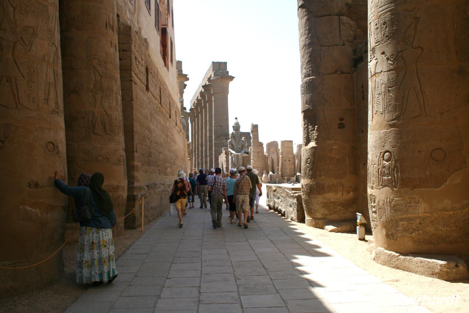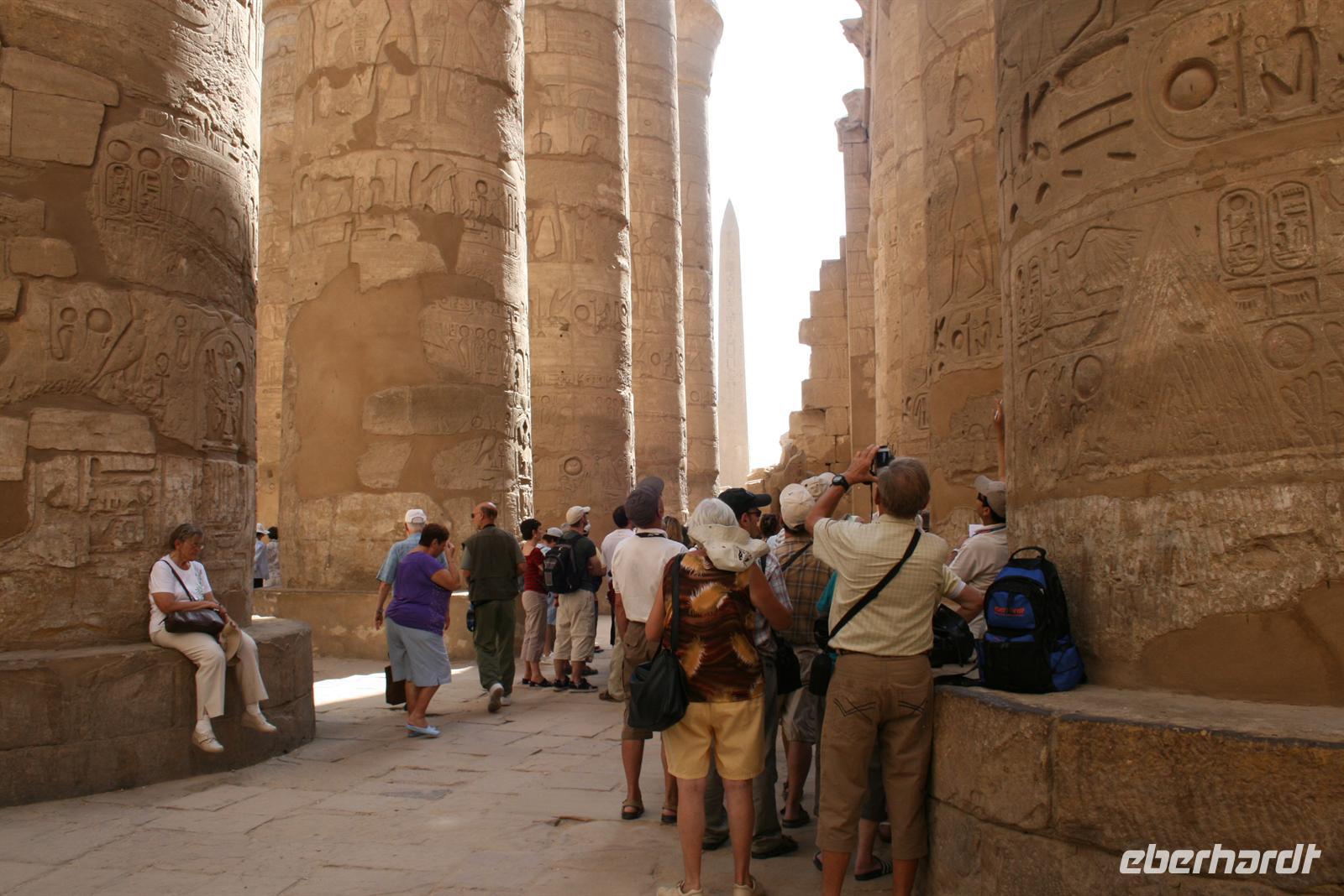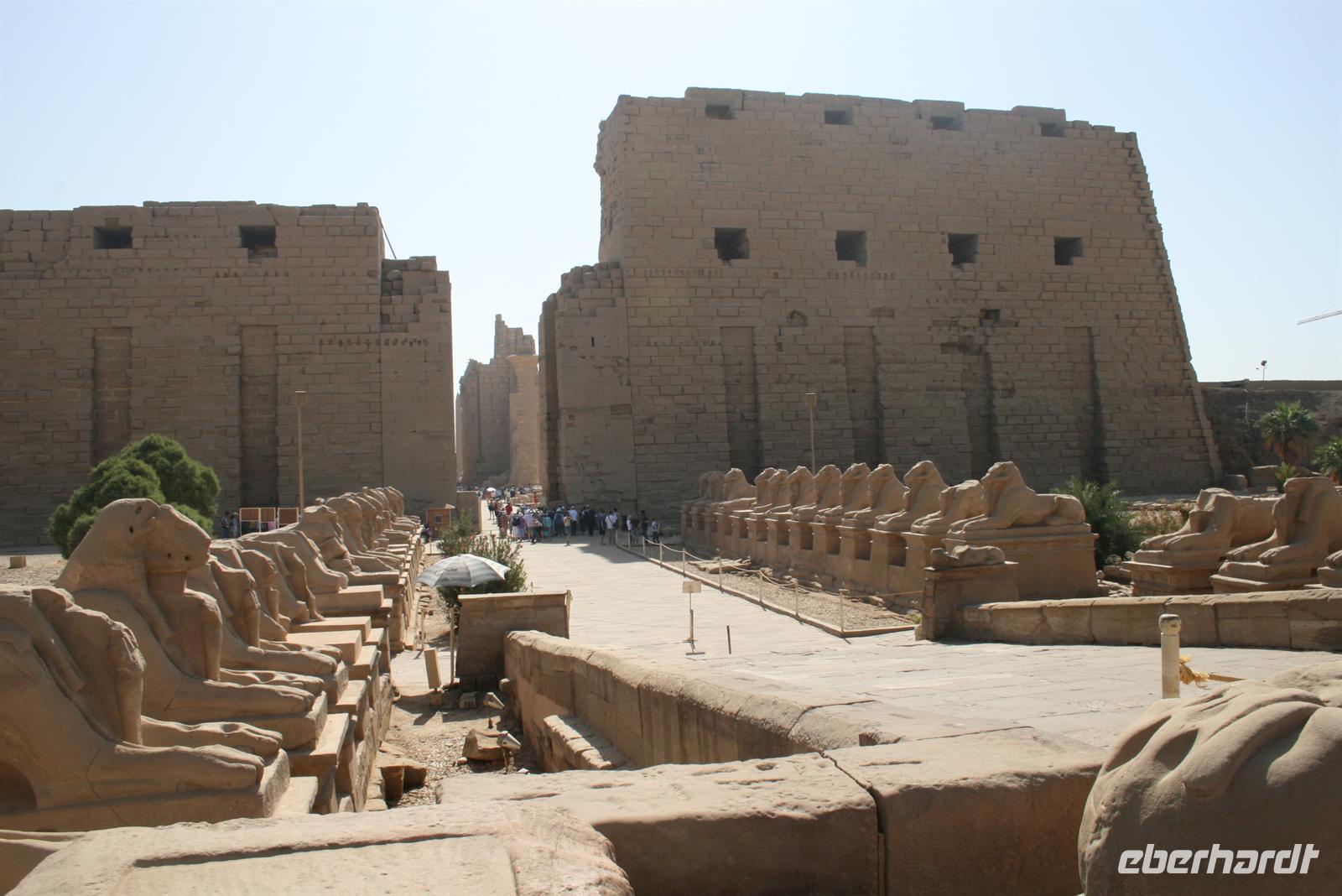 Am Abend erreicht das Schiff Esna und legt früh am Morgen (gegen 4 Uhr) erneut ab in Richtung Luxor. Gegen 8 Uhr erreichen wir schließlich Luxor, den Ausgangsort unserer Nilkreuzfahrt. Während wir auf der Hinreise Luxor-West, also das Tal der Könige westlich des Nils, besucht haben, steht heute Luxor-Ost auf unserem Reiseprogramm. Denn auch in der Stadt selbst gibt es einiges zu entdecken. Erstes Ziel ist der Karnak-Tempel, die größte Tempelanlage überhaupt. Mehrere Pharaonen haben hier ihre Architekten und Handwerker wirken lassen. Wir besichtigen den Tempel mit seinen Pylonen, Säulengängen, Obelisken, Statuen und dem heiligen See etwa zwei Stunden zusammen mit unserem Reiseleiter und auf eigene Faust. Die schiere Größe ist einfach überwältigend!