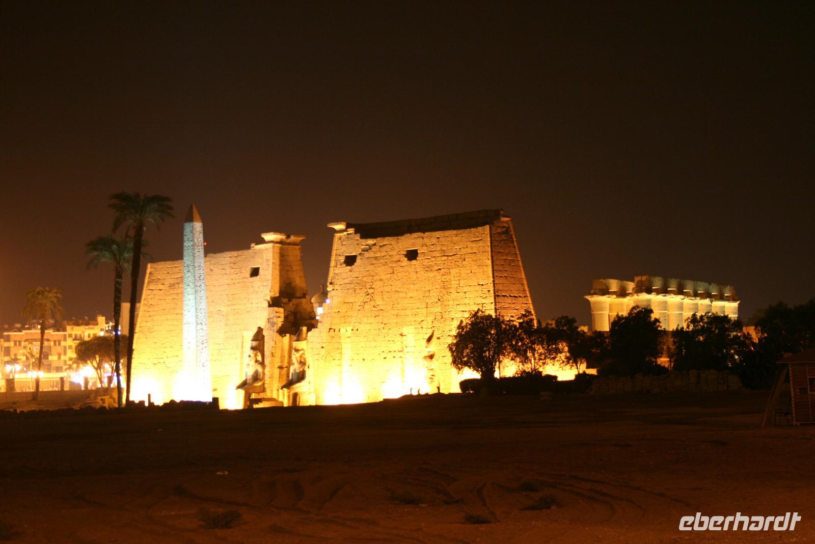 Am Abend bieten wir als zweiten fakultativen Ausflug, den Besuch der Ton- und Lichtshow im Karnak-Tempel an. Alle kommen wieder mit. Gemeinsam erleben wir den Karnak-Tempel noch einmal am Abend. Mit Lautsprechern und farbigen Scheinwerfern werden wir durch die Tempelanlage geführt und erfahren auf emotionale Weise noch einmal so viel Wissenswertes zum Tempel, zu den Pharaonen und zur ägyptischen Götterwelt. Am heiligen See sitzen wir auf den Tribünen und verfolgen die Show. Alle sind ergriffen und begeistert von der Vorführung. Ein tolles Erlebnis! Wir verbringen die letzte Nacht an Bord der „Mirage“. Morgen beginnt unser Wüstenabenteuer.