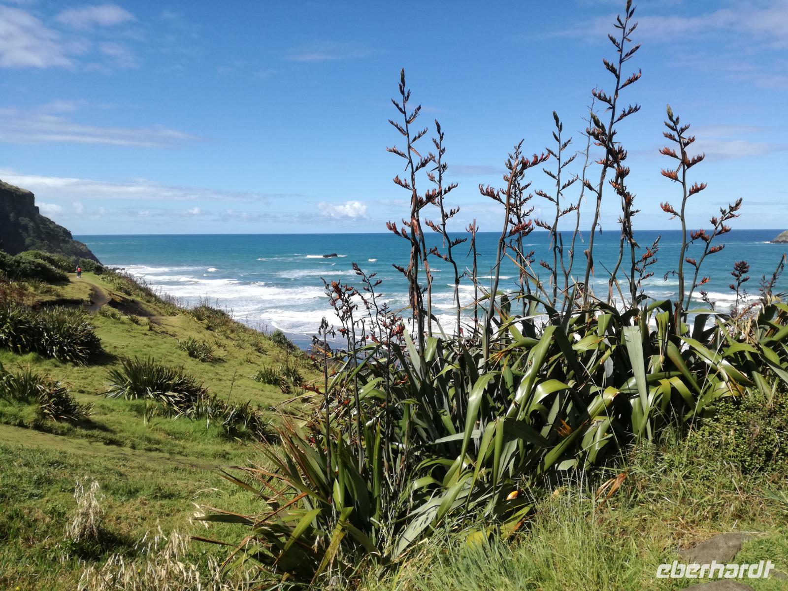 Wieder starteten wir mit dem fantastischen Frühstück in den Tag. Gemeinsam mit Reiseleiterin Doris fuhren wir an die Westküste zum Muriwai-Strand. Huch, die Landschaft aus Weinanbaugebieten und grünen Wiesen mit gefleckten Kühen erinnert uns irrtümlicherweise an Italien oder der Schweiz, nur dass hier wesentlich mehr Schafe weiden und hin und wieder doch tropische Vegetation hervorlugt. Muriwai ist eine beeindruckende zerklüftete Küstenlinie von 60 Kilometern mit Klippenpfaden zu einer riesigen Tölpelkolonie, die uns ganz in der Nähe der Vögel bringen. Weiter geht es nun an die Ostküste in die Matakanaregion am Pazifik. Unterwegs sehen wir eine tolle Landschaft. Bei Brick Bay Wines kehren wir zur Mittagspause mit Weinverkostung ein. Seit einiger Zeit werden in der Region Premium-Weine produziert und es werden mehrere neue Weinberge erschlossen. Fast alle Weinberge liegen an Hängen, was dazu beiträgt, die Lehmböden zu entwässern. Traditionell ein Rotweinanbaugebiet, gibt es heute einige hervorragende Weißweine - vor allem Chardonnay und Pinot Gris. Die klassischen roten Sorten Merlot, Cabernet Sauvignon, Syrah, Pinotage, Pinot Noir und Sangiovese haben sich jedoch durchweg bewährt. Da wir uns schon am Tor zur Sculpture Trail befinden, drehen wir eine Verdauungsrunde durch den neuseeländischen Regenwald, um die neuseeländischen Kauri-Bäume zu bewundern. Der nächste Stopp: das Dörfchen Puhoi, welches seit 1863 von deutschböhmischen Siedlern geprägt ist. Im ältesten Pub des Landes genehmigen wir uns eine kalte Erfrischung. Weiter geht der Weg nach Davenport. Die bezaubernde Innenstadt ist aus Holzgebäuden aus der viktorianischen Zeit. Auf dessen höchsten Vulkankegel Mount Victoria blicken wir auf die Skyline von Auckland. Zum Abschluss des Tages nehmen wir der Fähre zurück in die Großstadt.