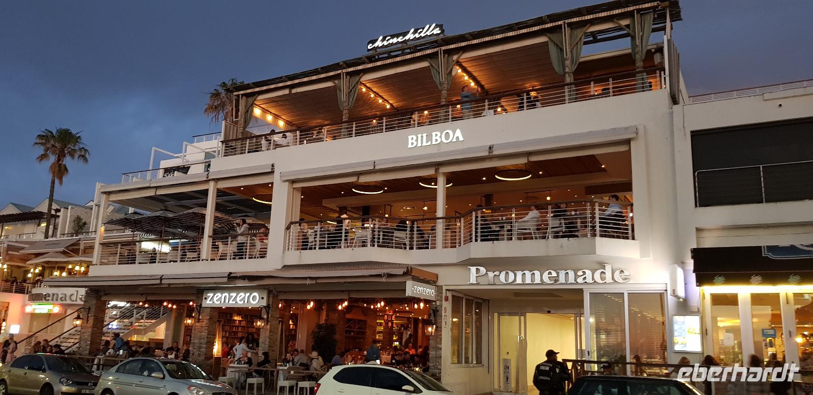 Nun geht es schließlich nach Kapstadt zurück, wo wir in Champs Bay im schicken „Bilboa" Restaurant einkehren. Hier erwartet uns ein edles 3 Gänge Menü und Herr Eberhardt spendiert sogar noch ein paar Flaschen Wein. Nach dem Essen erfahren wir, dass die Kupplung von unserem Bus kaputt ist und somit fahren wir schließlich die kurze Strecke mit Taxen zum Hotel zurück.