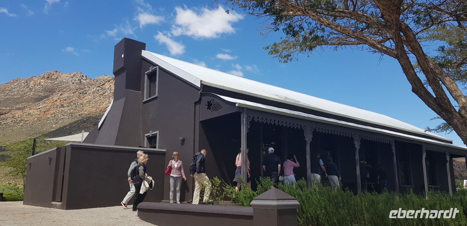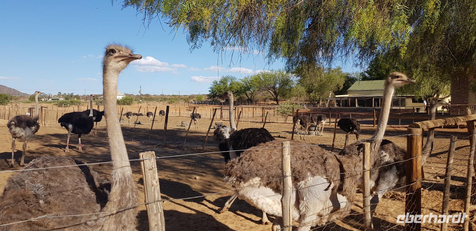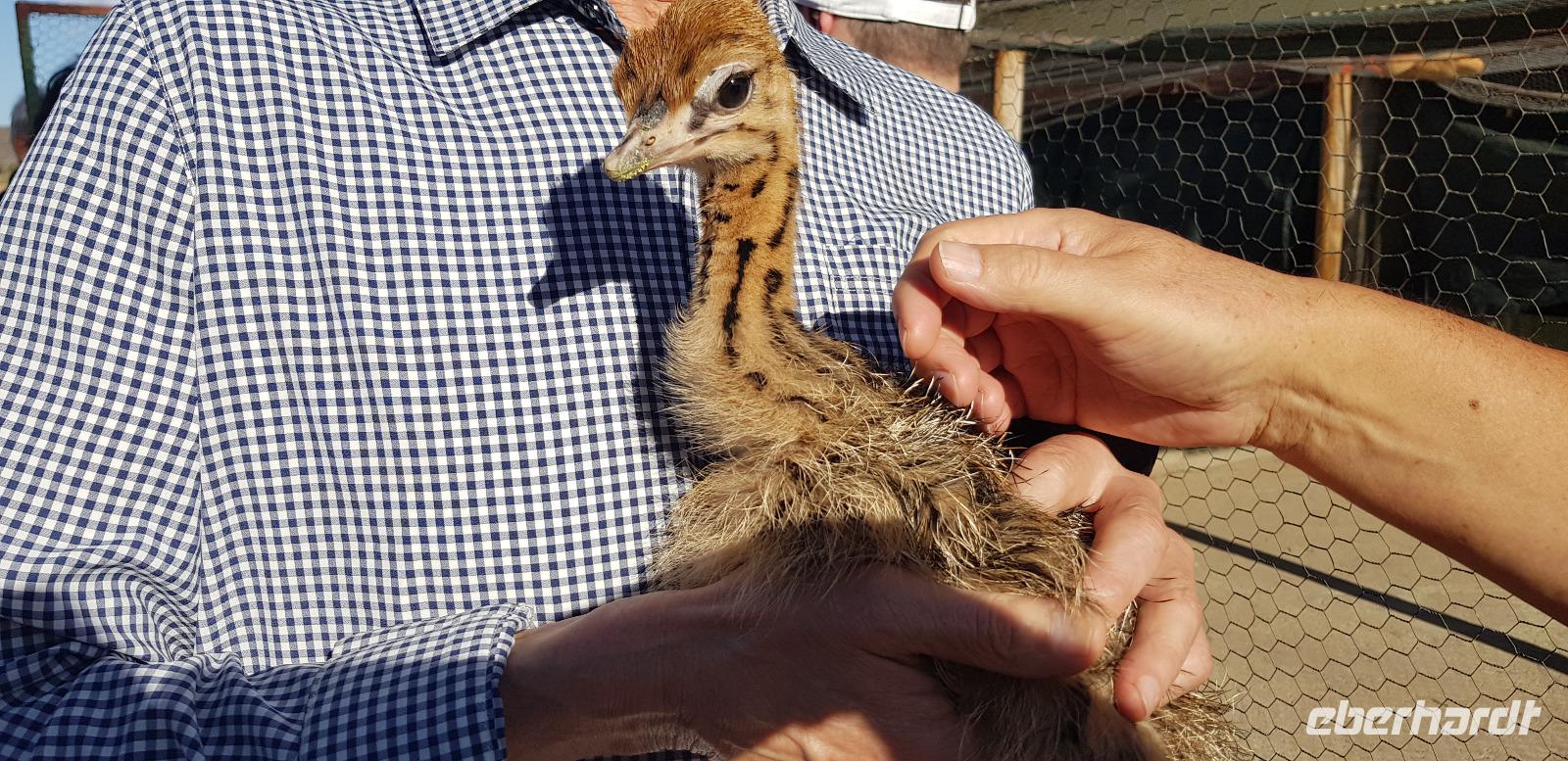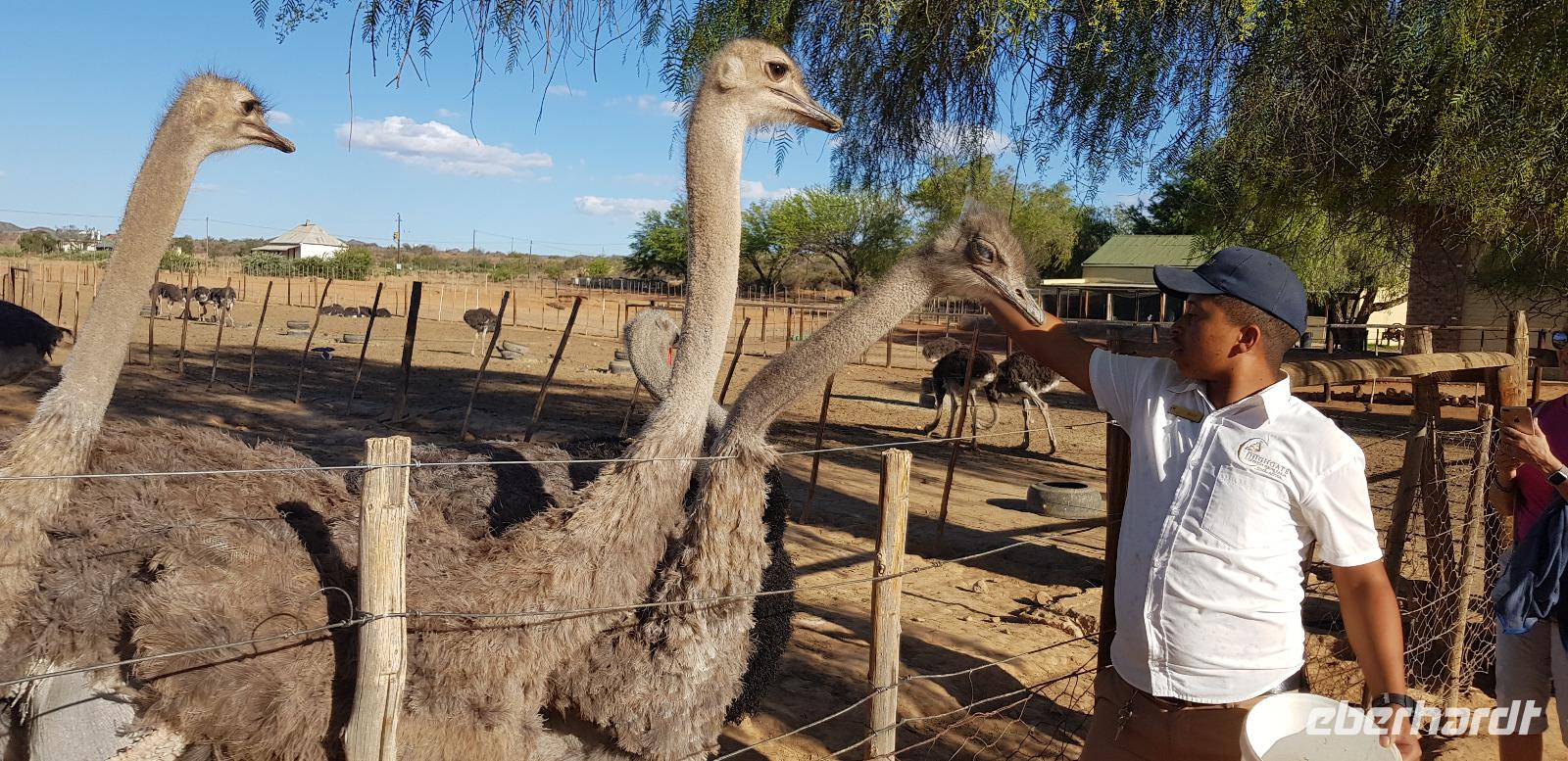 Unterwegs besuchen wir ein kleines Weinlokal, wo wir für unsere Eberhardt-Gruppe noch eine spontane Weinverkostung organisiert haben. Aufgrund des Flugausfalls am ersten Tag, fehlt uns diese noch im Südafrika-Programm. Im schicken Ambiente der „Blue Vines" Vinery, genießen wir also die edlen Tropfen. Andrea übersetzt und erklärt alle wissenswerten Infos und zum Schluss darf ein Besuch der schicken Toiletten nicht fehlen. Weiter geht es etwa 2 Stunden zu einer Straußenfarm in der Ortschaft Outshorn. Nach einem reichhaltigen 3 Gängen Mittagessen werden wir von einem örtlichen deutschsprachigen Guide über die Farm geführt. Mit sehr viel Freude und Humor wird uns alles über das Leben der Strauße erklärt. Zum Schluss dürfen wir die prachtvollen Tiere sogar füttern.