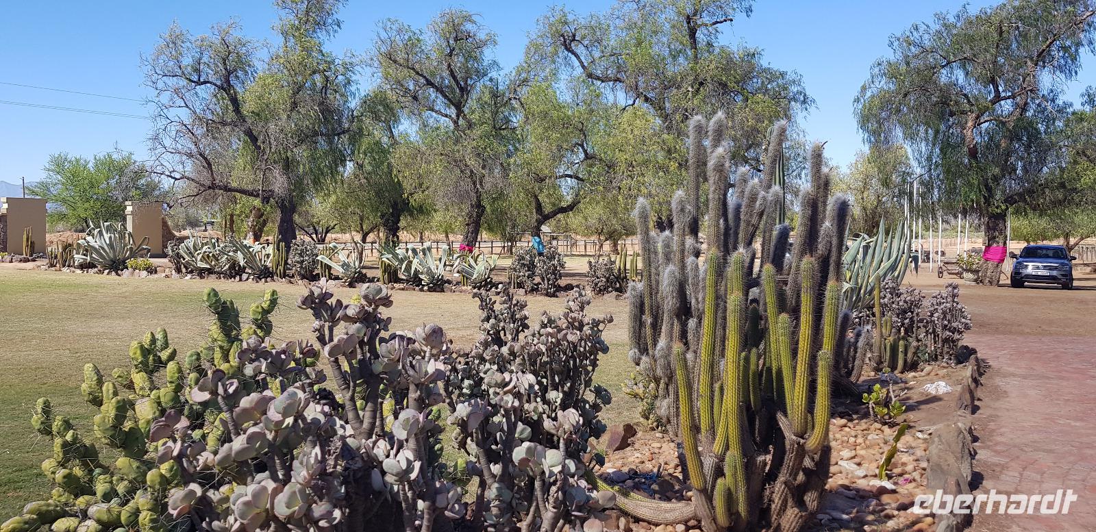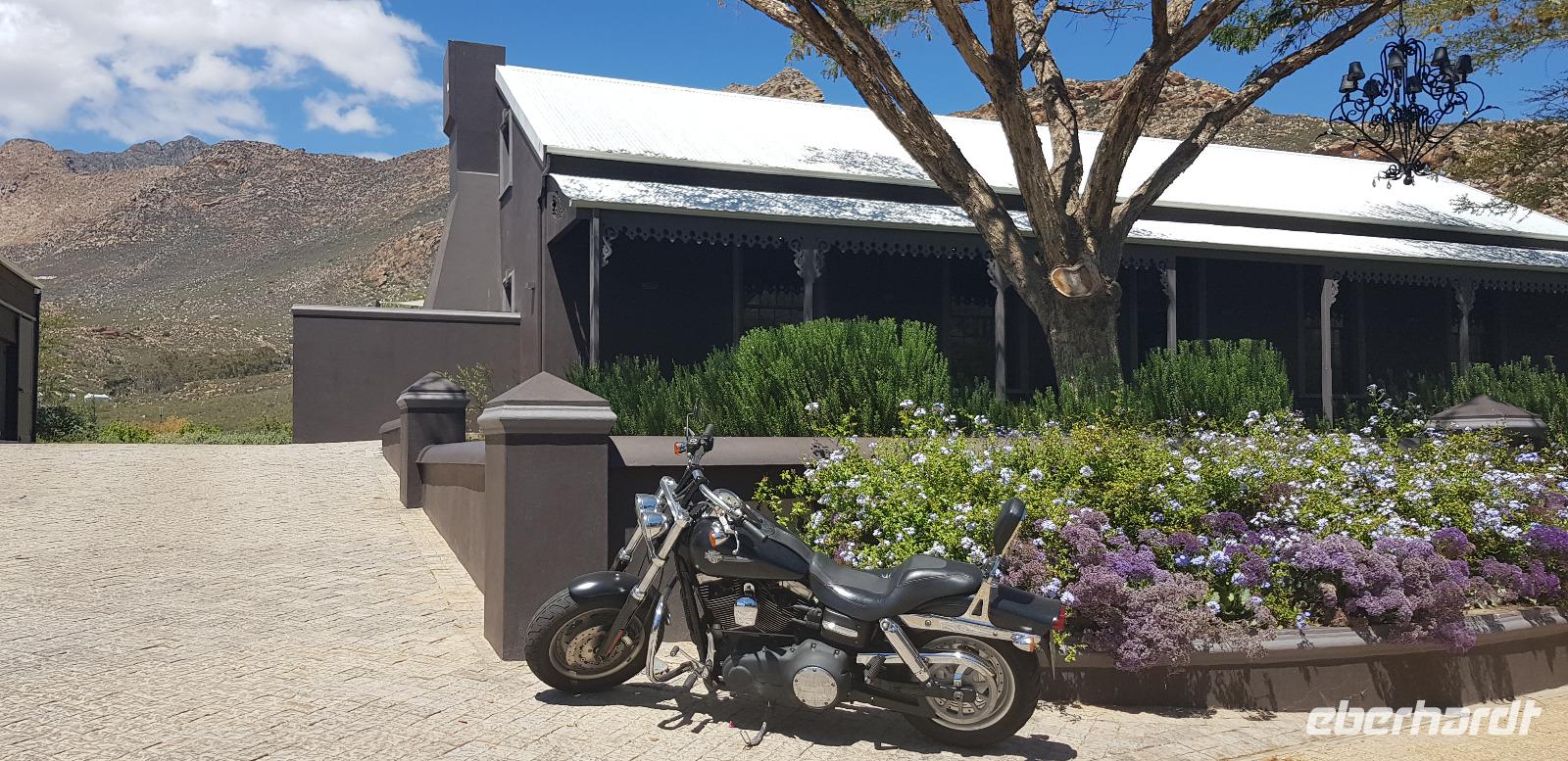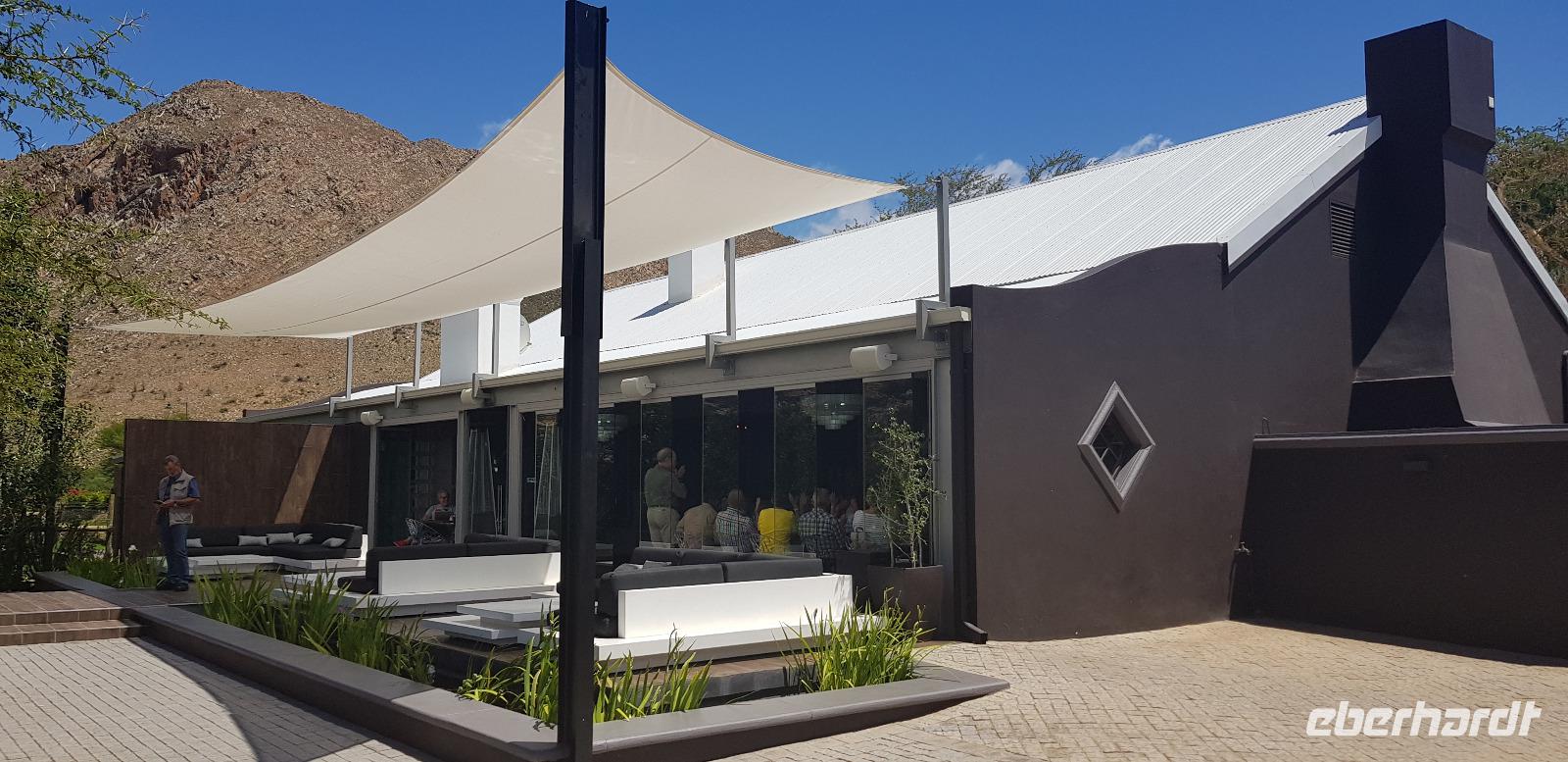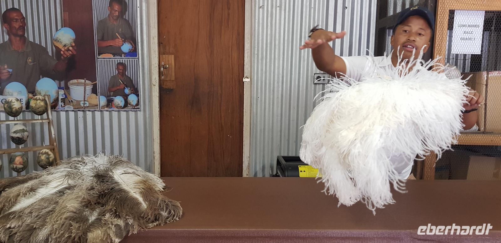 Unterwegs besuchen wir ein kleines Weinlokal, wo wir für unsere Eberhardt-Gruppe noch eine spontane Weinverkostung organisiert haben. Aufgrund des Flugausfalls am ersten Tag, fehlt uns diese noch im Südafrika-Programm. Im schicken Ambiente der „Blue Vines" Vinery, genießen wir also die edlen Tropfen. Andrea übersetzt und erklärt alle wissenswerten Infos und zum Schluss darf ein Besuch der schicken Toiletten nicht fehlen. Weiter geht es etwa 2 Stunden zu einer Straußenfarm in der Ortschaft Outshorn. Nach einem reichhaltigen 3 Gängen Mittagessen werden wir von einem örtlichen deutschsprachigen Guide über die Farm geführt. Mit sehr viel Freude und Humor wird uns alles über das Leben der Strauße erklärt. Zum Schluss dürfen wir die prachtvollen Tiere sogar füttern.