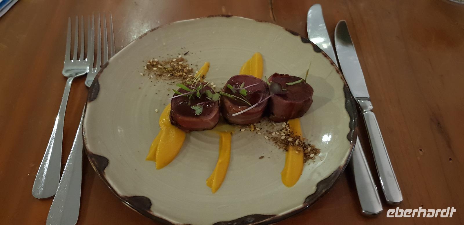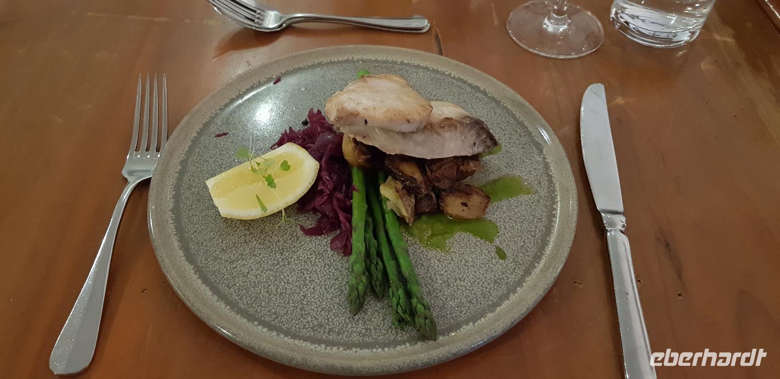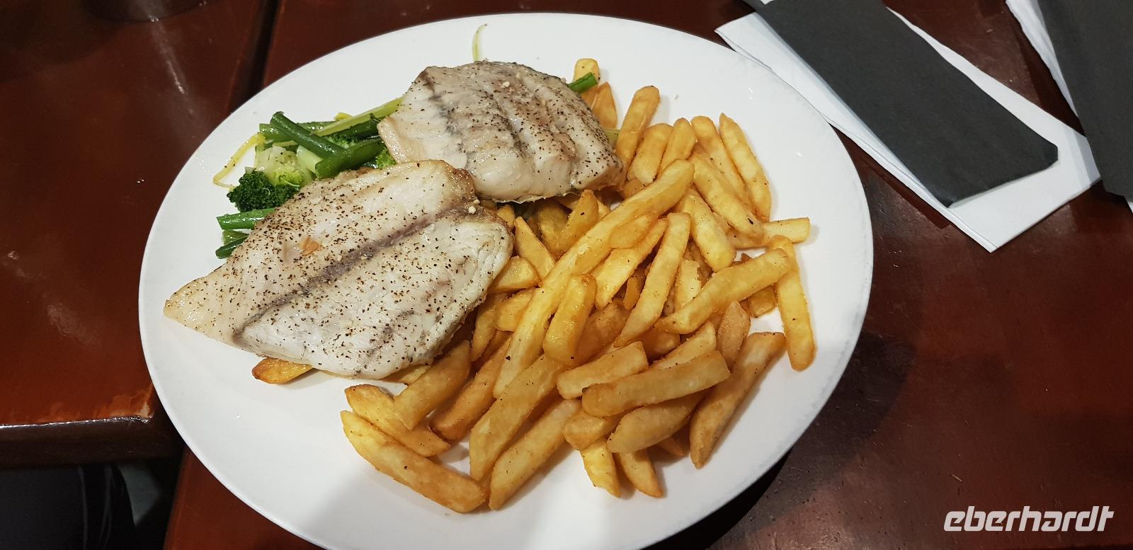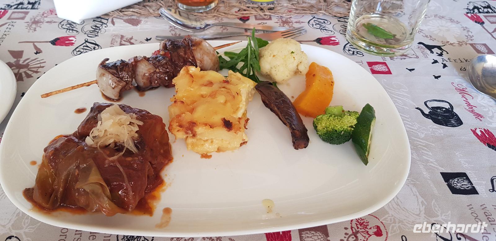 Es gibt ein schmackhaftes 3 Gänge Menü zur Wahl. Die meisten von uns entscheiden sich für frischen Fisch. Nach dem Essen lassen wir den Abend gemütlich bei einem Glas Wein ausklingen und freuen uns schon auf den nächsten Tag.